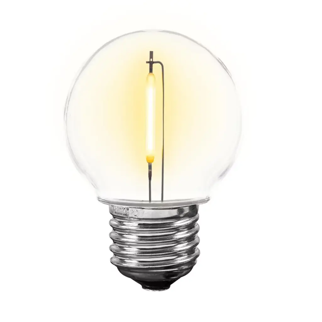 Introducing the new LED Dual Filament Filament G50 Globe Bulb with an E26 medium base. This energy-efficient bulb delivers bright, uniform lighting with a sleek, modern design, perfect for decorative and accent lighting in any space. Featuring a single filament for a vintage-inspired look, it offers long-lasting performance while consuming minimal energy. This versatile LED bulb provides a warm, inviting glow that is sure to enhance any environment. No need to change your medium base patio string to take advtage of the elegant globe bulb look offering a stylish, contemporary touch.