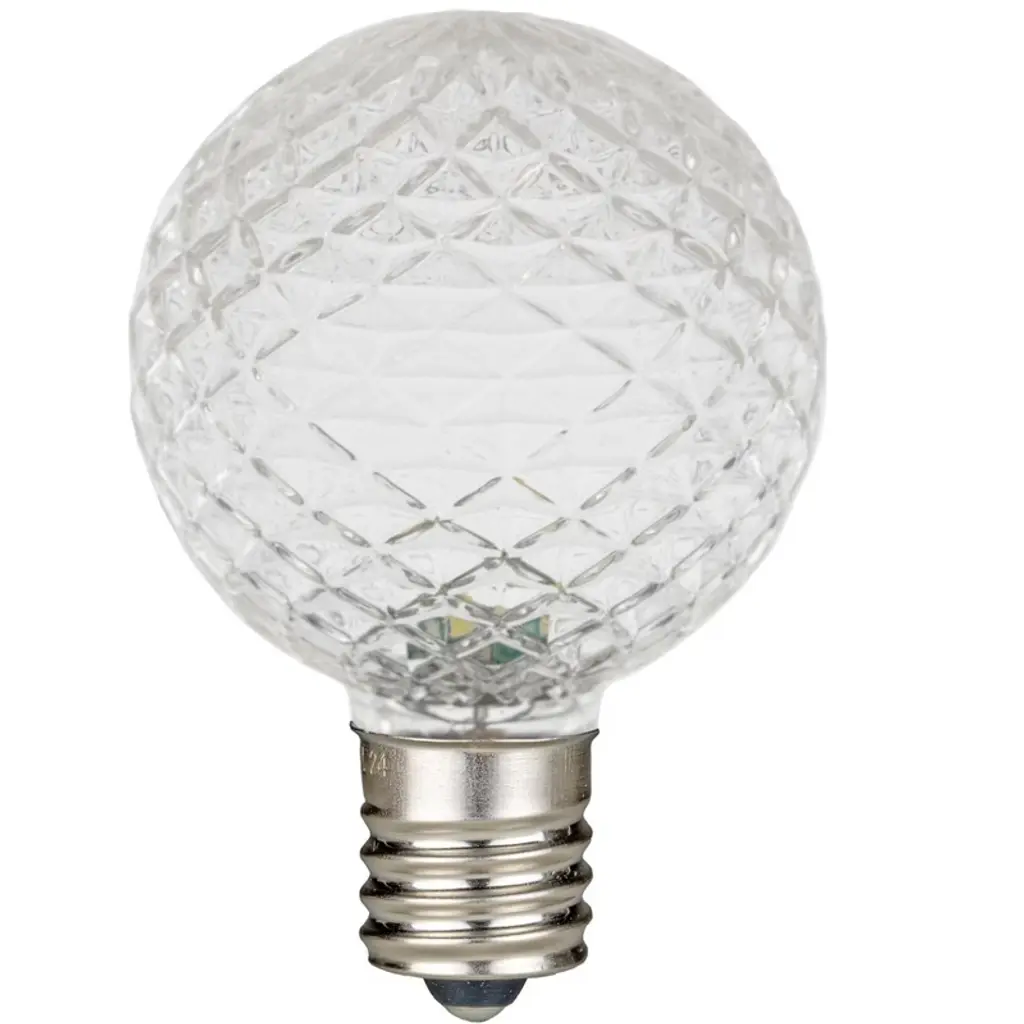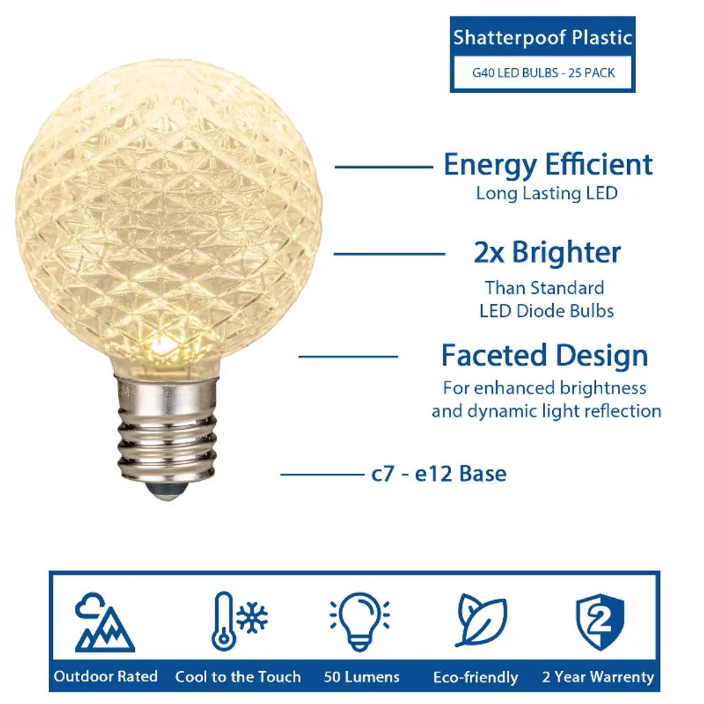 A sleek and stylish lighting solution designed to elevate any space. With their unique diamond-cut design, this energy-efficient LED bulb delivers bright, crisp illumination while adding a touch of elegance. Perfect for any indoor or outdoor settings, it combines our most popular holiday season bulb with a year round aesthetic and long-lasting performance. These led bulbs are shatterproof plastic and are the most durable and energy efficient G40 LED bulbs. Illuminate your world with the Diamond Faceted G40 LED Bulb!