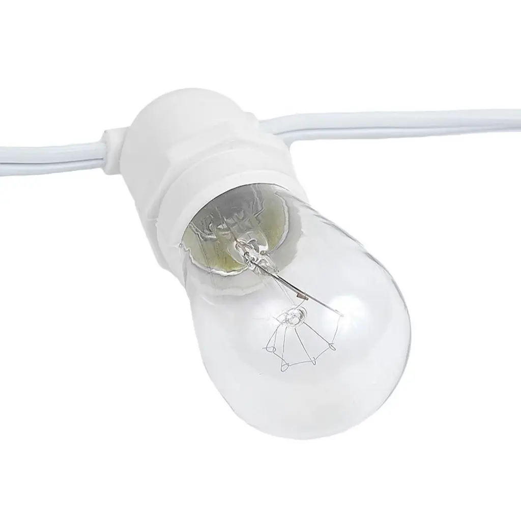 Novelty Lights clear S14 medium base bulbs string light set with 50 bulbs on 100' of commerical grade white wire. These are our most durable string light sets and are suitable for year round outdoor use and permanent lighting applications. Each set includes 50 S14 medium base bulbs on a commerical grade white wire stringer with 50 sockets that are spaced 24" apart. These clear S14 light strings have long-lasting 6,000 hour bulbs and are on a heavy duty 16 gauge SPT-2 white wire stringer. Each socket is made with PVC plastic to provide a water-tight seal and to ensure no defects due to weather. These durable and heavy duty light strings will provide you with years of maintenance free use. Perfect to use on any patio, restaurant, backyard, pergola, wedding venue, or town square for hanging outdoor string lights.