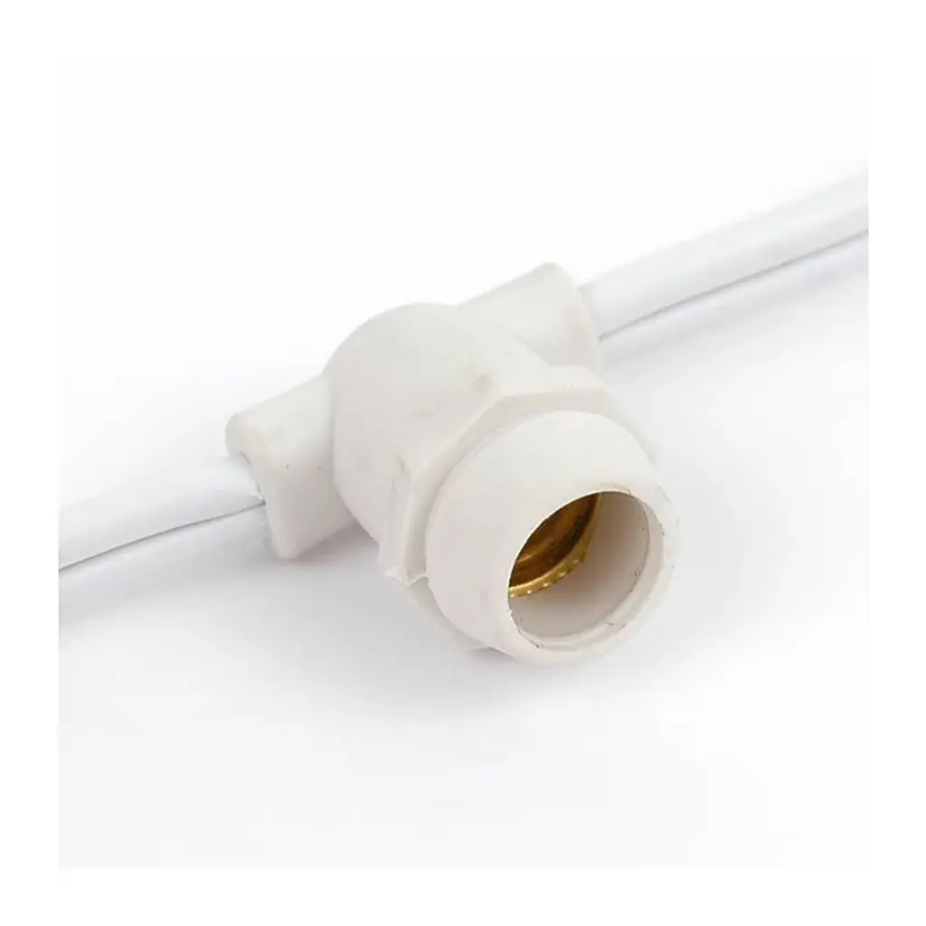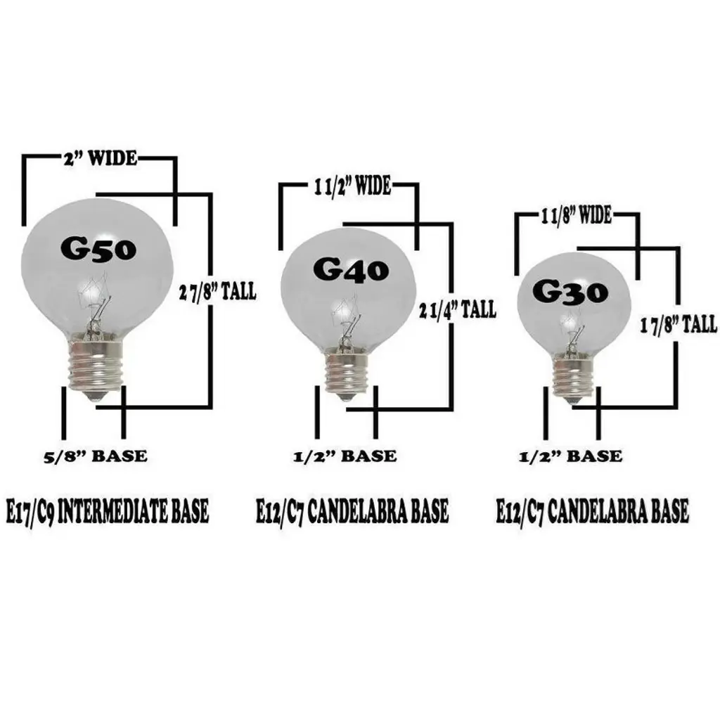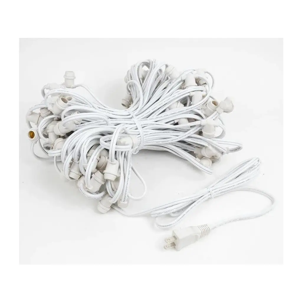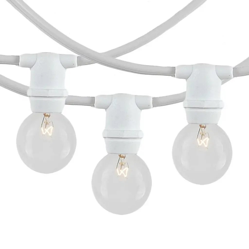 Novelty Lights G30 candelabra base bulbs string light set with 100 bulbs on 100' of commerical grade SPT-2 16 AWG wire. These are our most durable string light sets and are suitable for year round outdoor use and permanent lighting applications. Each set includes 100 G30 candelabra base bulbs on a commerical grade wire stringer with 100 sockets that are spaced 12" apart. These G30 light strings have long-lasting bulbs and are on a heavy duty 16 gauge SPT-2 wire stringer. Each socket is made with PVC plastic to provide a water-tight seal and to ensure no defects due to weather. These durable and heavy duty light strings will provide you with years of maintenance free use. Perfect to use on any patio, restaurant, backyard, pergola, wedding venue, or town square for hanging outdoor string lights.