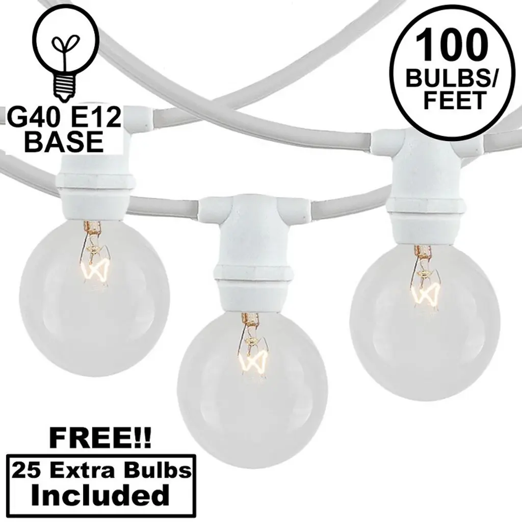Novelty Lights Clear Incandescent Globe Outdoor String Lights With 100 Bulbs G40 Vintage Bulbs White Wire 100 Feet