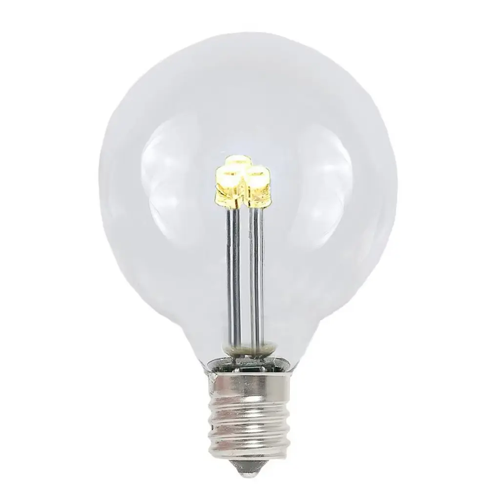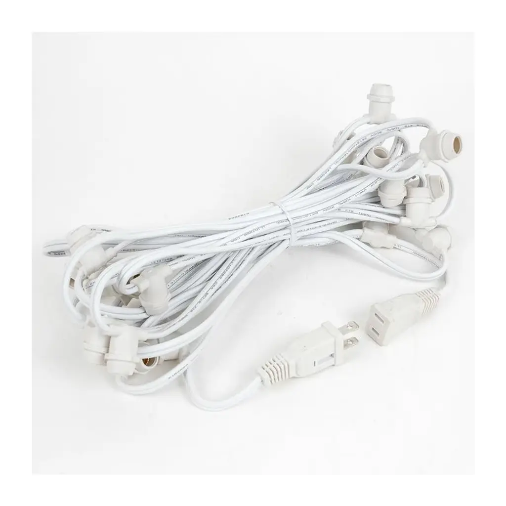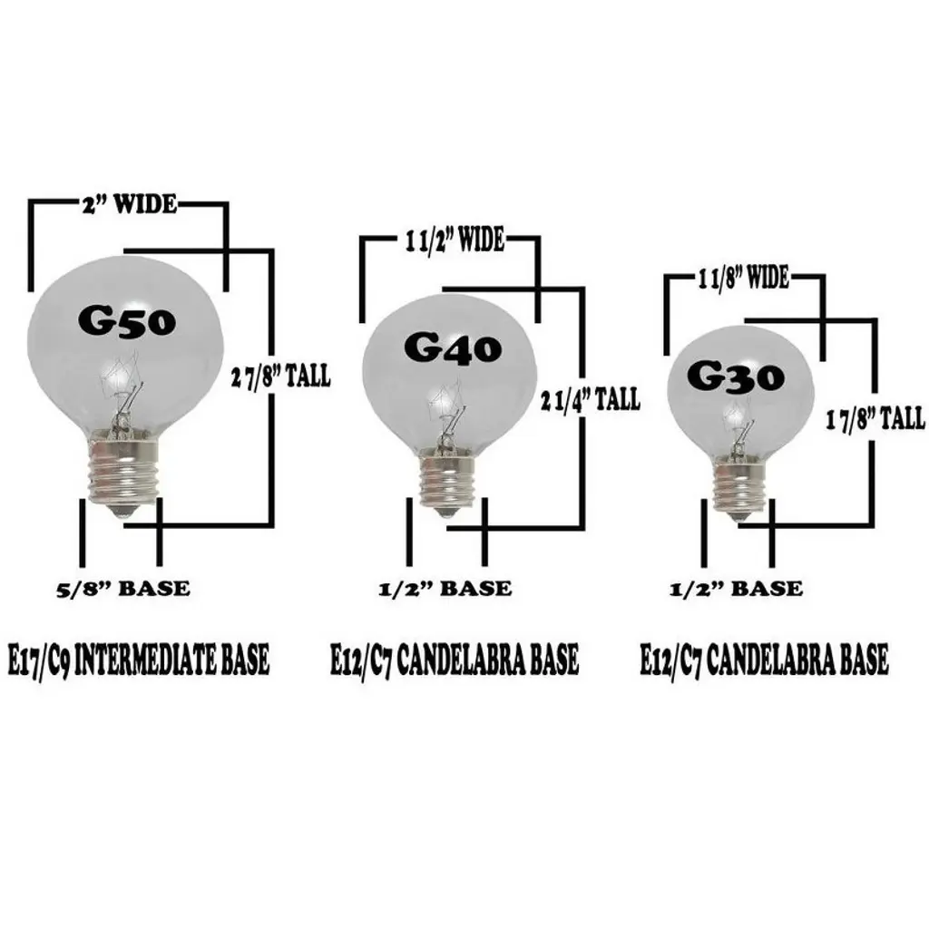 Novelty Lights G30 candelabra base bulbs string light set with 25 bulbs on 25' of commerical grade SPT-2 16 AWG wire. These are our most durable string light sets and are suitable for year round outdoor use and permanent lighting applications. Each set includes 25 G30 candelabra base bulbs on a commerical grade wire stringer with 25 sockets that are spaced 12" apart. These G30 light strings have long-lasting bulbs and are on a heavy duty 16 gauge SPT-2 wire stringer. Each socket is made with PVC plastic to provide a water-tight seal and to ensure no defects due to weather. These durable and heavy duty light strings will provide you with years of maintenance free use. Perfect to use on any patio, restaurant, backyard, pergola, wedding venue, or town square for hanging outdoor string lights.