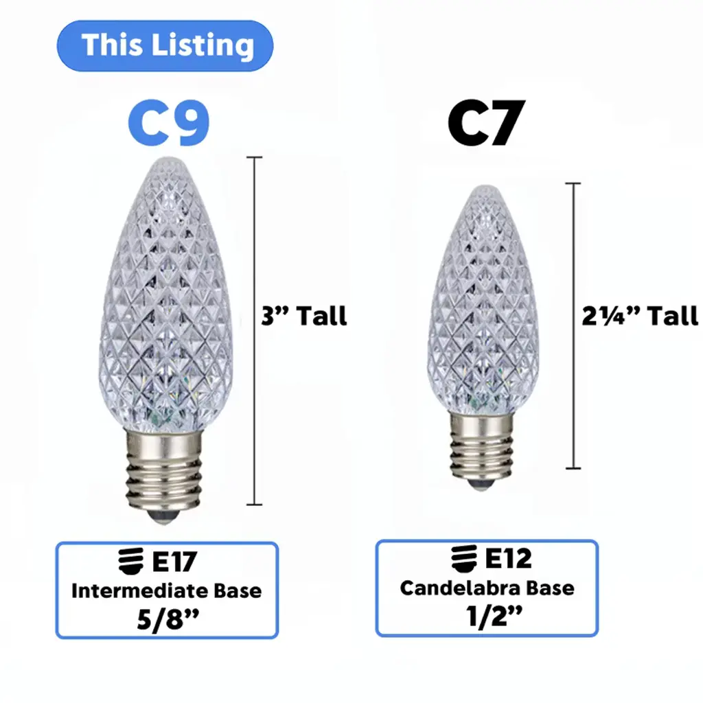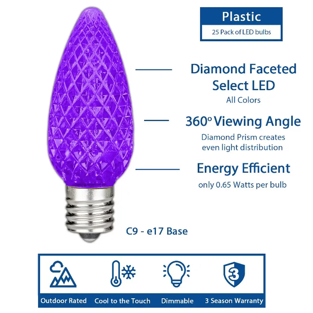 Novelty Lights NL SELECT Diamond Faceted C9 Retrofit Bulbs utilize bright SMD LED's creating vivid and festive light displays. NL SELECT C9 Retrofit bulbs utilize an ultra durable polystyrene plastic shell providing resistance to chips, fading and cracking. All of our LED C9's are energy efficient using only 0.65 Watts and 0.005 Amps with built in dimming capability, perfect for animated displays. Built to last with a 2 season warranty or 1 year permanent use, our NL SELECT C9 Diamond Faceted LED bulbs will provide years of quality use. Perfect for seasoned Christmas light installers, yet easy for anyone to decorate roof lines, trees, buildings, walkways and porches.