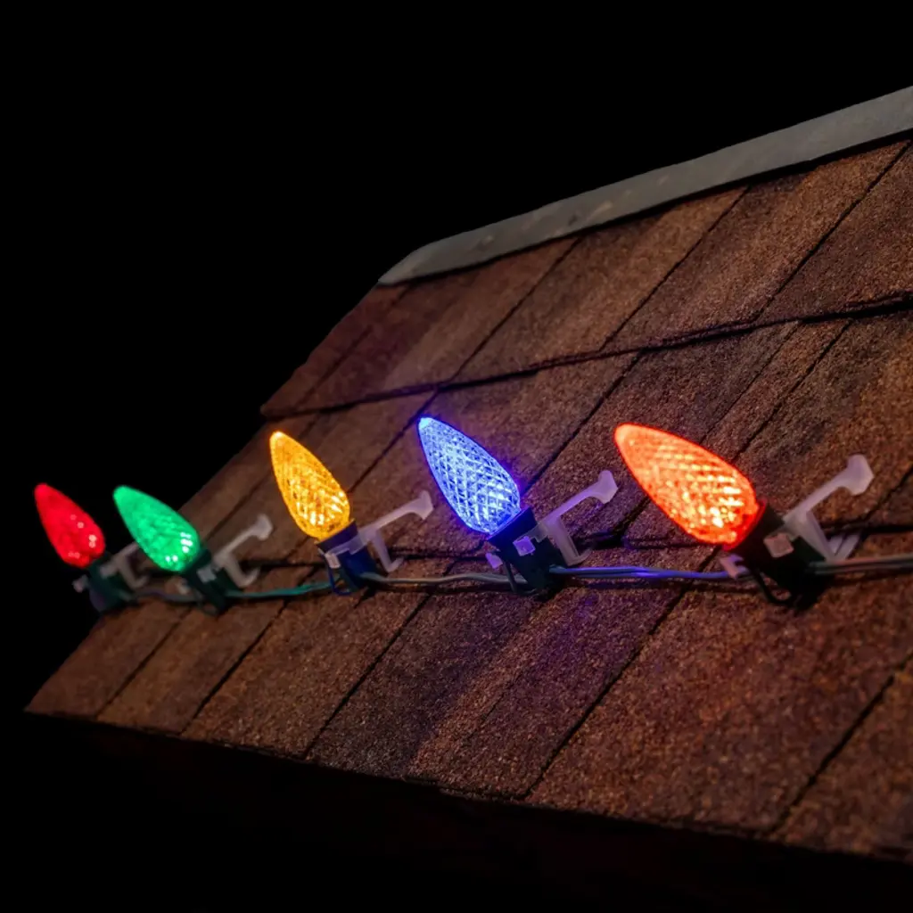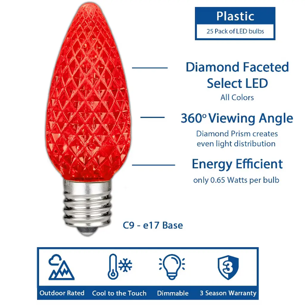 Novelty Lights NL SELECT Diamond Faceted C9 Retrofit Bulbs utilize bright SMD LED's creating vivid and festive light displays. NL SELECT C9 Retrofit bulbs utilize an ultra durable polystyrene plastic shell providing resistance to chips, fading and cracking. All of our LED C9's are energy efficient using only 0.65 Watts and 0.005 Amps with built in dimming capability, perfect for animated displays. Built to last with a 2 season warranty or 1 year permanent use, our NL SELECT C9 Diamond Faceted LED bulbs will provide years of quality use. Perfect for seasoned Christmas light installers, yet easy for anyone to decorate roof lines, trees, buildings, walkways and porches.