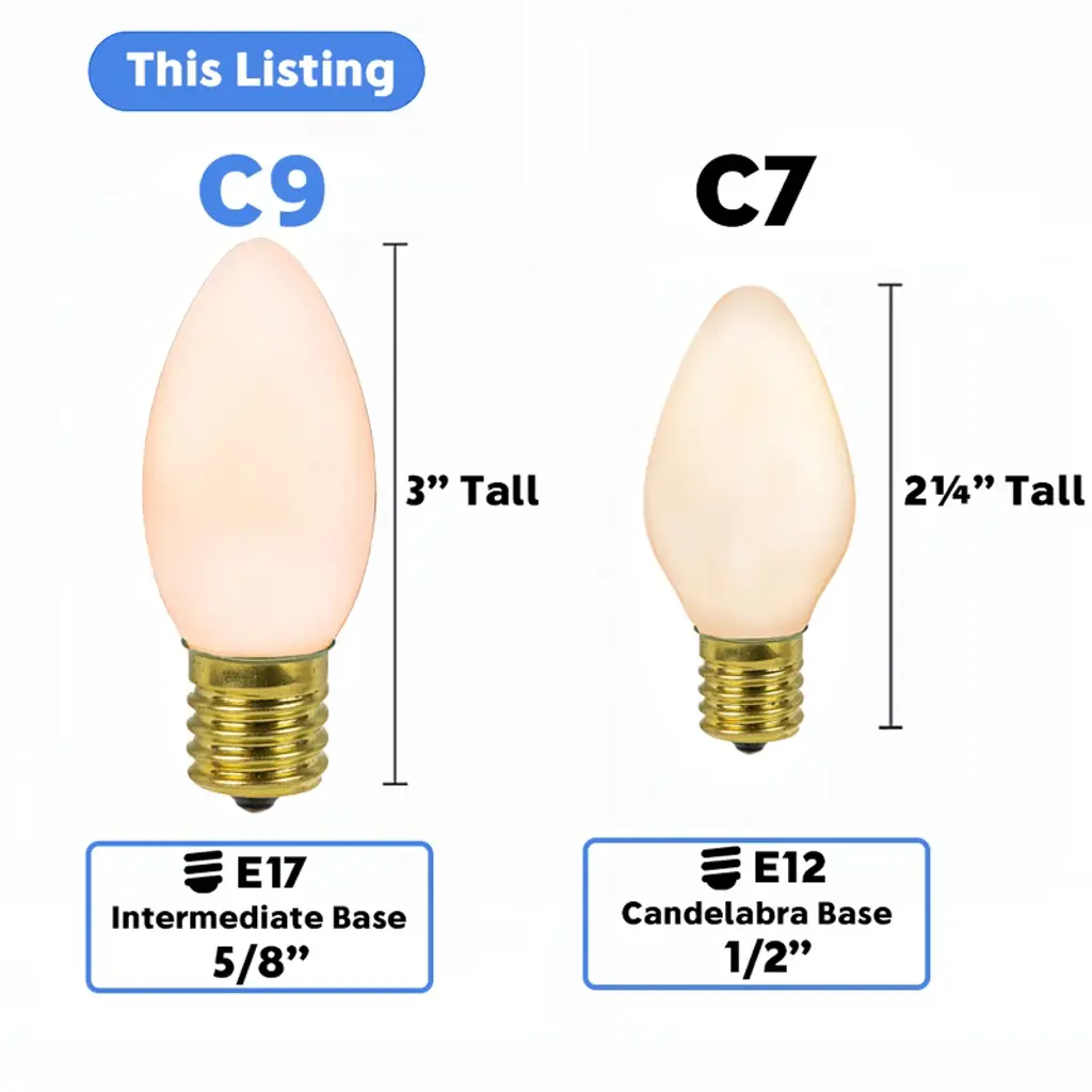 Transform your home or outdoor space with our vintage RetroGlo LED Bulbs, where classic nostalgia meets modern efficiency. Designed to evoke the warmth of vintage holiday lights, these bulbs offer a stunning glow that adds a festive touch to any festive light display. Available in a variety of rich colors, from warm white to bold reds and greens and pastels, perfect for holiday decor or year-round ambiance. Enjoy the brilliance without the high energy bills! These LED bulbs consume up to 90% less energy than traditional incandescent bulbs, helping you save while you shine. Built to withstand the elements, our C9 RetroGlo bulbs are perfect for indoor and outdoor use. The retro design captures the essence of yesteryear, creating a cozy, inviting atmosphere that’s perfect for gatherings, celebrations, or just everyday life. Light up your world and create unforgettable memories with these enchanting bulbs!