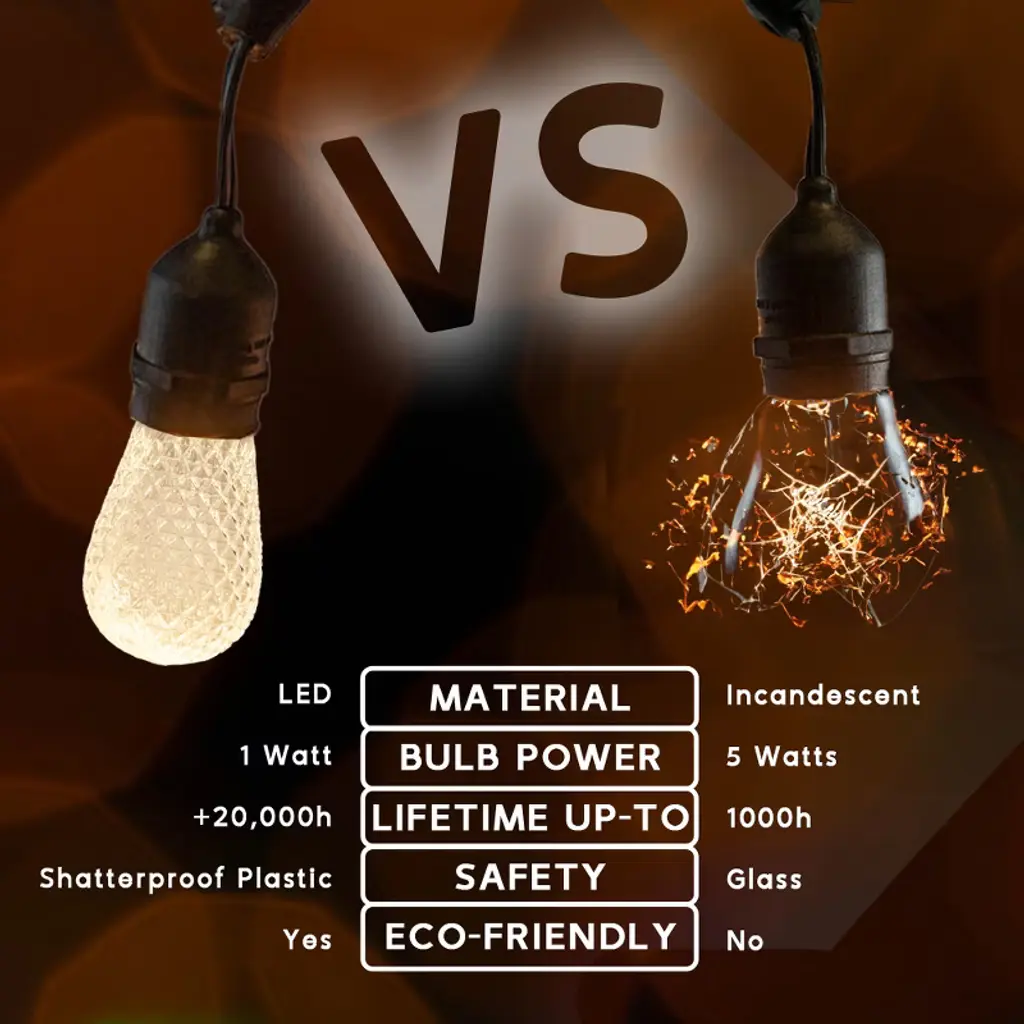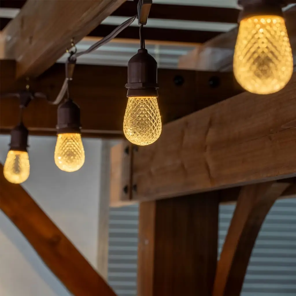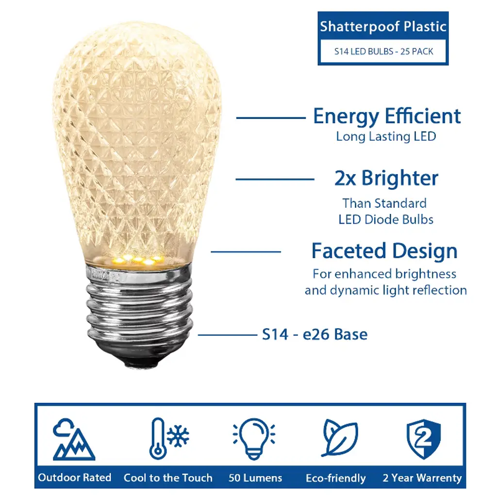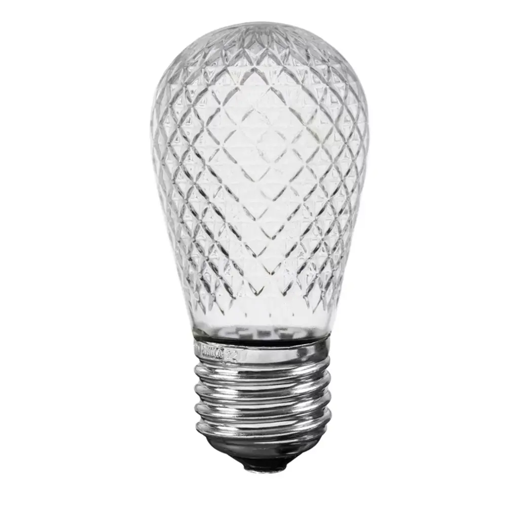 A sleek and stylish lighting solution designed to elevate any space. With their unique diamond-cut design, this energy-efficient LED bulb delivers bright, crisp illumination while adding a touch of elegance. Perfect for any indoor or outdoor settings, it combines our most popular holiday season bulb with a year round aesthetic and long-lasting performance. These led bulbs are shatterproof plastic and are the most durable and energy efficient S14 LED bulbs. Illuminate your world with the Diamond Faceted S14 LED Bulb.