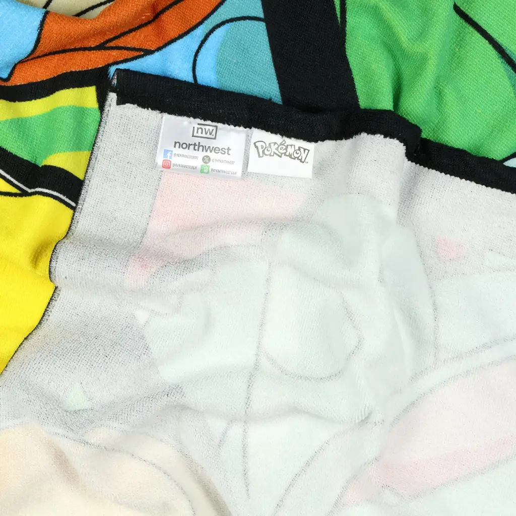 Bring a Pokémon adventure to the beach or pool with this colorful towel featuring four beloved Pokémon in a layered stripe design. At the top, Charmander stands with his arms wide, flashing a cheerful smile against a purple stripe background. Below, Squirtle and Pikachu add playful energy—Pikachu faces away but turns his head with a grin, while Squirtle reaches forward in surprise against a green stripe background. At the bottom, Bulbasaur completes the lineup, smiling against a red stripe background. Soft, lightweight, and absorbent, this vibrant towel is ideal for Pokémon fans