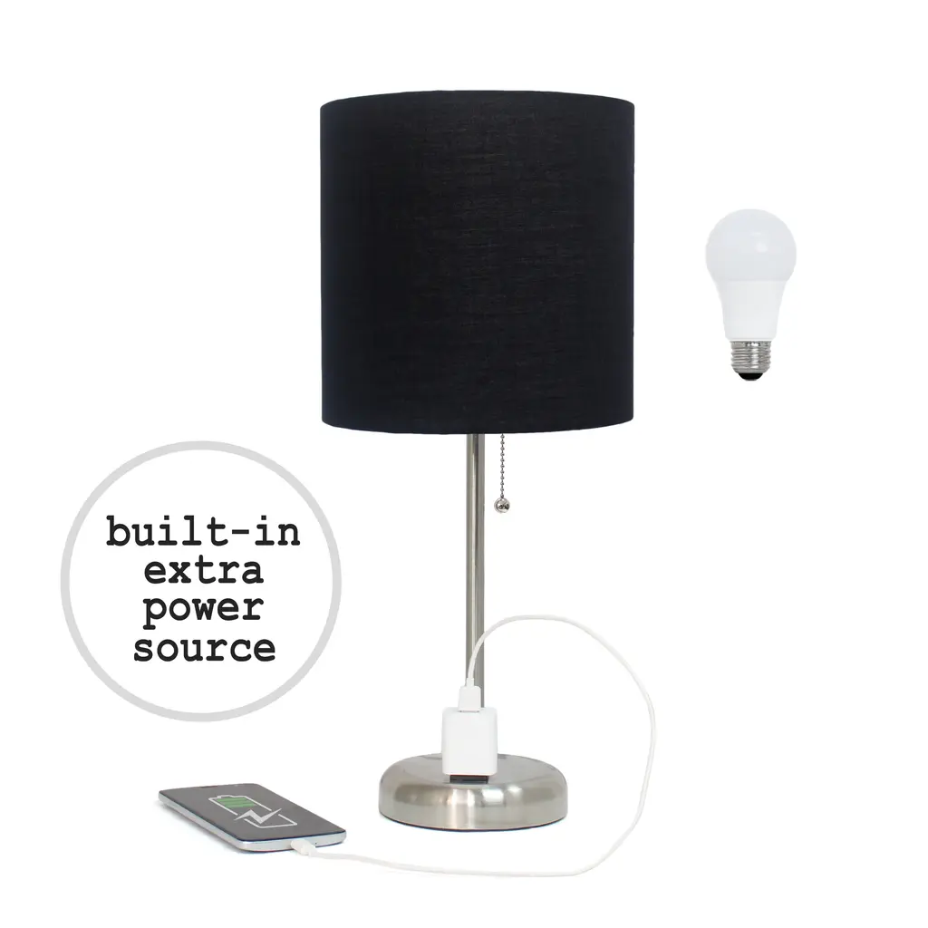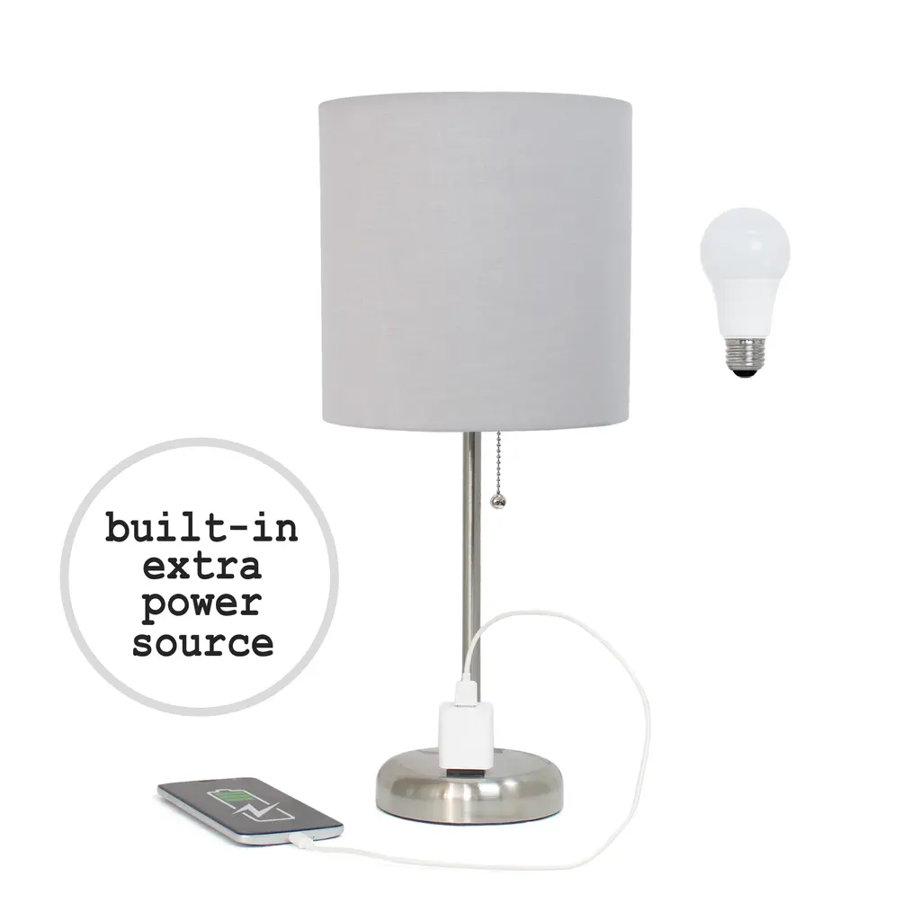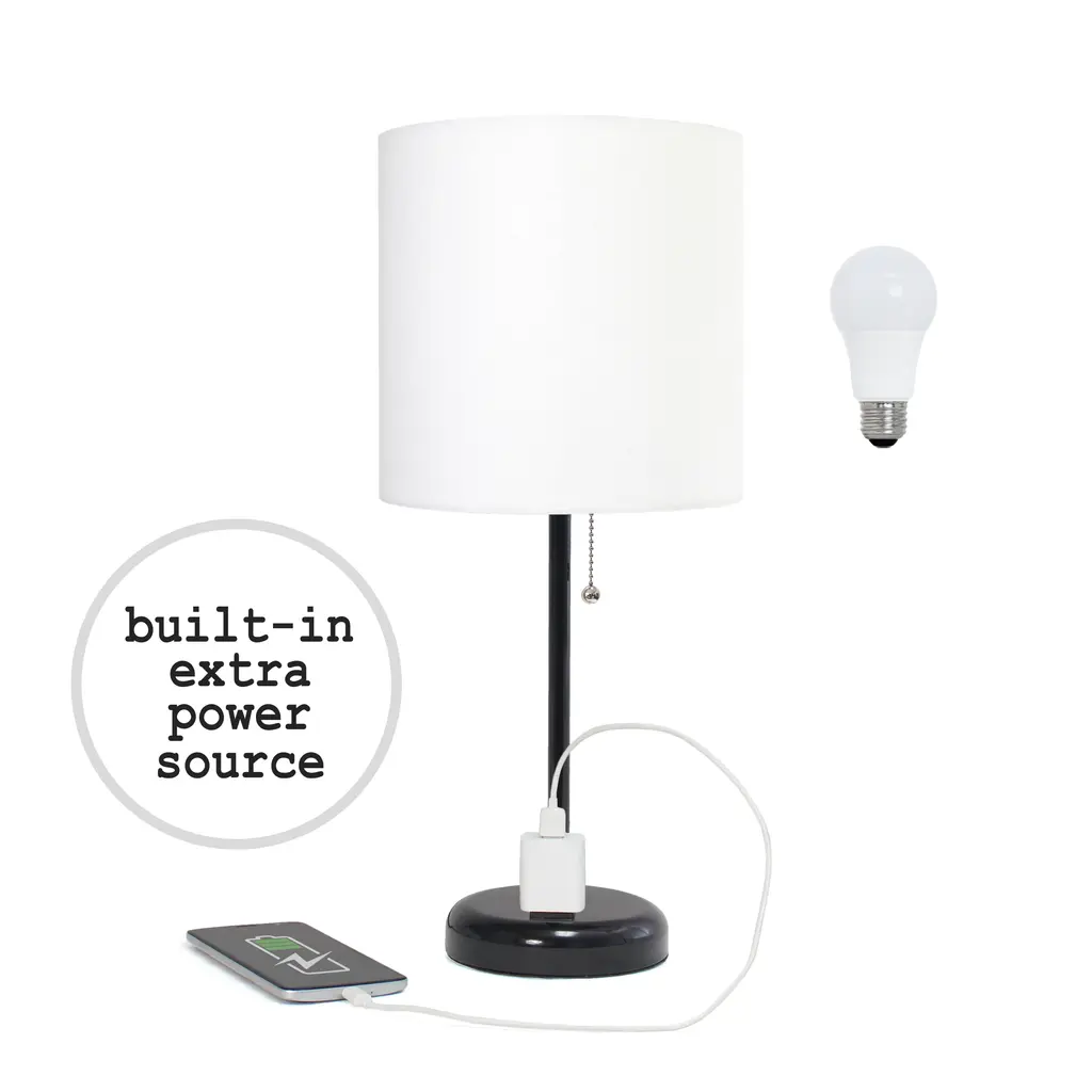 Bring function and fashion to any tabletop in your home with this modern table lamp. Equipped with the required LED bulb, the gold metal base showcases an open silhouette complemented by a white fabric drum shade. Perfect size for any room in your home! Illuminate your living room, bedroom, kids and teen rooms, college dorm, apartment, nursery, or offices with this modern table lamp with contemporary flair!Features: