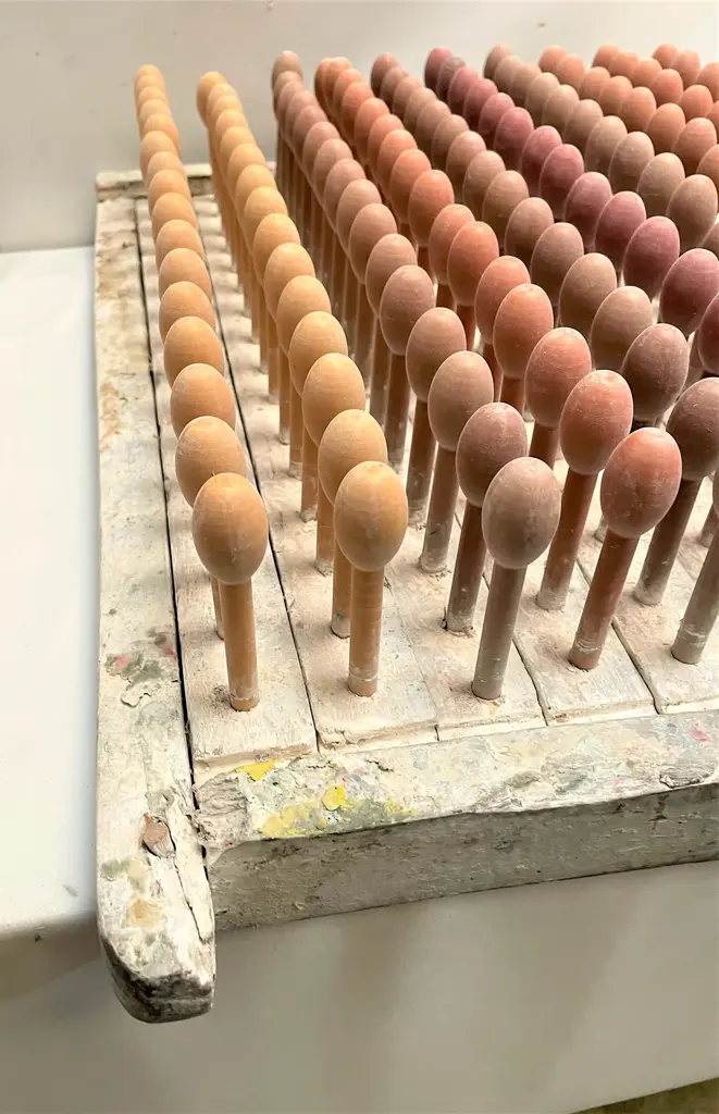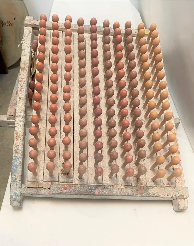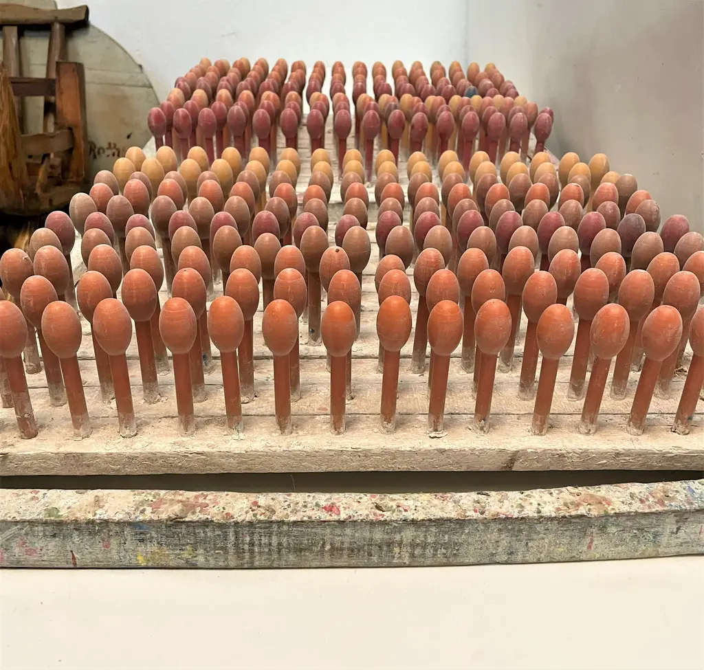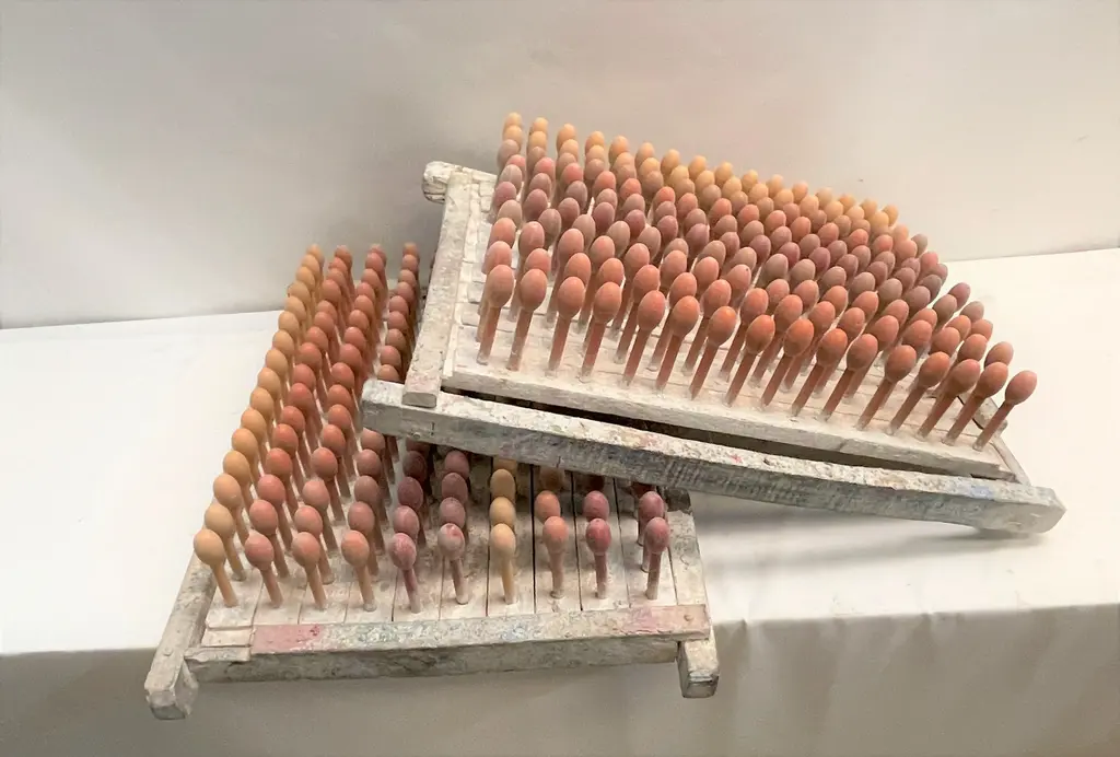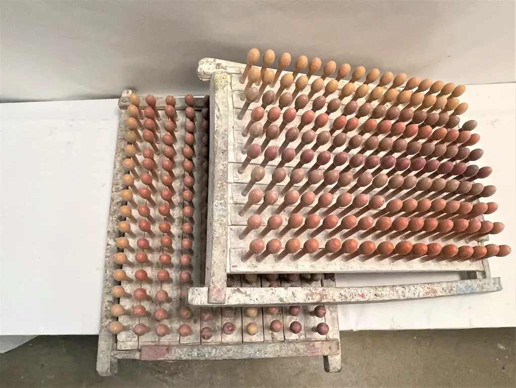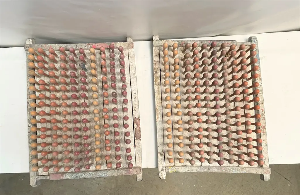 Unique wall art - Industrial factory salvage used to create extraordinary texture and a timeless look. The balloon molds make for some unique wall art and are a great size. Use as a stand-alone or together into groupings of other similar-sized wall hangings. Molds are multiple shades of red. Manufacturing of balloons took place by coating spindle pegs with powder, then dipping into hot latex and baking. Once dried the balloon was peeled off. 17 x 5 x24