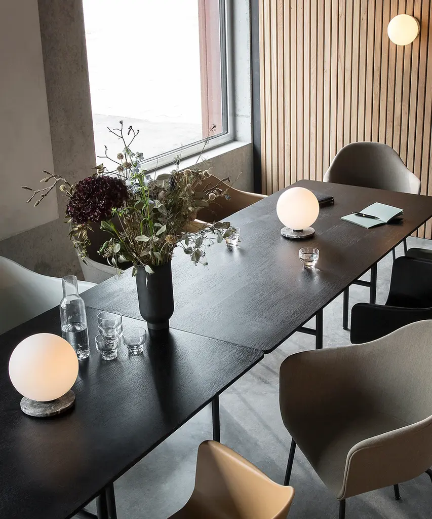 Inspired by a growing population of explorers, movers and nomads, the TR series was designed to easily transition from city apartment to country home and everywhere in between.The TR Table/Wall Lamp features the TR bulb, made from opal glass and complete with simple screw feature designed for easy install. The dimmable LED bulb provides soft and glare-free light, and its spherical shape hides the lamp fitting. The lamp is supported by a weighty and beautiful grey marble base, and sits atop a thin powder-coated metal neck.Designed by Tim Rundle for Danish design company Audo Copenhagen.