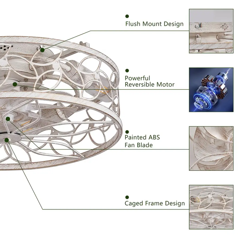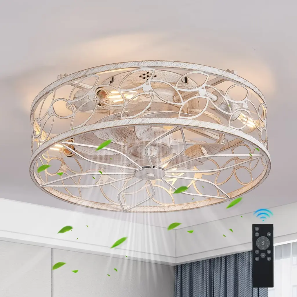 Xinghanzhenxuan White Vintage Caged Ceiling Fan Light, Remote Control, Industrial Style For Living Room, Bedroom, And Kitchen (Bulb Not Included)