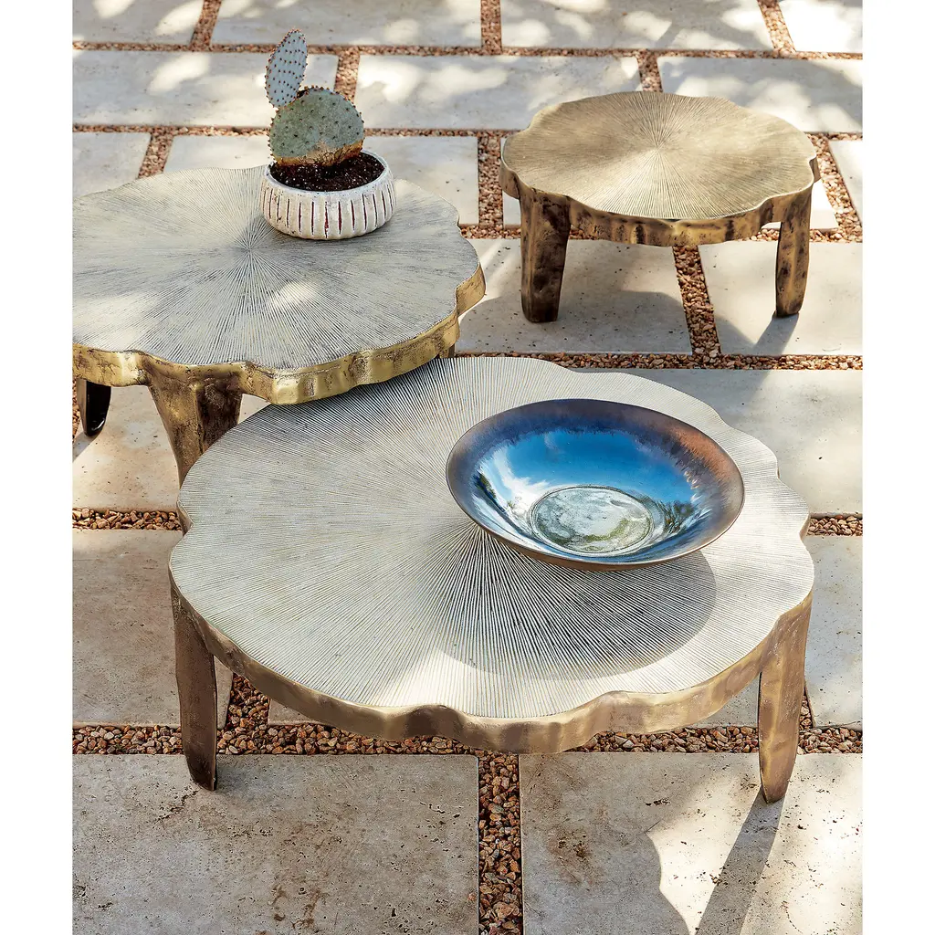 Three cast aluminum tables nestle in or drift out to create an organic resting place for drinks, books and greens. Each piece surfaces its own unique finishes and patterns, all done by hand. CB2 exclusive.
