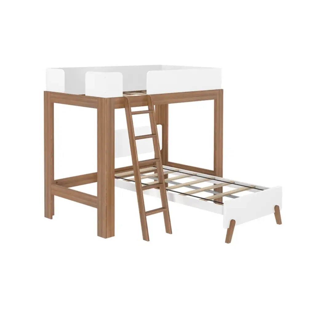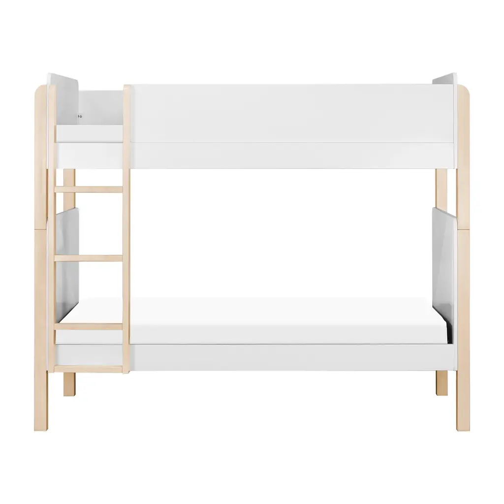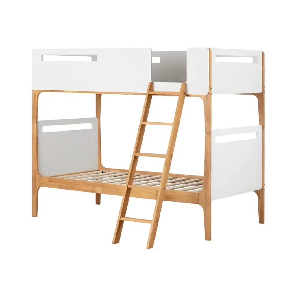 Update your little one's sleep space with this mid-century-inspired bunk bed. The clean-lined frame is crafted from solid pine wood, and it's finished with a two-tone white melamine and natural wood grain, creating a contemporary look. A built-in angled ladder on the side makes it easy to access the top bunk, while guard rails offer an added layer of safety. We love how this piece can be separated into a twin loft bed and a full-size sleeper bed with stylish tapered feet to accommodate your ever-growing kids. Plus, with seven included slats, there's no need for a box spring.