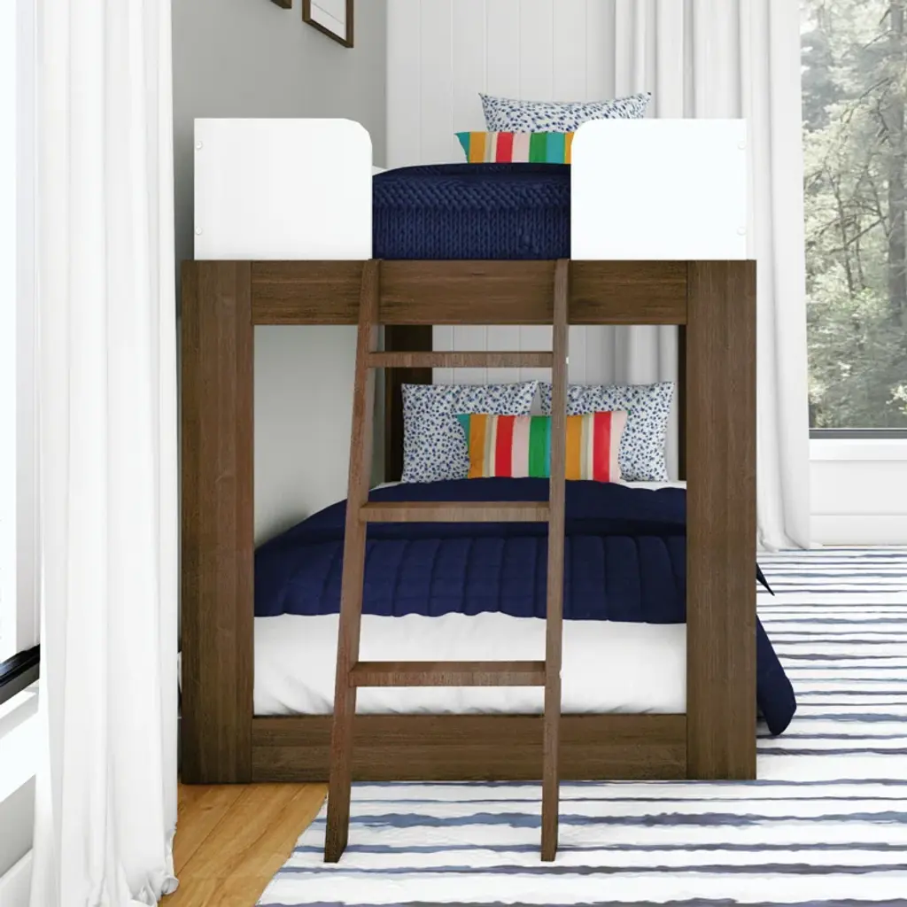 Give your kid's bedroom a modern look while maximizing sleeping space with this twin-over-twin bunk bed. The clean-lined frame is crafted from solid wood, and it has a natural finish that highlights the wood's grain (knots and all). This bed comes with 14" guardrails on the top bunk for extra safety. We love that the built-in ladder can be installed on either the front or end of the bunk for an easy climb. Plus, the top and bottom bunk have under-bed support bars that eliminate the need for a box spring. Mattresses are sold separately.