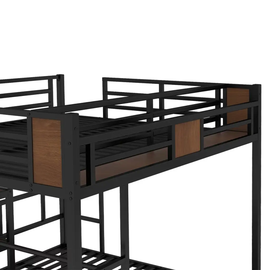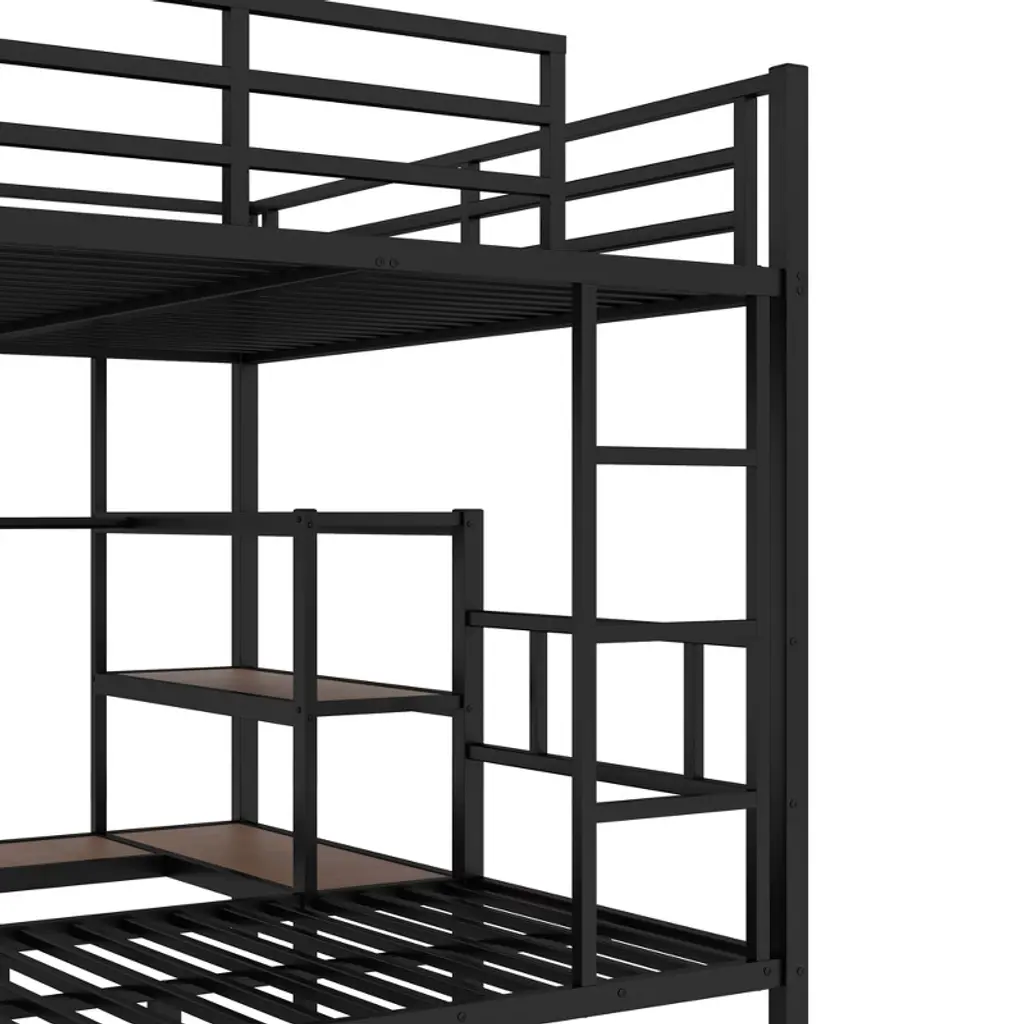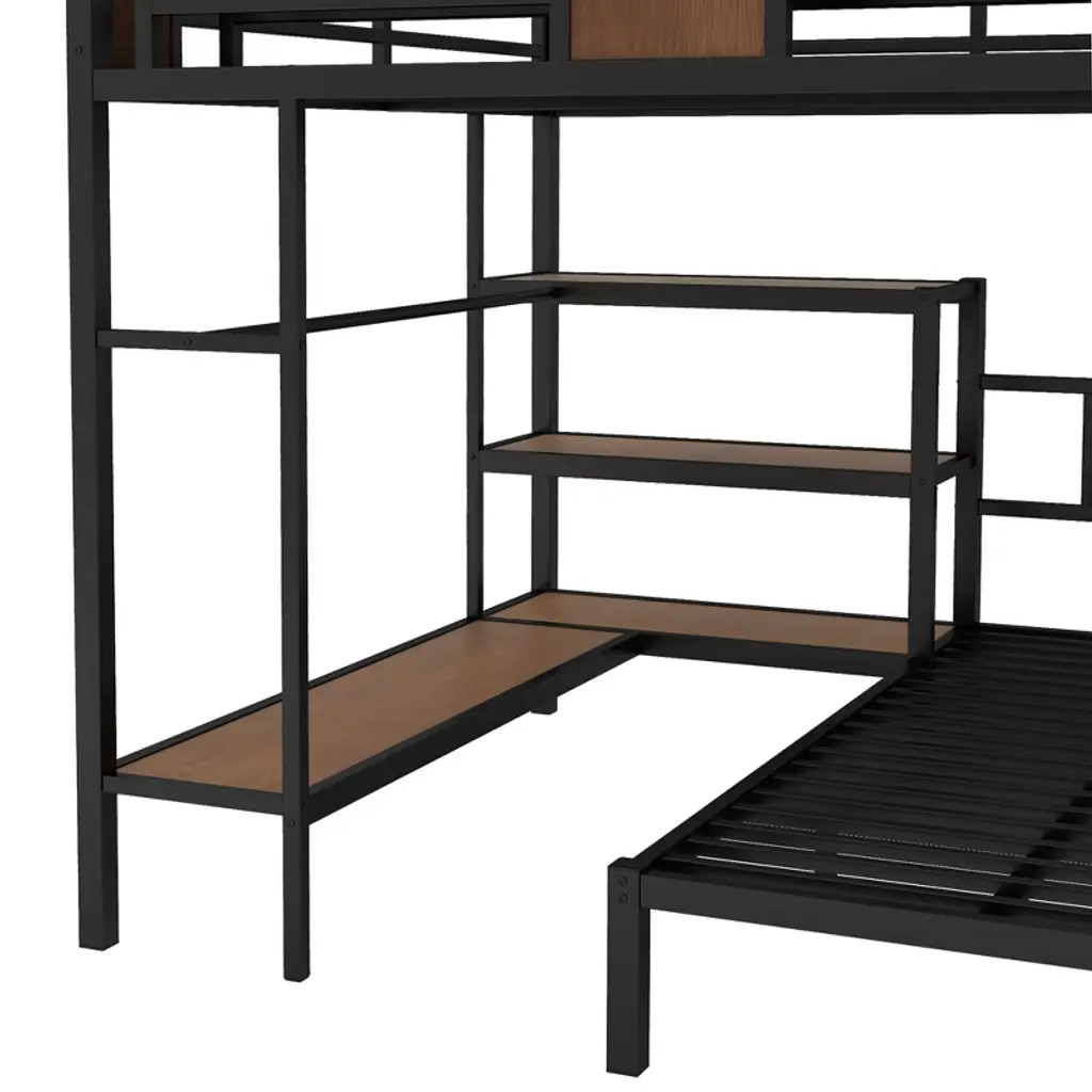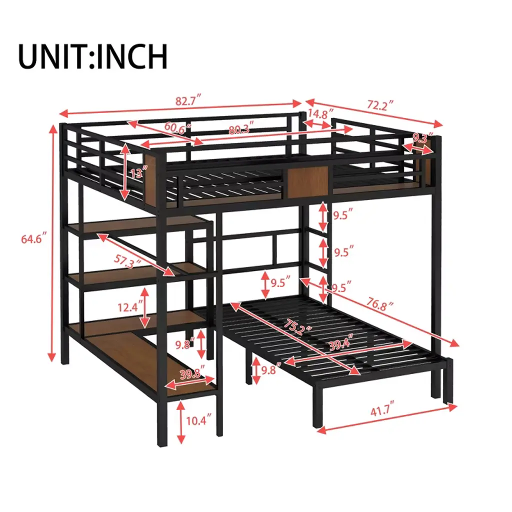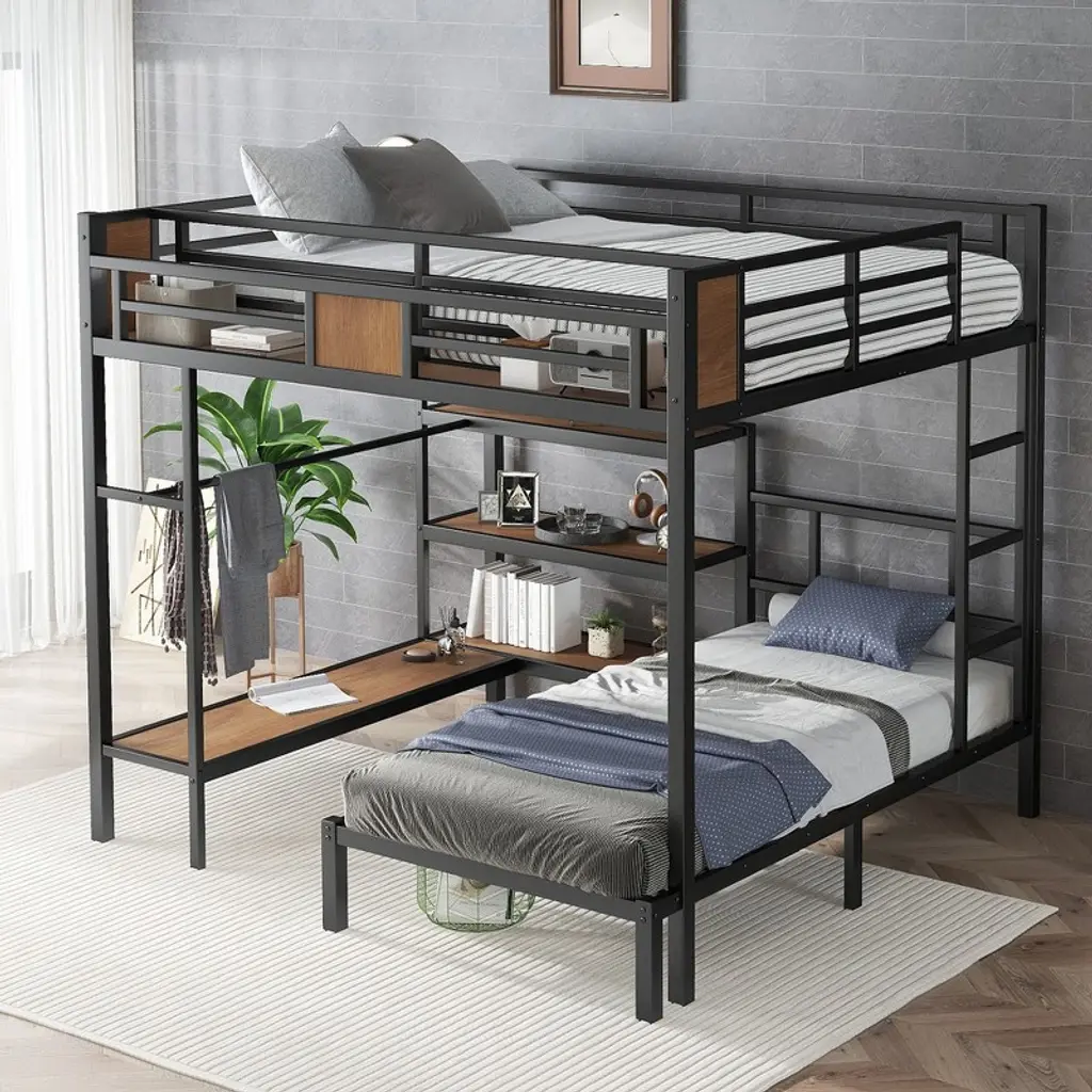 Twin over Queen bunk bed This metal bunk bed with shelves and hangers is an ideal gift for your child! The simple and airy look suits any room style. Our bunk beds are versatile and perfect for apartments, dorms and teen rooms!This product is delivered in two boxes and may not arrive at the same time, please be patient.