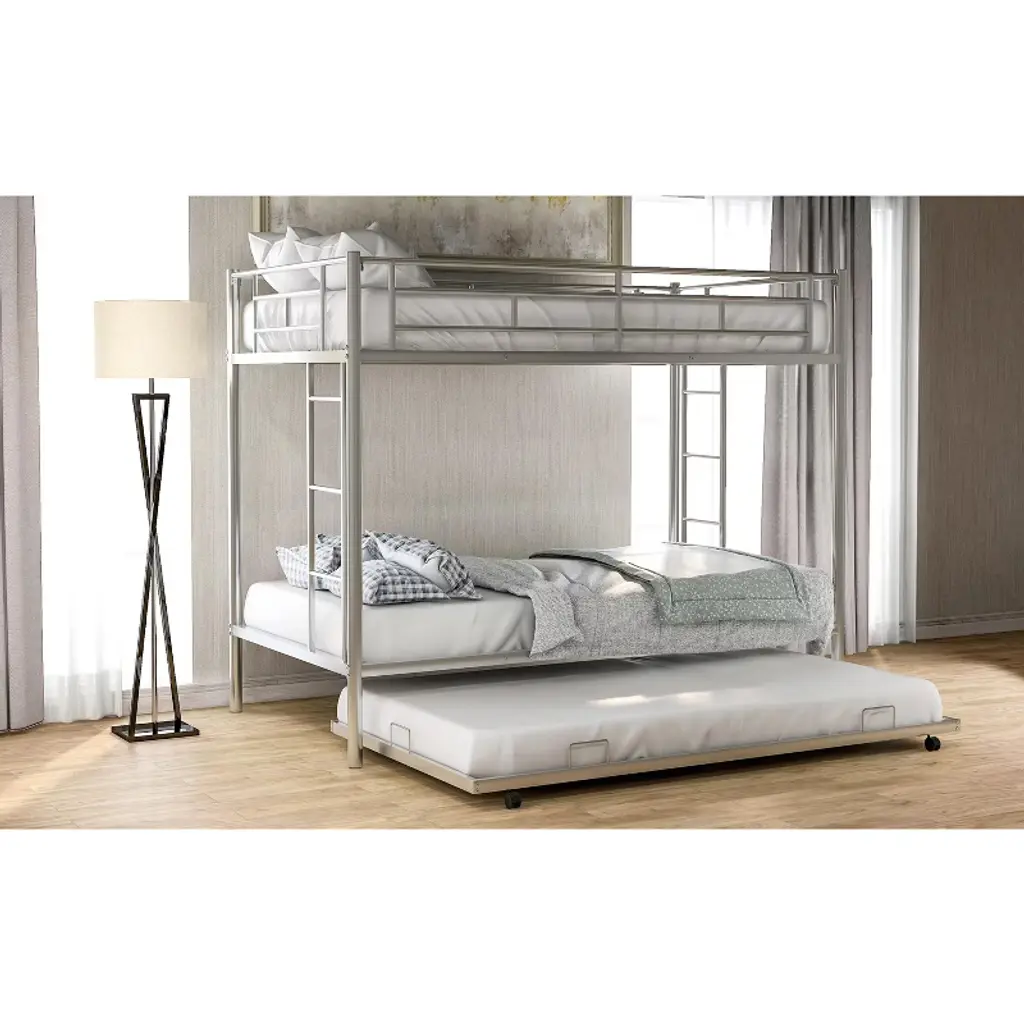 With this bunk bed, saving space is piece of cake. This bed sports durable metal frame, finished in black/ white/ sliver with slatted guardrails that keep top bunk sleepers safe and prevent pillows from falling. This design includes two ladders on each side for easy climbing, while metal support slats remove the need for box springs. The trundle can provide a separate bed. It's suitable for staying with your friends or classmates.