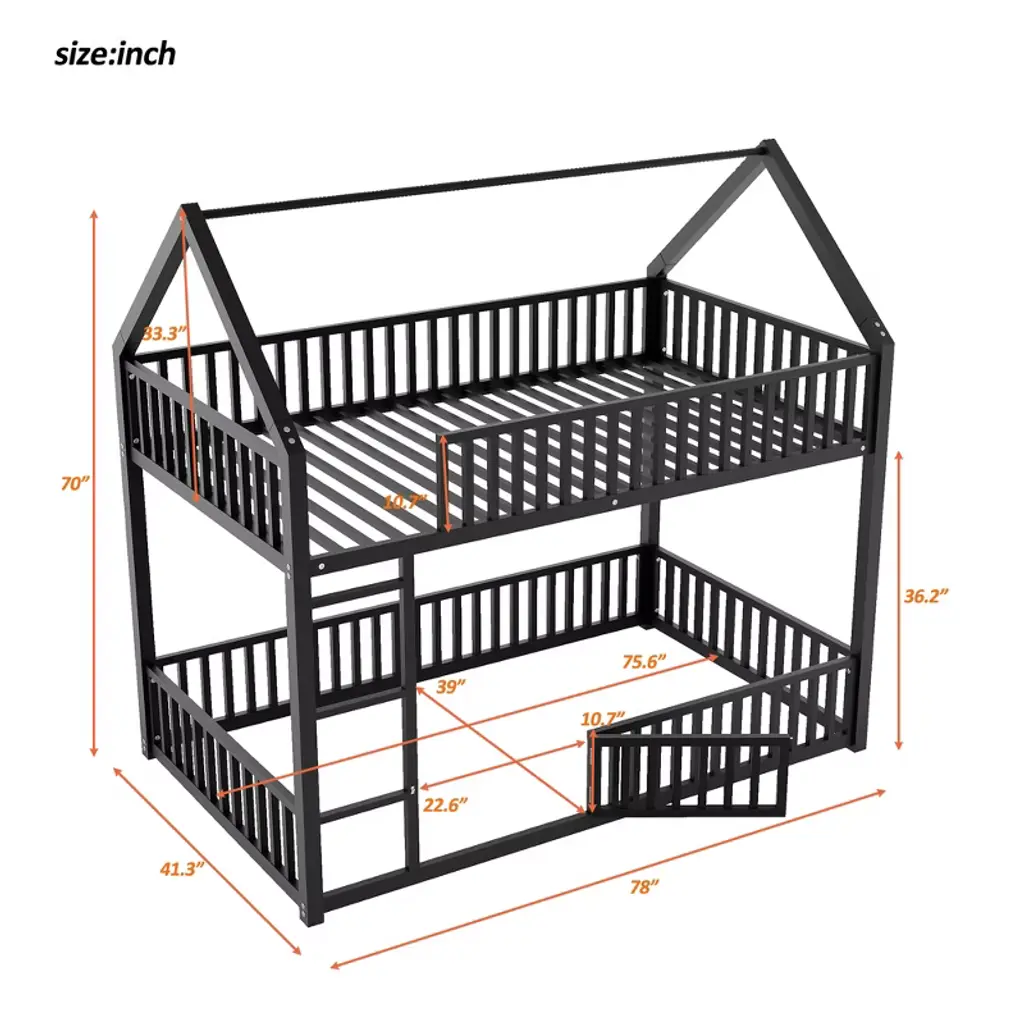 Bellemave Twin Over Twin Metal Floor Bunk Beds, Twin Size House Bunk Beds With Guardrails For Kids, Black
