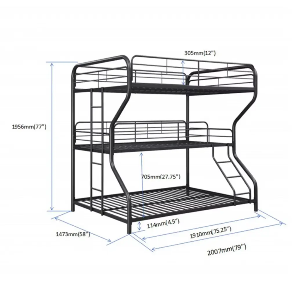 Maximize space with this triple bunk bed, vertically accommodating 3 sleepers while saving 70% floor area. Designed for safety with full-length guardrails and a sturdy metal ladder, it features generous 27-inch spacing between bunks for comfortable sitting. The lightweight yet durable metal frame requires no box spring and assembles quickly with clear instructions—perfect for dorms, rentals, or growing families.
