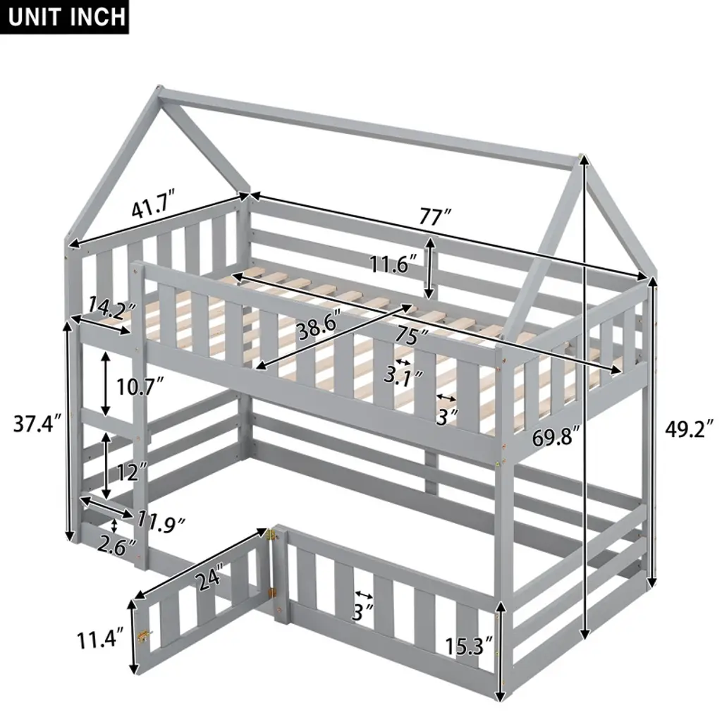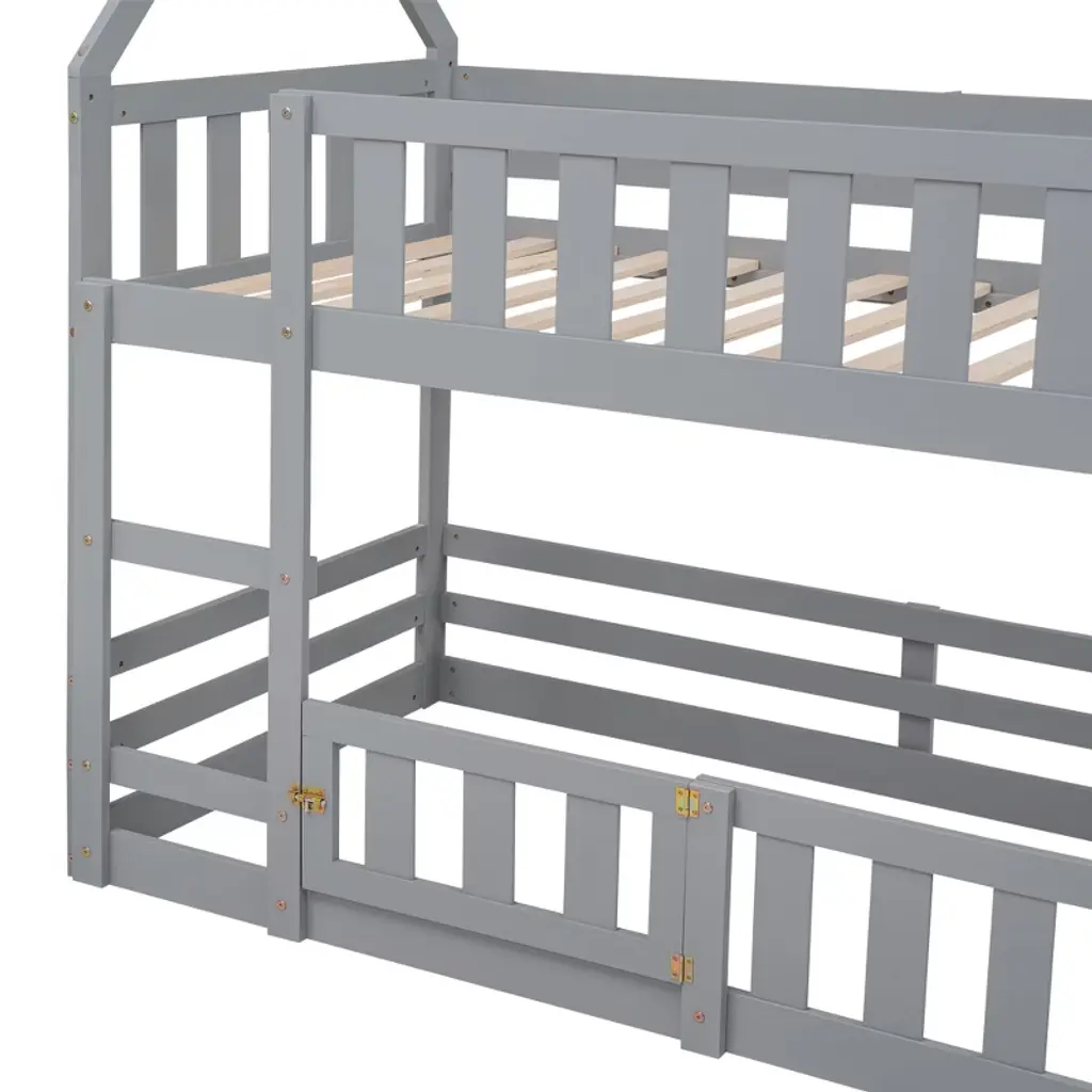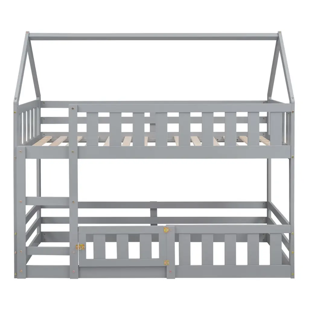 Cavinas Twin Size Bunk Bed House Shaped Wood Bed Frame With Door, Ladder And Guardrail For Bedroom, Gray