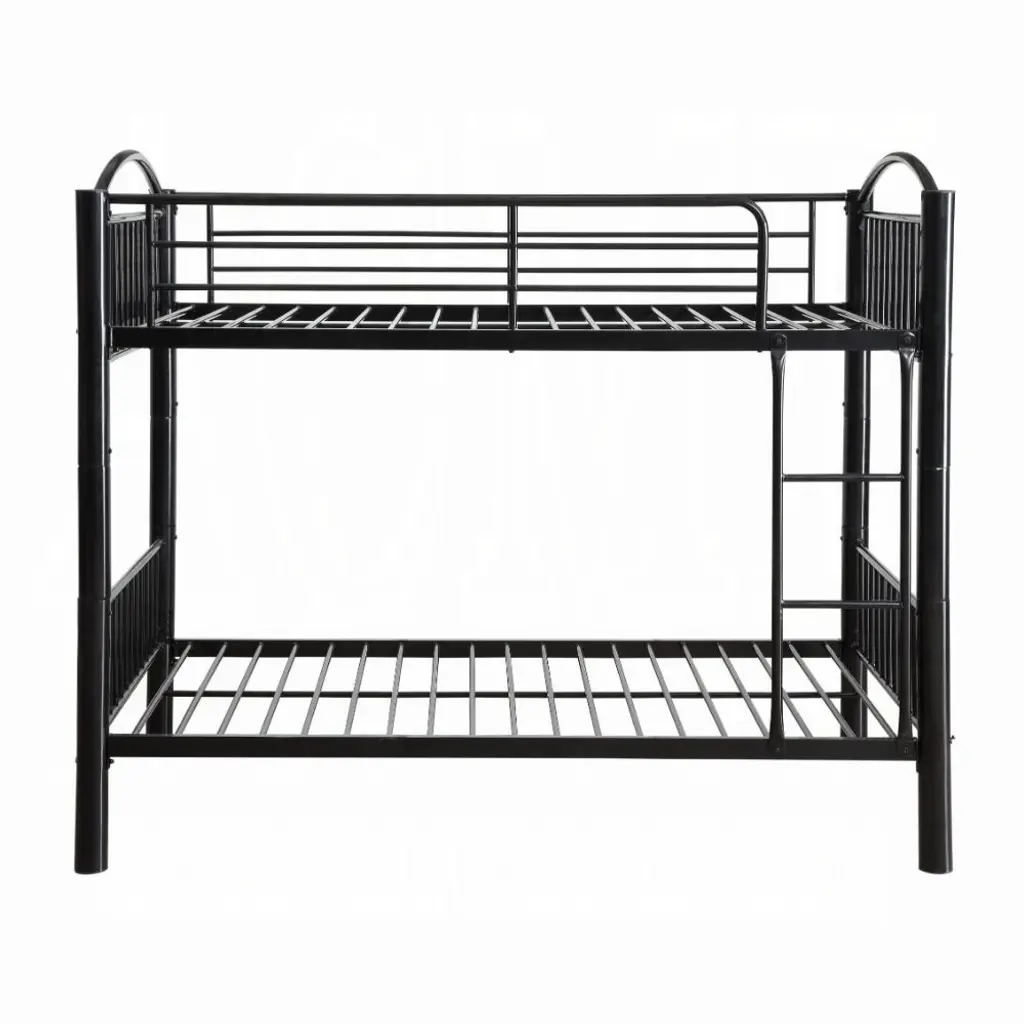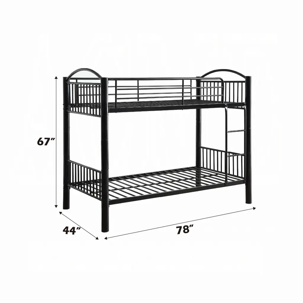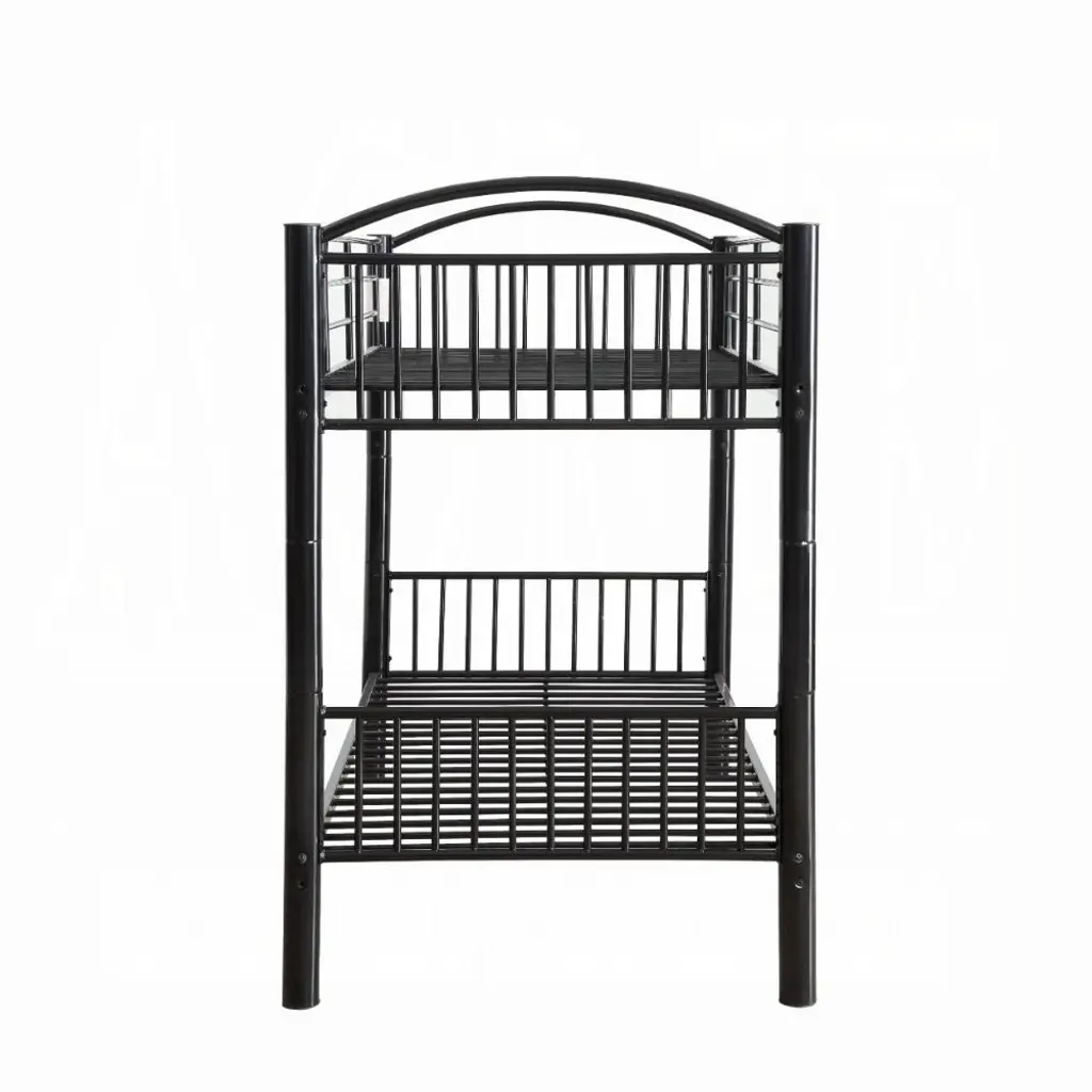 The Cayelynn twin over twin bunk bed is a great way to free up space in a kids bedroom. It is a round metal tube design and features a built in ladder to the upper twin bed that also has a guardrail. This bed is available in black and silver.