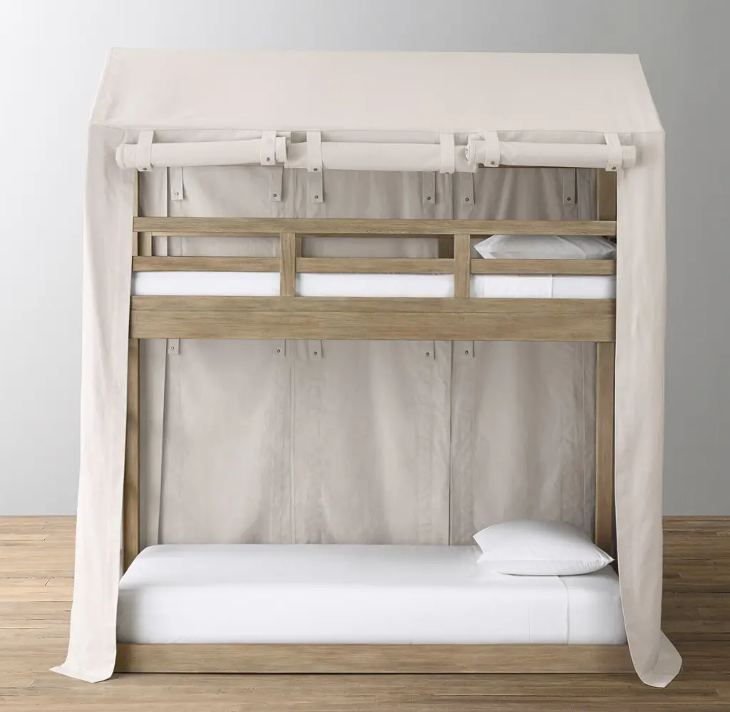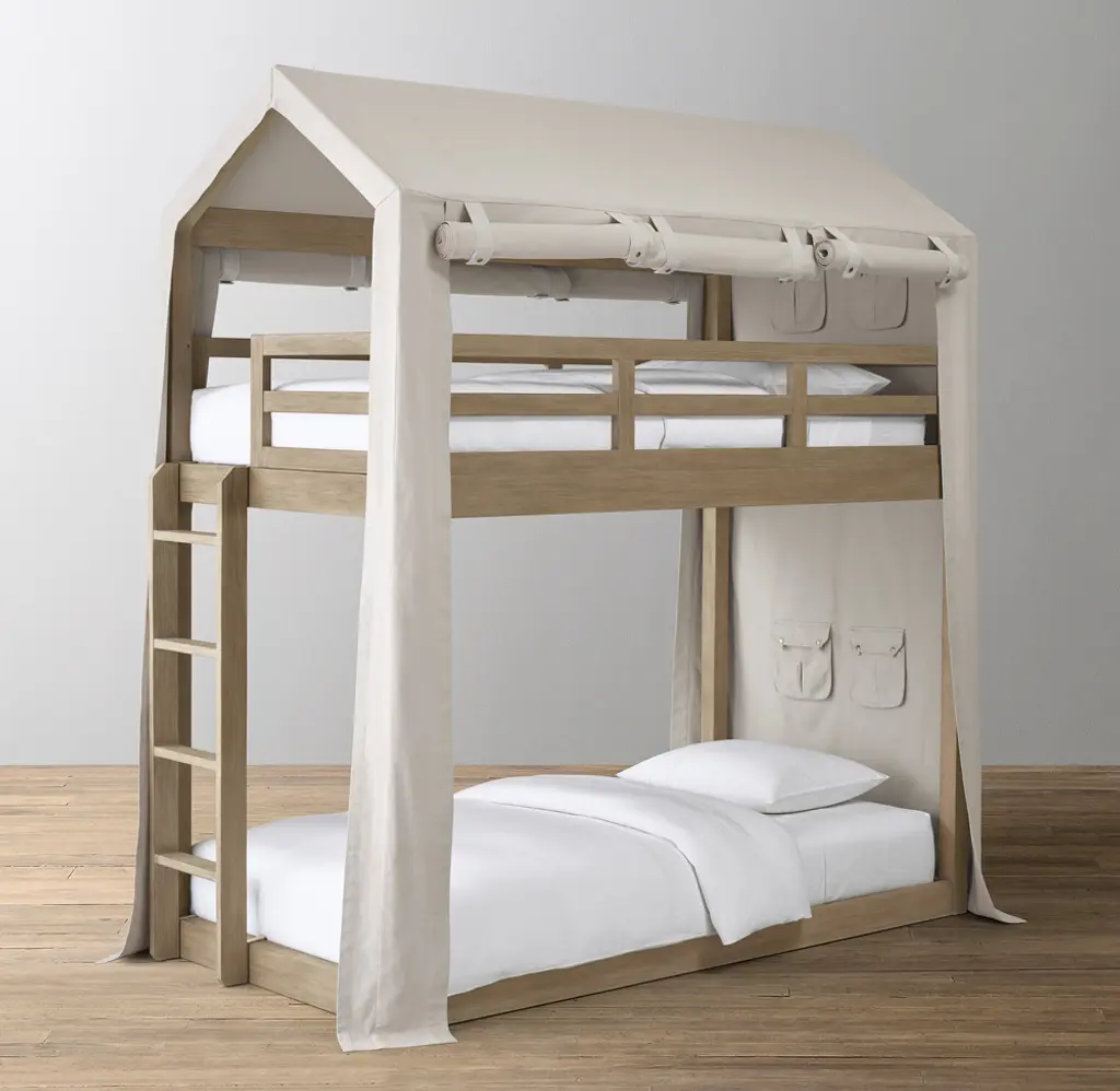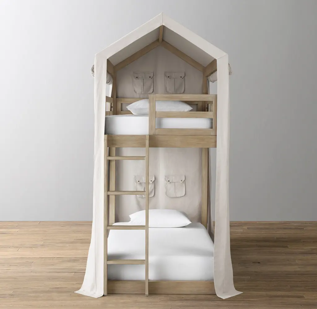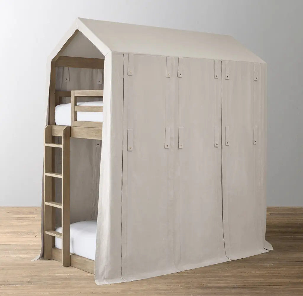 The simple, A-shaped frame of the iconic American barn inspired our bunk, which features stout beams on the long sides and triangular roof trusses at either end. Paired with a removable tent covering in sturdy canvas, it brings the rustic feel of a backcountry cabin into the room – and provides a cozy place to bunk down for the night.