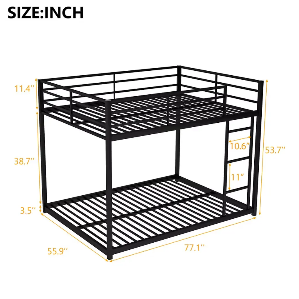 This full-over-full metal bunk bed combines durability with modern design, featuring a sturdy tubular metal frame and built-in ladder. Ideal for saving space in bedrooms, dorms, or shared rooms, it provides secure and comfortable sleeping for kids, teens, or adults while adding a playful yet functional vibe.