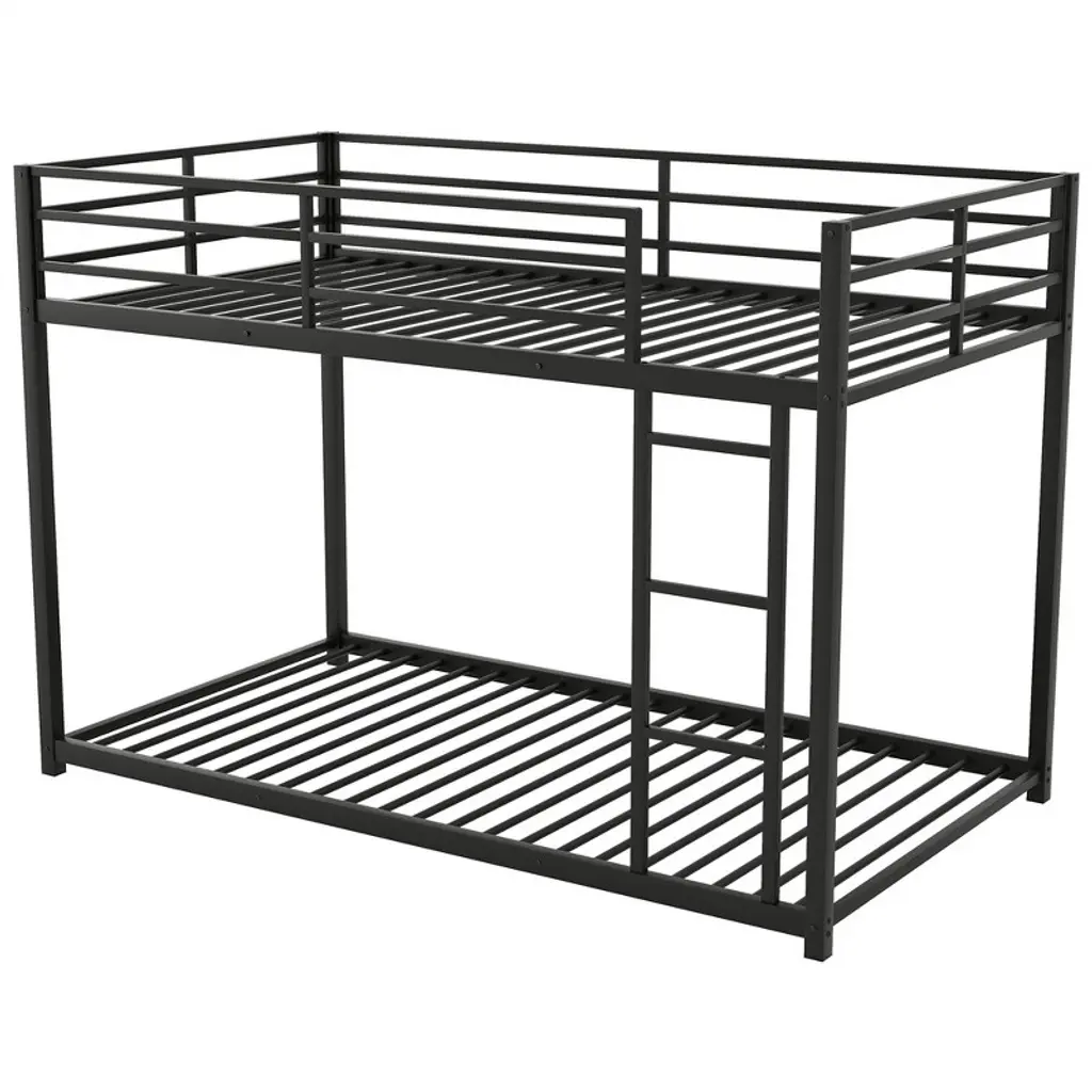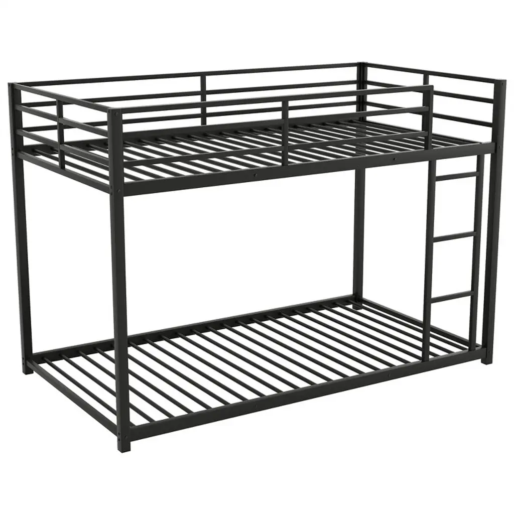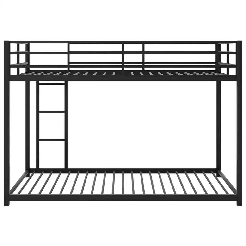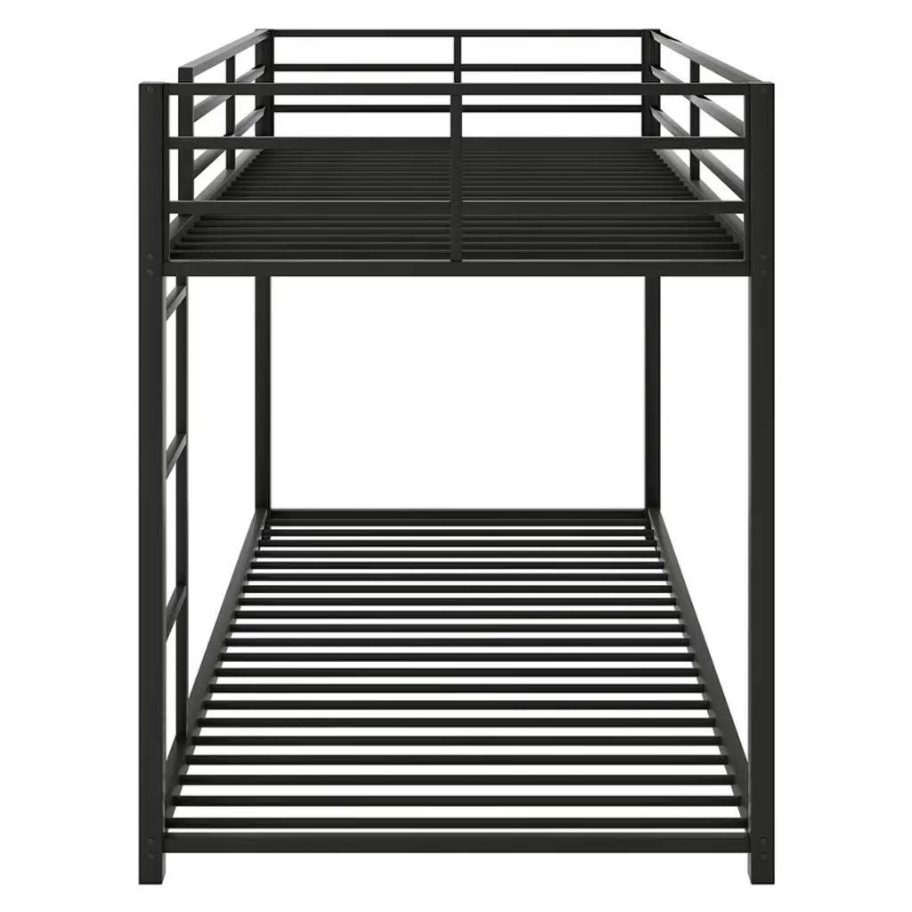 This twin-over-twin metal bunk bed features a low-profile design crafted from heavy-gauge tubular steel, ensuring durability and stability. Perfect for kids' and teens' bedrooms, its modern black finish adds a playful yet sleek vibe to any space while maximizing floor area in compact rooms.