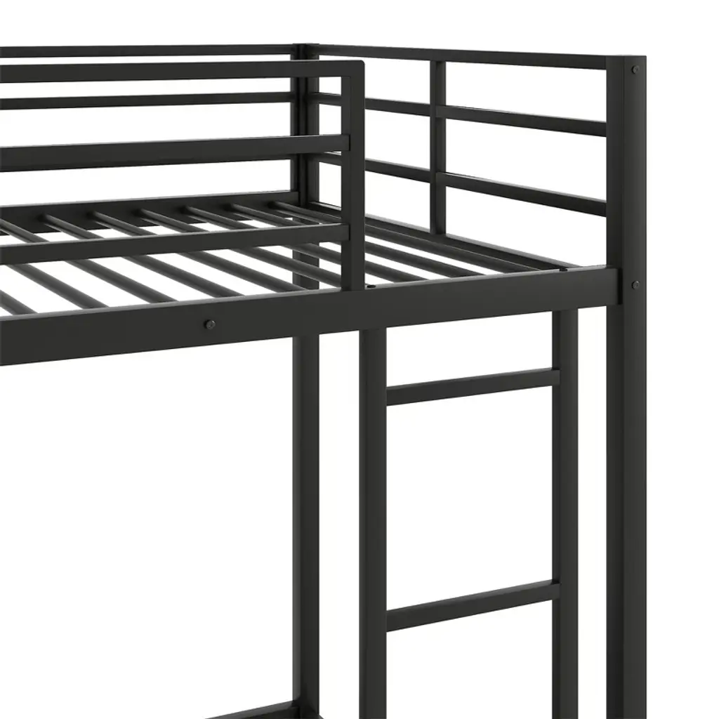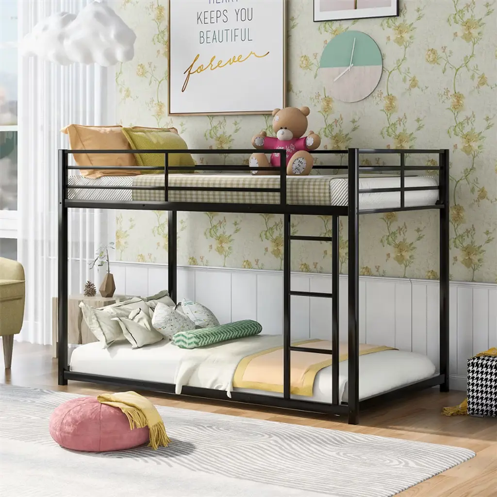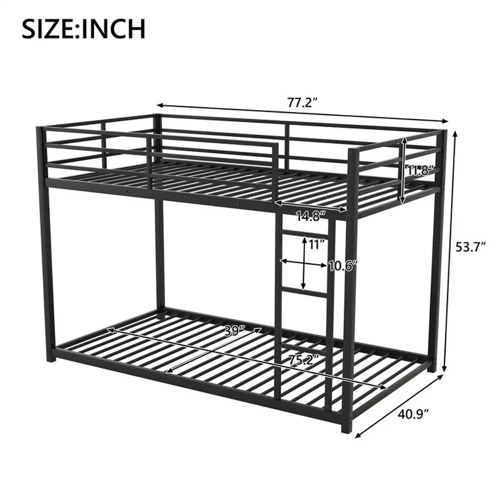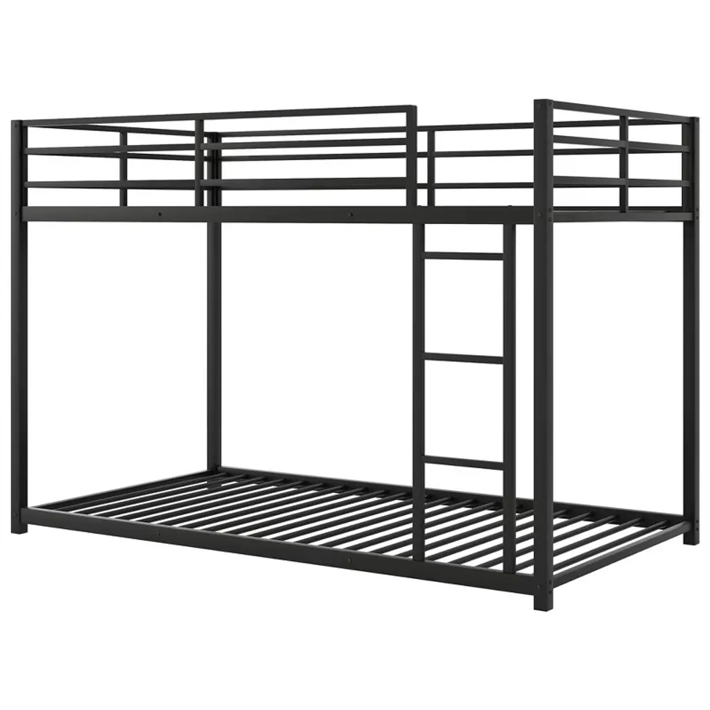 This twin-over-twin metal bunk bed features a low-profile design crafted from heavy-gauge tubular steel, ensuring durability and stability. Perfect for kids' and teens' bedrooms, its modern black finish adds a playful yet sleek vibe to any space while maximizing floor area in compact rooms.