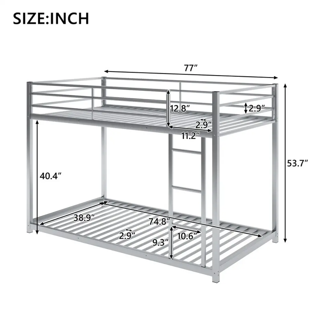 Cowlown Silver Full Over Full Metal Bunk Bed With Ladder, Low Profile Sturdy Bunk Bed Frame For Kids, Teens, And Adults