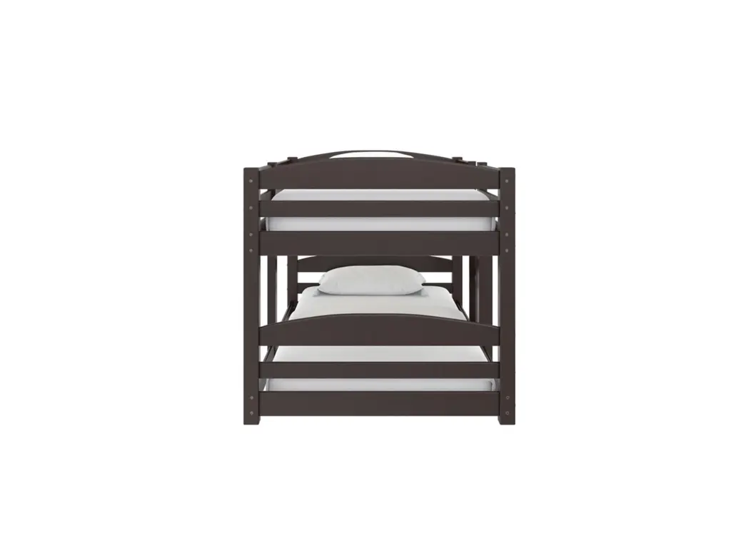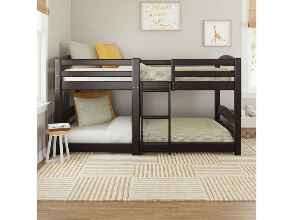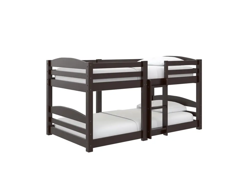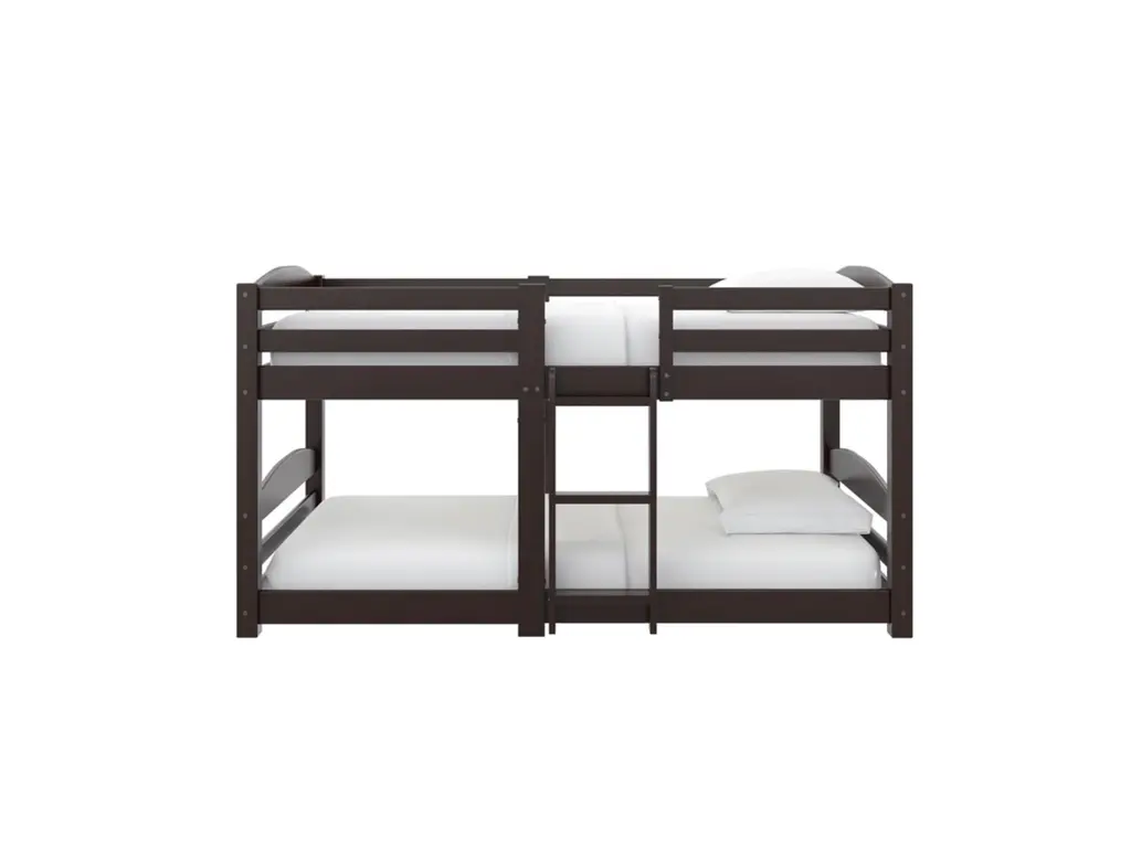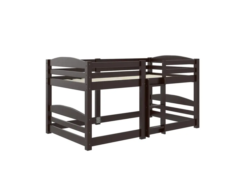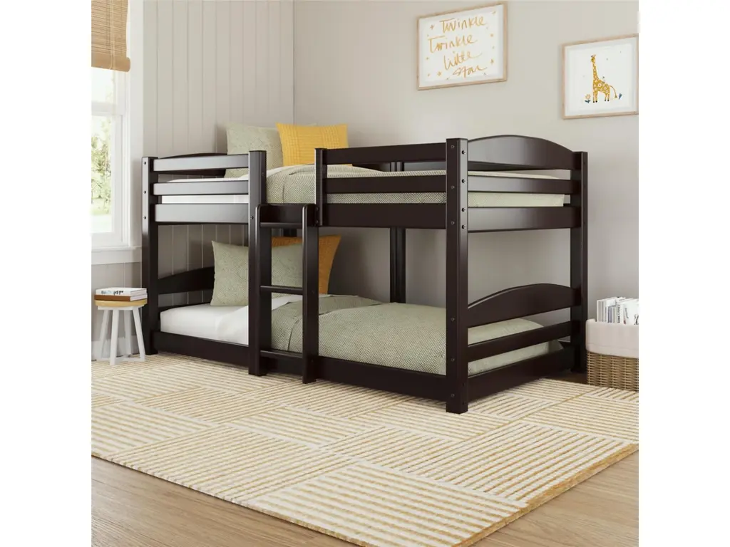 Give your little adventurers the gift of great sleep with the DHP Birley Twin over Twin Bunk Bed. Its low-to-the-ground design ensures easy twin bunk bed access, making bedtime a breeze for your young kids and teens. Our stylishly painted solid wood bunk bed features 14-inch guardrails on the top bunk, providing enhanced safety, and includes a sturdy three-step ladder for secure access. Versatility is key with this junior bunk bed, optimizing your kid's bedroom with a bottom bunk that doubles as a cozy floor bed--ideal for siblings, sleepovers, or growing children. Our kids' bunk bed has a low bunk bed design, perfect for small spaces and rooms with low ceilings. The strong spruce wood platform bed frame fits two twin-size mattresses (not included), with the upper bunk being able to accommodate a 6" spring mattress thanks to 13 sturdy wooden slats that support up to 200 lbs. without a box spring foundation.