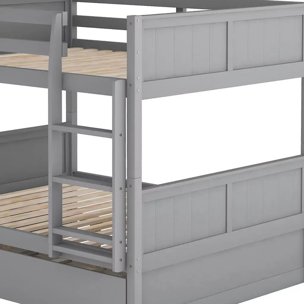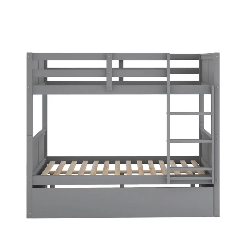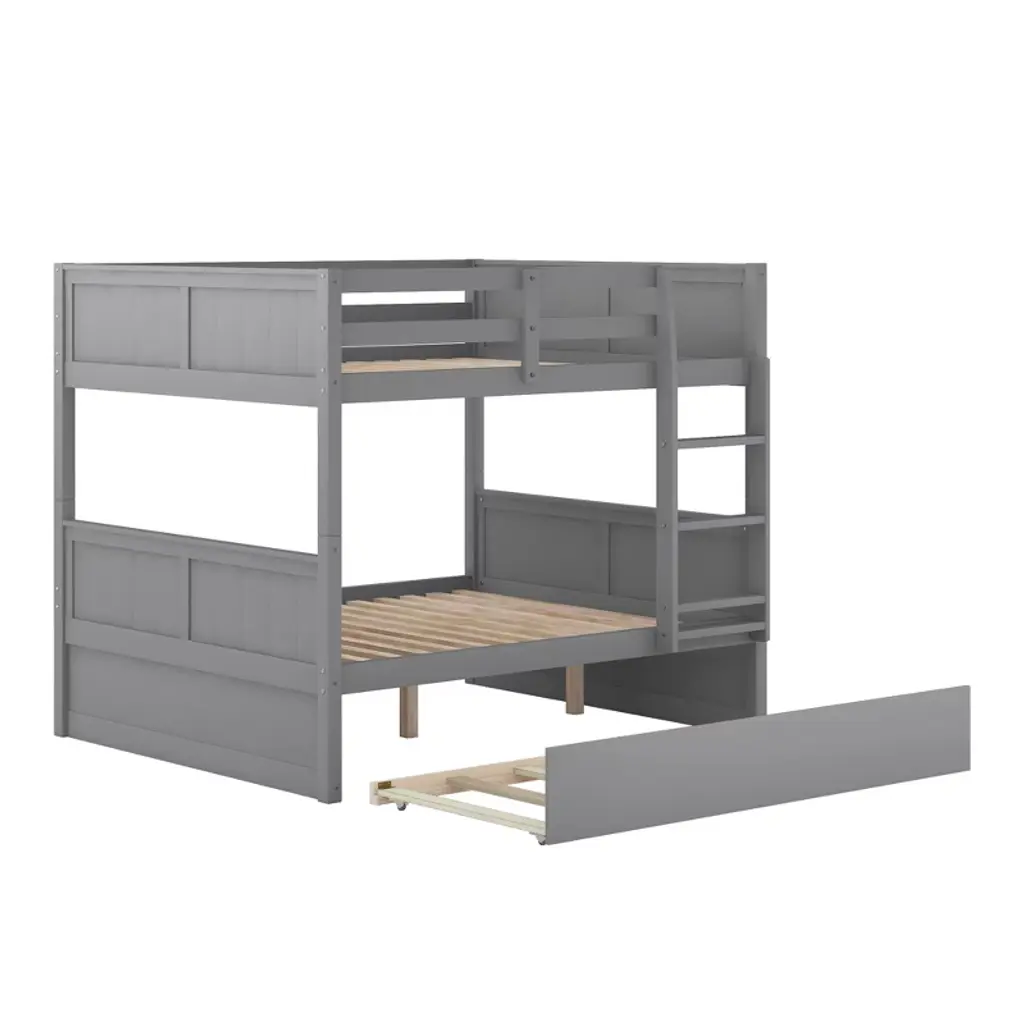 Product Features Easy Conversion: This full-over-full bunk bed can be split into two separate beds for complete versatility — especially useful if you have more than one room to furnish. Enjoy long-term flexibility that grows with your family's needs.Built-in Design: This bunk bed comes packed with features, including a pullout trundle bed with removable casters. Save space and always be prepared for overnight guests — perfect for sleepovers or unexpected visitors.Built With Safety in Mind: Solid pine and plywood construction gives this versatile piece stability and durability — not to mention the extra safety which comes from the top bunk having solid rails.Overall Dimensions: 79.5"L x 57"W x 59.9"H with no box spring required. This piece comes with simple assembly instructions. If extra help is needed, don't hesitate to contact our friendly customer service representatives. Description If you need extra sleeping space or your family loves sleepovers, this Full-Over-Full Bunk Bed with Twin Size Trundle is perfect for your home. The trundle under the bottom bed makes this piece a great option for sleepovers. High-quality, solid pine legs and a strong, durable frame ensure stability and durability for long-term use, and can be separated into two full-size platform beds. A slat kit is included so box springs are not required. This bunk bed is designed with a clean silhouette and a touch of elegance. It suits all styles of home decoration and completes the look of any bedroom. Weight & Dimensions Overall Product Dimension: 79.5"L x 57"W x 59.9"HDetail Product Dimension: Please refer to the Size imageNumber of Package: 2Package Dimension: Please refer to the SpecificationOverall Product Weight: 174 LBSPackage Weight: Please refer to the SpecificationWeight Capacity: Upper bed: 250 LBSBottom bed: 300 LBSTrundle bed: 175 LBS Recommended Mattress Thickness: Upper bed: 6"Bottom bed: 8"Trundle bed: 6" Recommended Age: £¾6 years old Specifications Product Type: Bunk BedSize: Full-Over-FullMaterial: Plywood + MDF + PinewoodBox Spring Required: NoNumber of Slats: Upper bed: 14Bottom bed: 14Trundle bed: 7 Assembly Required: YesNotes: Manual measurement has been used, there may be some reasonable error. All the pictures are taken by actual samples, slight chromatic aberration may occur due to lighting or display.
