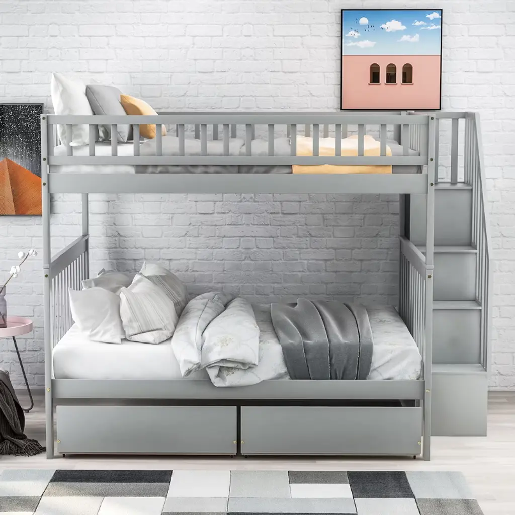 This full over full bunk bed can accommodate 4 people at the same time, making full use of space. Founder's shape does not waste any space. In addition, the added drawers and storage can accommodate many items. The ladder has inclined handrails aim for easy access. The bed rails are sufficiently high to ensure the safety. The simple shape can match any style. Assembly needed.Product Detail:- Product Type:Bunk Bed- Size:Full over Full- Overall Product Dimension:93.5"L x 57.5"W x 65.6"H- Overall Product Weight:238 LBS- Detail Dimension: Please refer to the Size picture- Weight Capacity: 250 LBS- Material: Pine Wood+MDF- Recommended Mattress Thickness: (Upper/Down): 6''/8-10'' (The mattress is not included)- Number of Packages: 3 (Packages shipped separately may not arrive at the same time, please be patient.)- Assembly Required:YesWhat's in the box:- Bed * 1- Tools included- Instruction manual