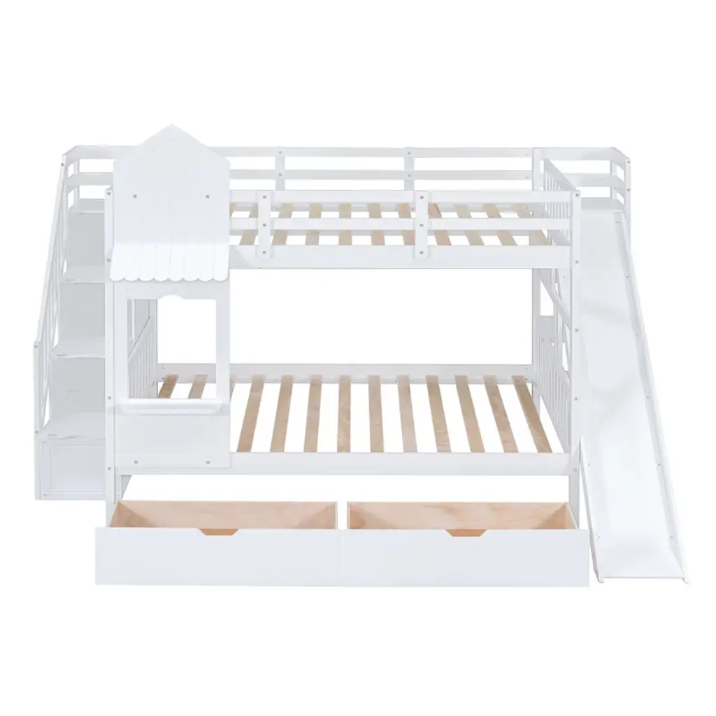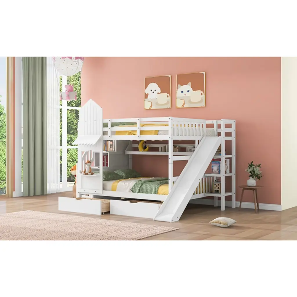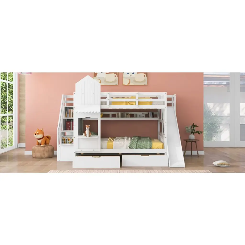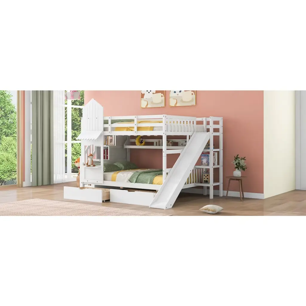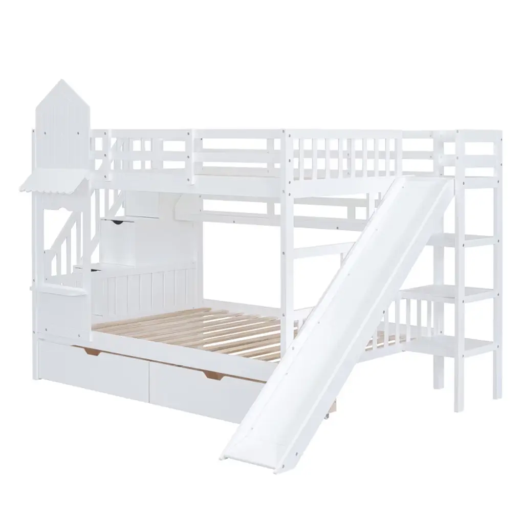 Full-over-full Castle Style Bunk Bed With 2 Drawers And 3 Shelves