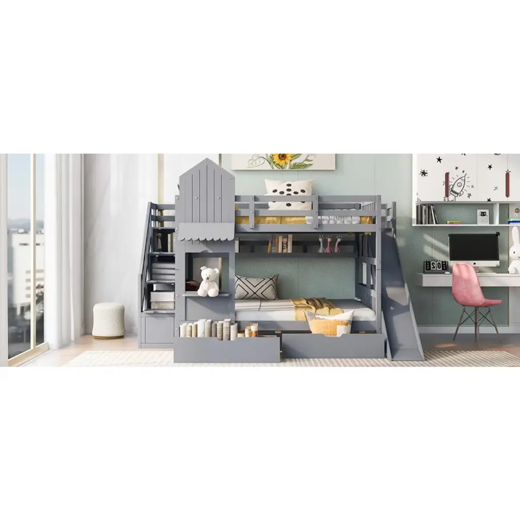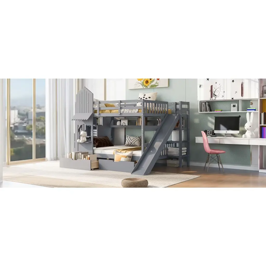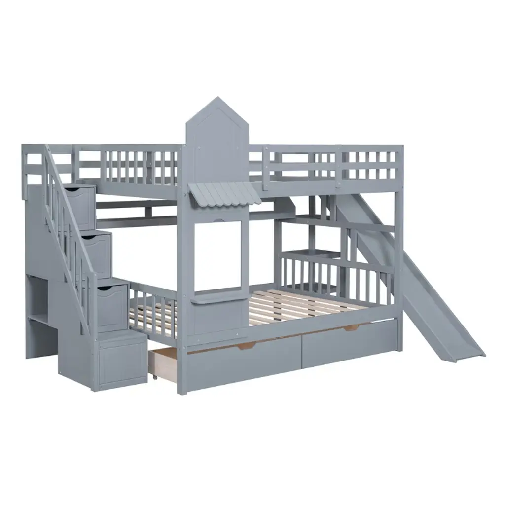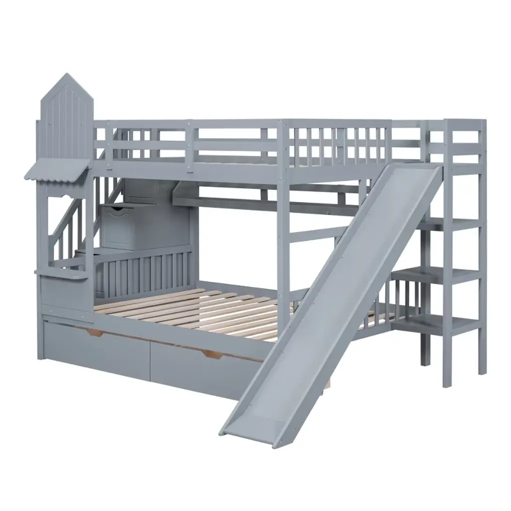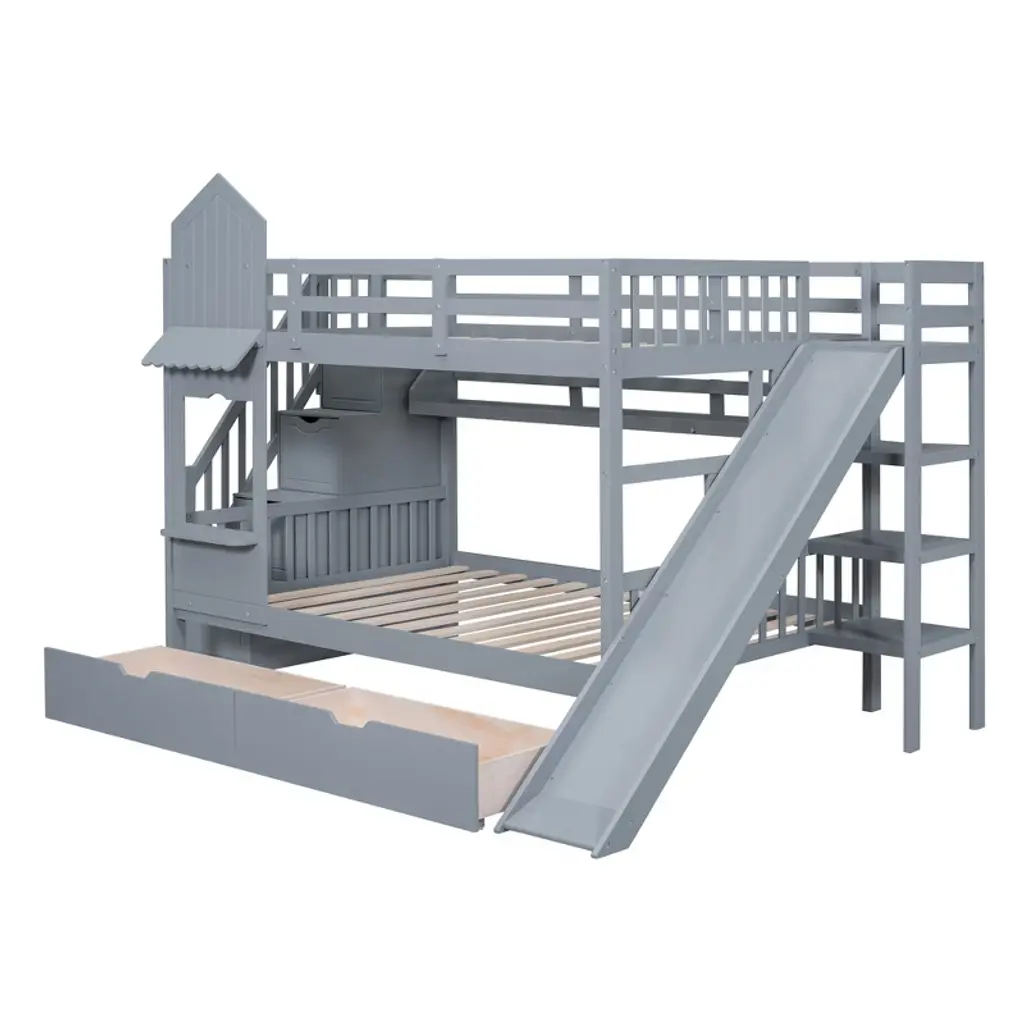 Full-over-full Castle Style Bunk Bed With 2 Drawers And 3 Shelves