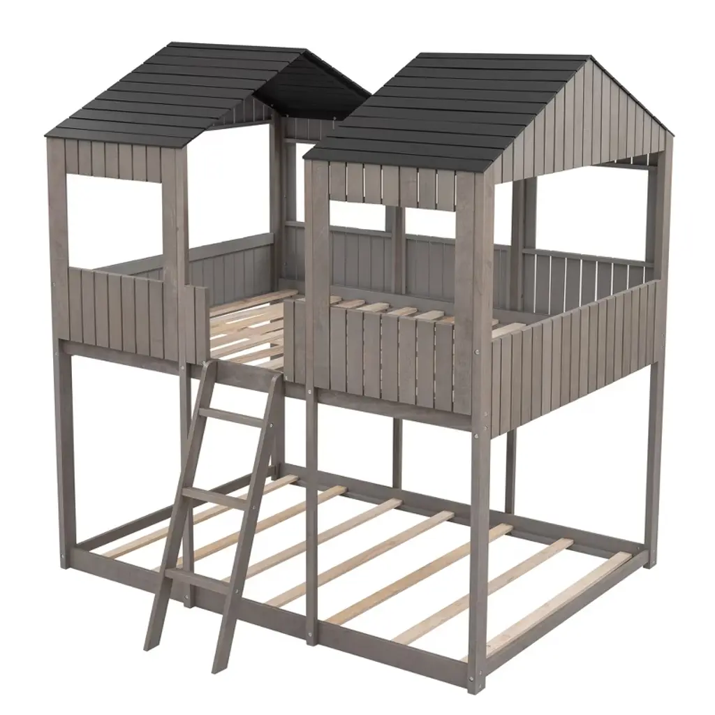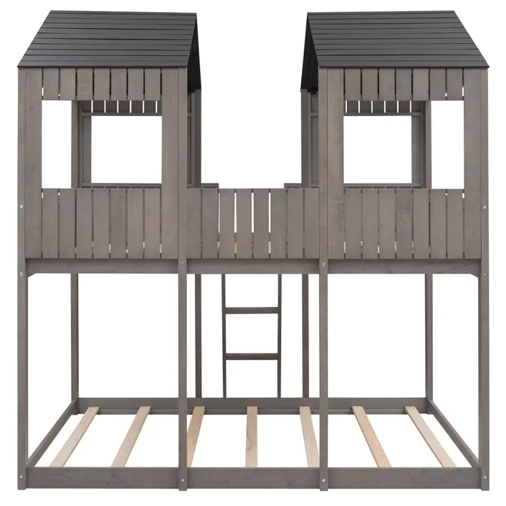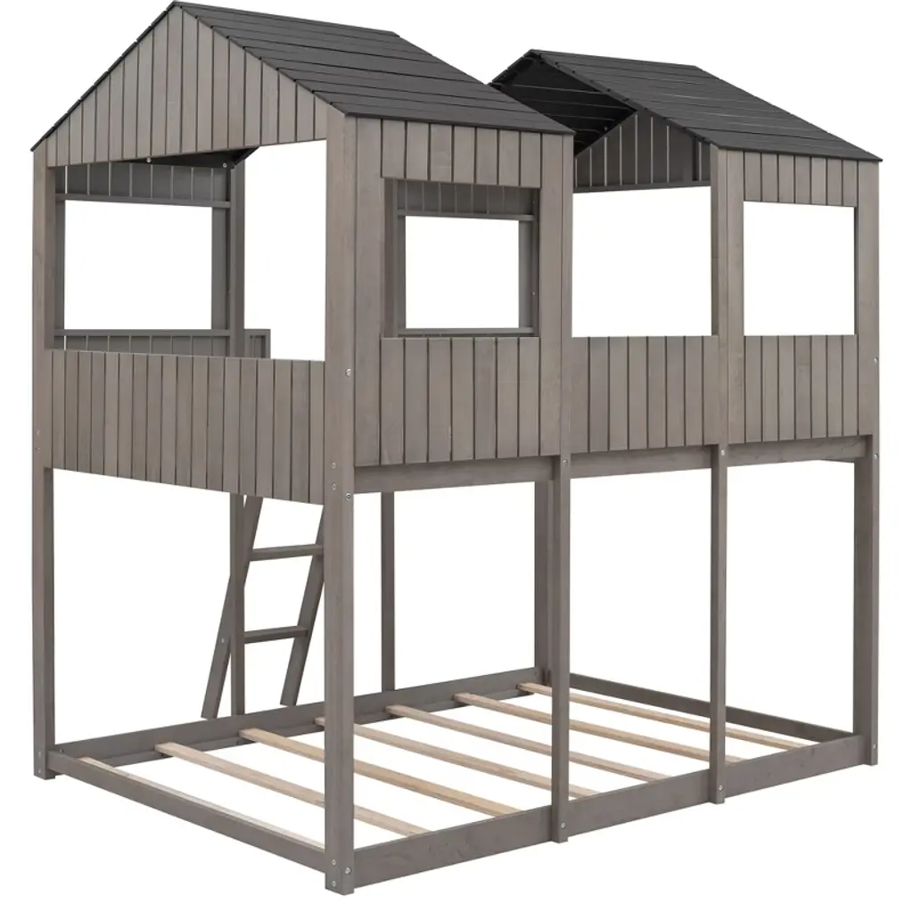 Product Features [Playhouse Inspired] Featuring a pitched roof and wall section with window, this unique and intricately designed bunk bed creates a fun and adorable space that not only serves as a comfortable sleeping area but also doubles as a space for you to play and have fun.[A Better Sleeping Environment] Thanks to the semi-enclosed space, you will have their own sleeping space that affords a comforting atmosphere for better sleep while not sacrificing air circulation.[Reliable Safety Design] The low profile lower bunk is perfect for families. Full-length guardrails on the upper bunk prevent accidental falls. The built-in 3-step ladder tightly attaches to the bed for easy access and wobble-free footing.[Superior Quality] The full sized bunk bed is constructed with a sturdy pinewood frame that features a natural wood grain look for enhanced stability and durability. Both bunks have plywood support slats, you don't need to prepare box springs or foundations.[Dimensions] Overall bunk bed dimension: 78.7'' x 56.2'' x 85.5''(L x W x H). Weight capacity - Upper Bed: 400lbs; Bottom Bed: 400lbs. This wood bunk bed will come in 3 packages with clear instructions and hardware. Description Take your bedroom to the next level with this full over full bunk bed that not only saves space, but creates an exciting atmosphere for you. Featuring a pitched roof and playhouse-inspired wall with window, this bunk bed doubles as a semi-enclosed play place perfect for you to study, watch TV or explore their imaginations. With guardrails, a ladder and a sturdy pine frame, this bunk bed offers a safe space for your family to get a good night's sleep. Weight & Dimensions Overall Product Dimension: 78.7"L x 56.2"W x 85.5"HDetail Product Dimension: Please refer to the Size imageNumber of Package: 3Package Dimension: Please refer to the SpecificationOverall Product Weight: 226.72LBSPackage Weight: Please refer to the SpecificationWeight Capacity: Upper bed: 400LBS, Bottom bed: 400LBSRecommended age: > 6 years oldRecommended Mattress Thickness: Upper bed: 6", Bottom bed: 8"Number of Slats: Upper bed:14, Bottom bed:7 Specifications Product Type: Bunk BedSize: Full-Over-FullMaterial: Plywood + MDF + PinewoodBox Spring Required: NoAssembly Required: YesNotes: Manual measurement has been used, there may be some reasonable error. All the pictures are taken by actual samples, slight chromatic aberration may occur due to lighting or display.