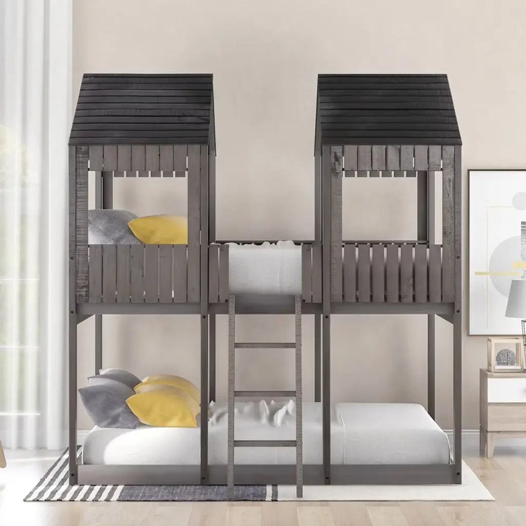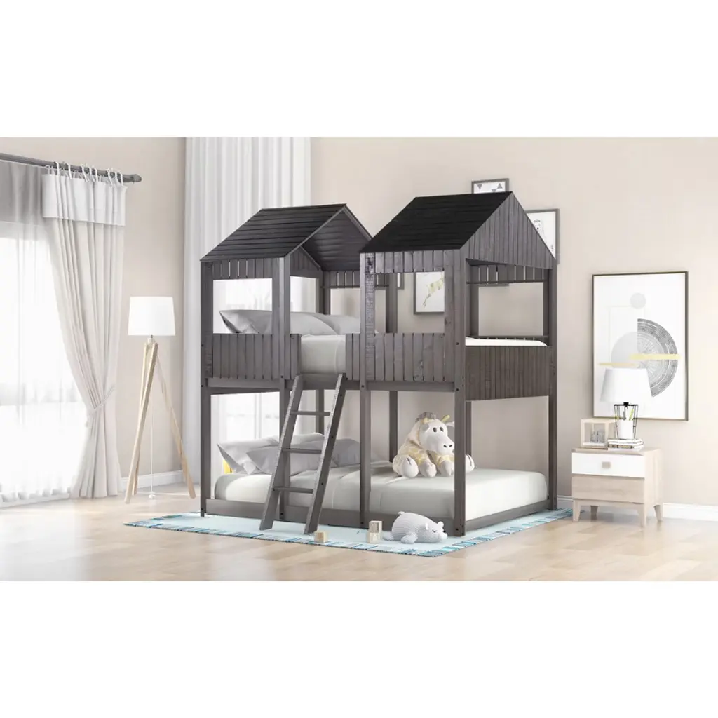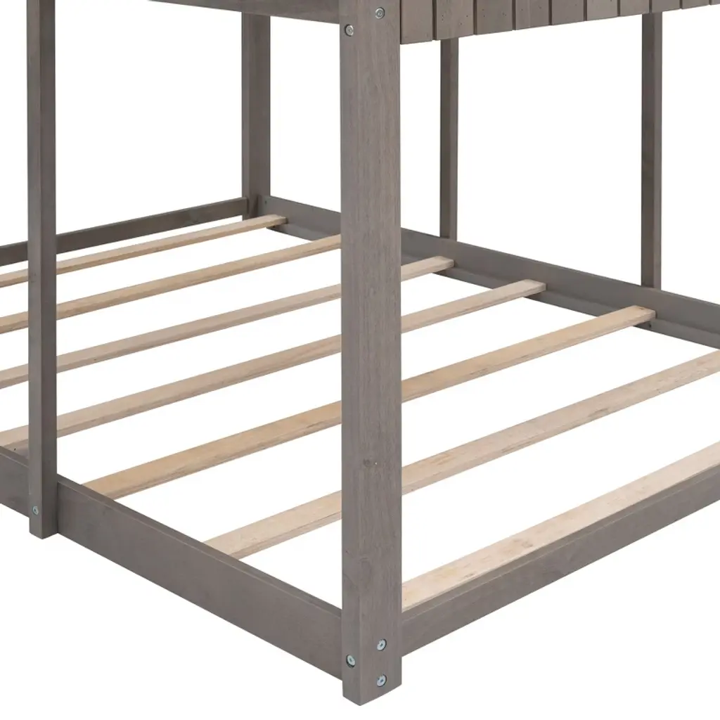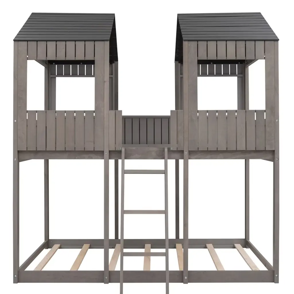 Product Features [Playhouse Inspired] Featuring a pitched roof and wall section with window, this unique and intricately designed bunk bed creates a fun and adorable space that not only serves as a comfortable sleeping area but also doubles as a space for you to play and have fun.[A Better Sleeping Environment] Thanks to the semi-enclosed space, you will have their own sleeping space that affords a comforting atmosphere for better sleep while not sacrificing air circulation.[Reliable Safety Design] The low profile lower bunk is perfect for families. Full-length guardrails on the upper bunk prevent accidental falls. The built-in 3-step ladder tightly attaches to the bed for easy access and wobble-free footing.[Superior Quality] The full sized bunk bed is constructed with a sturdy pinewood frame that features a natural wood grain look for enhanced stability and durability. Both bunks have plywood support slats, you don't need to prepare box springs or foundations.[Dimensions] Overall bunk bed dimension: 78.7'' x 56.2'' x 85.5''(L x W x H). Weight capacity - Upper Bed: 400lbs; Bottom Bed: 400lbs. This wood bunk bed will come in 3 packages with clear instructions and hardware. Description Take your bedroom to the next level with this full over full bunk bed that not only saves space, but creates an exciting atmosphere for you. Featuring a pitched roof and playhouse-inspired wall with window, this bunk bed doubles as a semi-enclosed play place perfect for you to study, watch TV or explore their imaginations. With guardrails, a ladder and a sturdy pine frame, this bunk bed offers a safe space for your family to get a good night's sleep. Weight & Dimensions Overall Product Dimension: 78.7"L x 56.2"W x 85.5"HDetail Product Dimension: Please refer to the Size imageNumber of Package: 3Package Dimension: Please refer to the SpecificationOverall Product Weight: 226.72LBSPackage Weight: Please refer to the SpecificationWeight Capacity: Upper bed: 400LBS, Bottom bed: 400LBSRecommended age: > 6 years oldRecommended Mattress Thickness: Upper bed: 6", Bottom bed: 8"Number of Slats: Upper bed:14, Bottom bed:7 Specifications Product Type: Bunk BedSize: Full-Over-FullMaterial: Plywood + MDF + PinewoodBox Spring Required: NoAssembly Required: YesNotes: Manual measurement has been used, there may be some reasonable error. All the pictures are taken by actual samples, slight chromatic aberration may occur due to lighting or display.