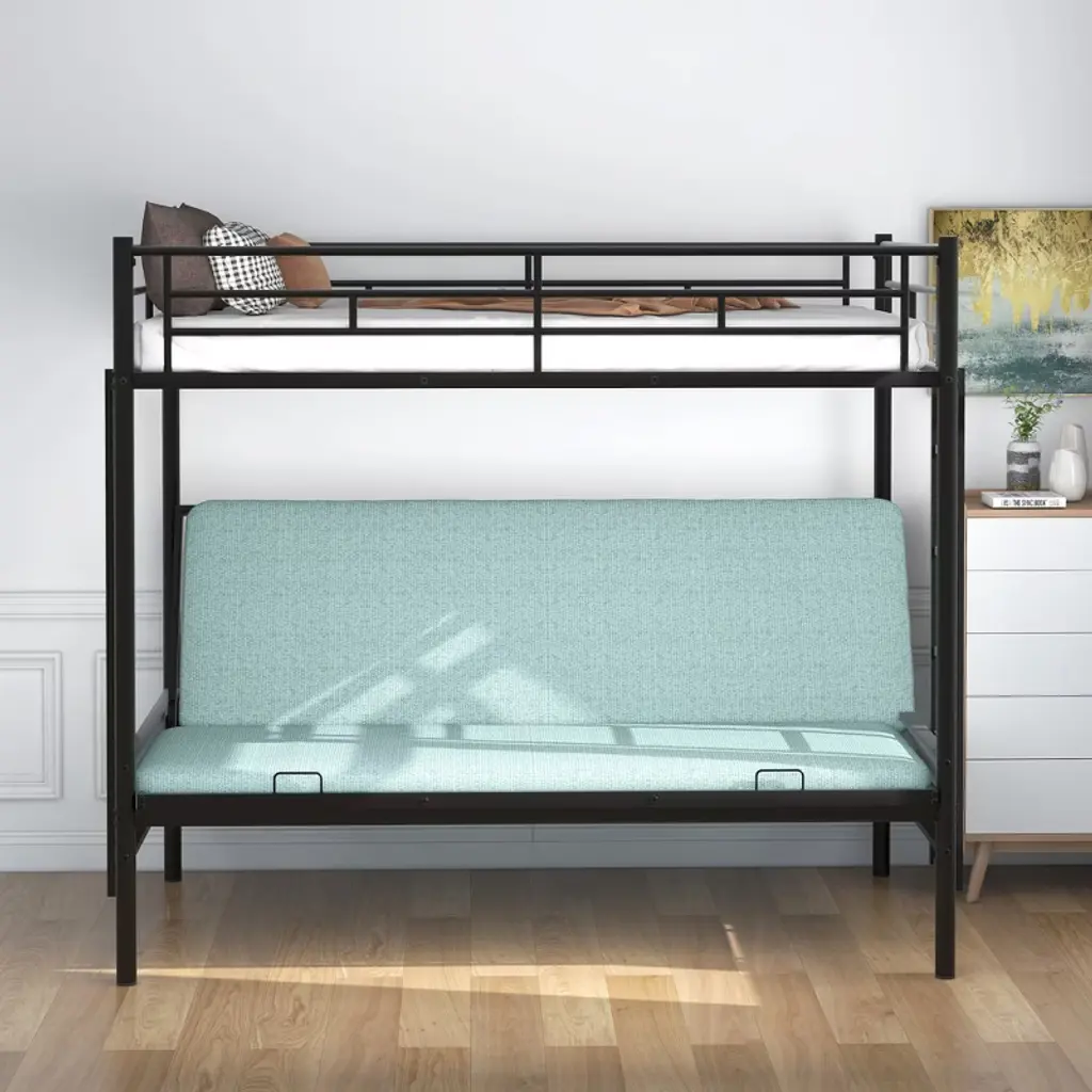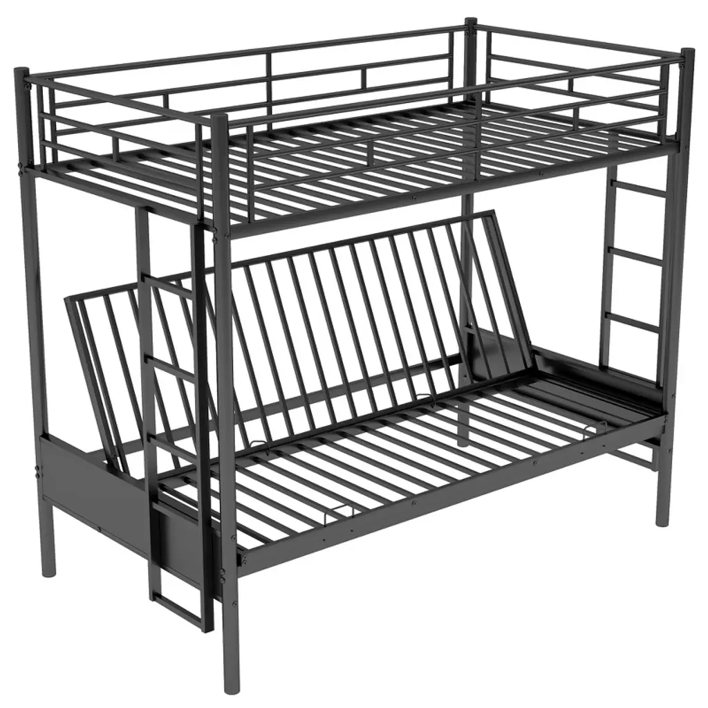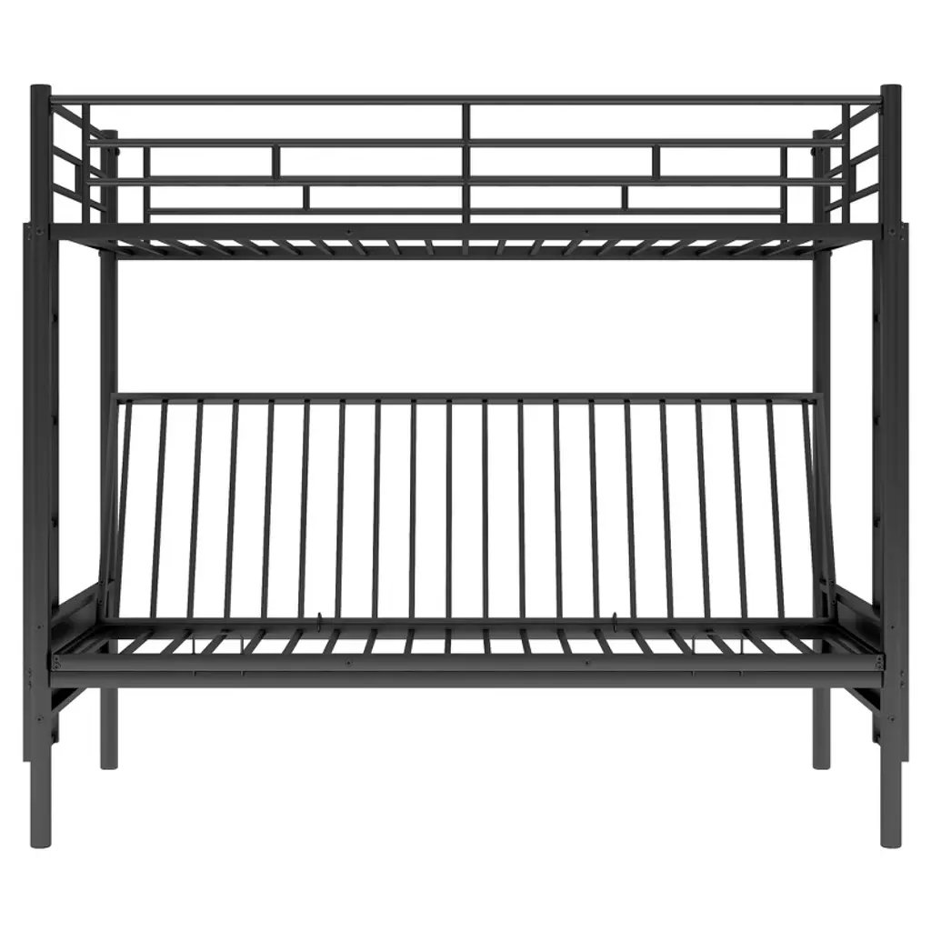 Upgrade your space with Gulches¡¯ sleek black twin over full metal bunk bed, boasting a stylish contemporary design. Merging form and function, the bottom bunk converts from a futon/seated position to a full-size bed (futon mattress sold separately). For added safety, it includes an integrated side ladder, upper guard rails, and a childproof mechanism. Ships ready-to-assemble for hassle-free setup.