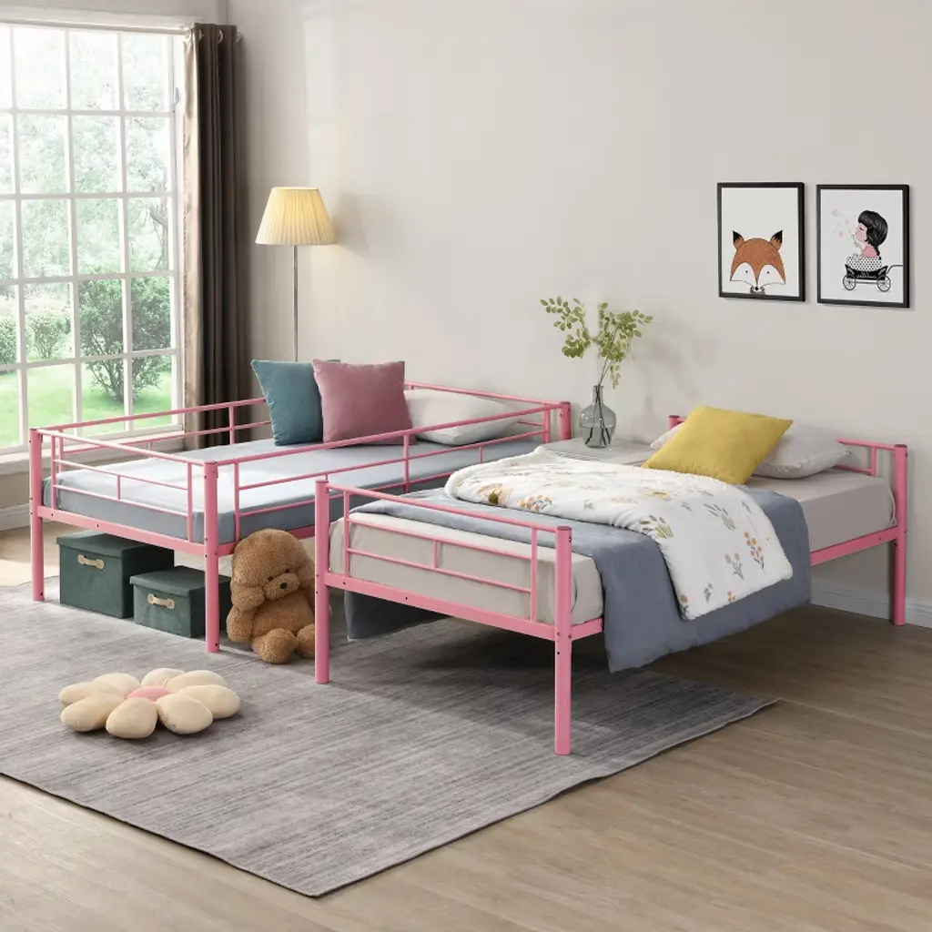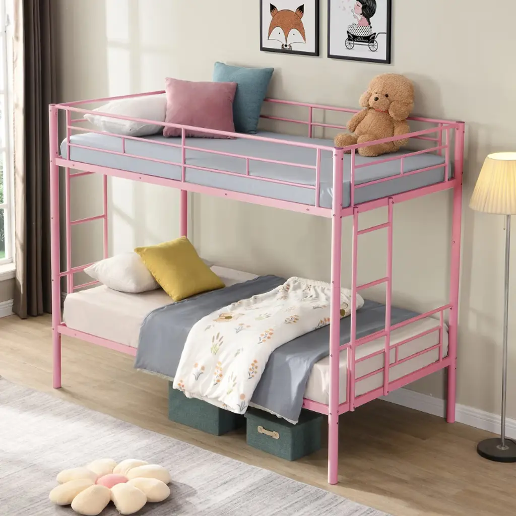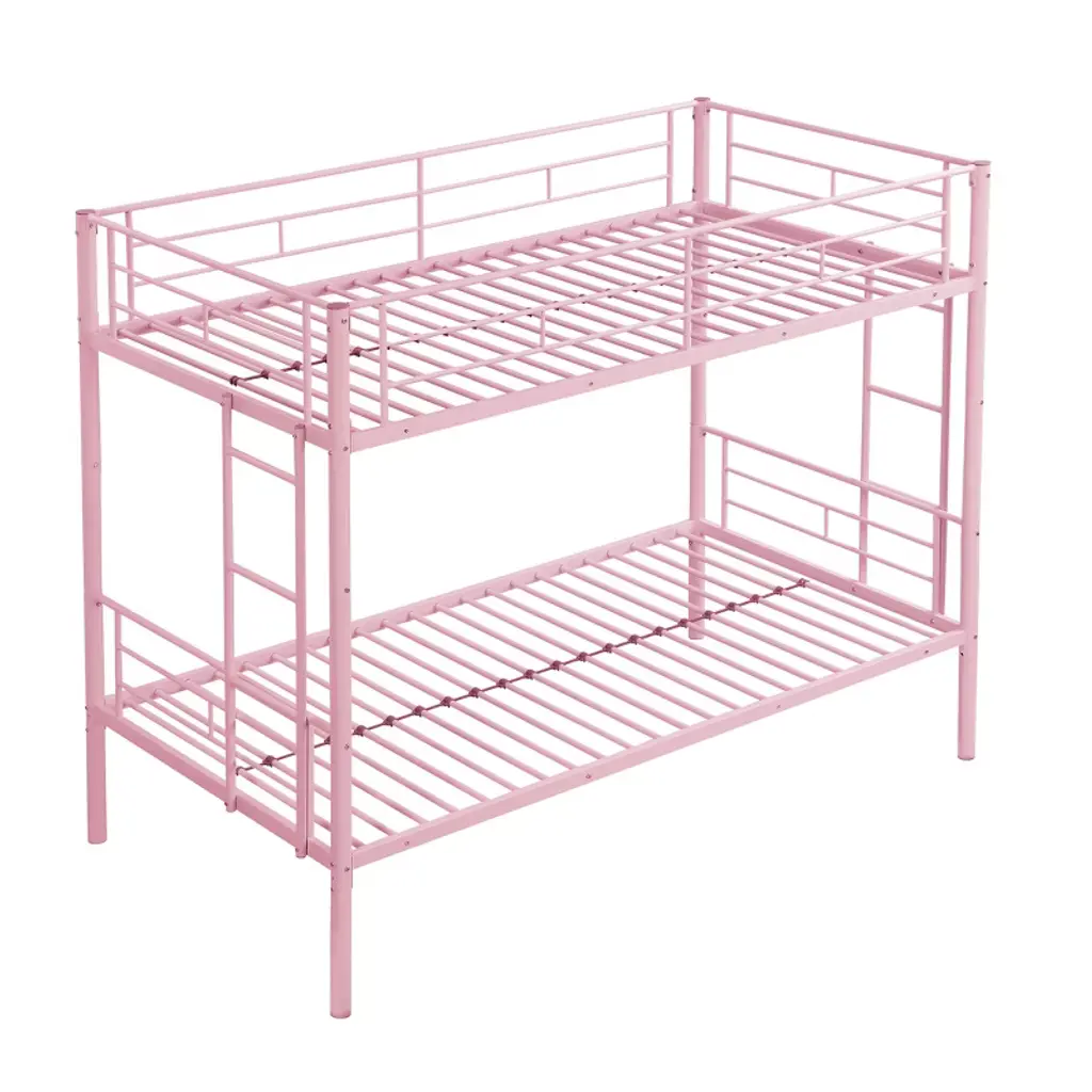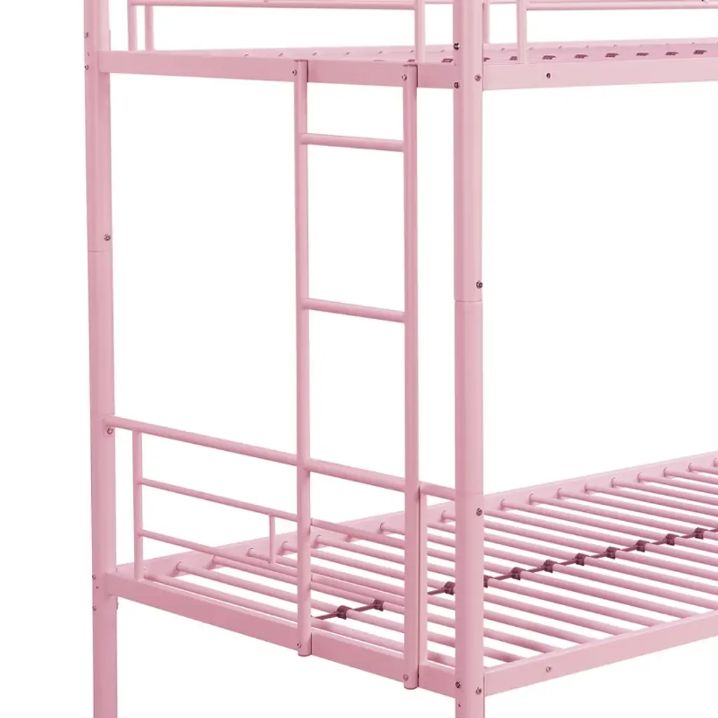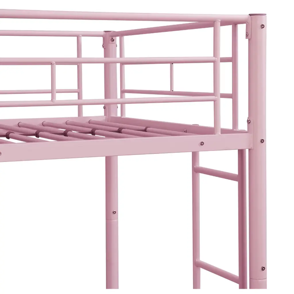 Gulches Pink Twin Over Twin Metal Bunk Bed adds modern style and space-saving convenience to any bedroom. Built with a strong steel structure for durability, stability, and quiet use, it supports up to 250/350 LBS. Safe stairs make it kid-friendly, and no box spring is required¡ªworks with all mattress types (including memory foam). Ships as 1 set in 1 carton, complete with clear instructions, all parts, and tools for easy assembly.