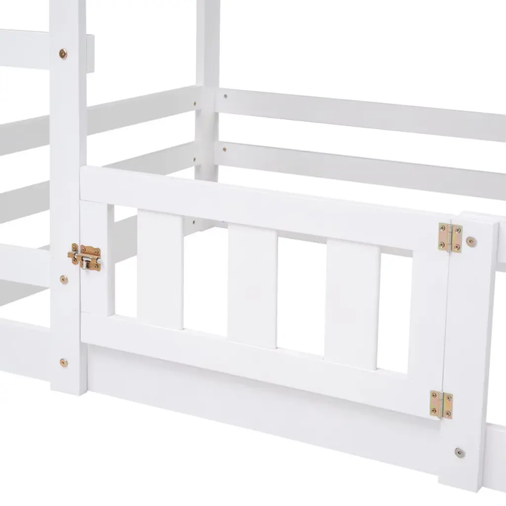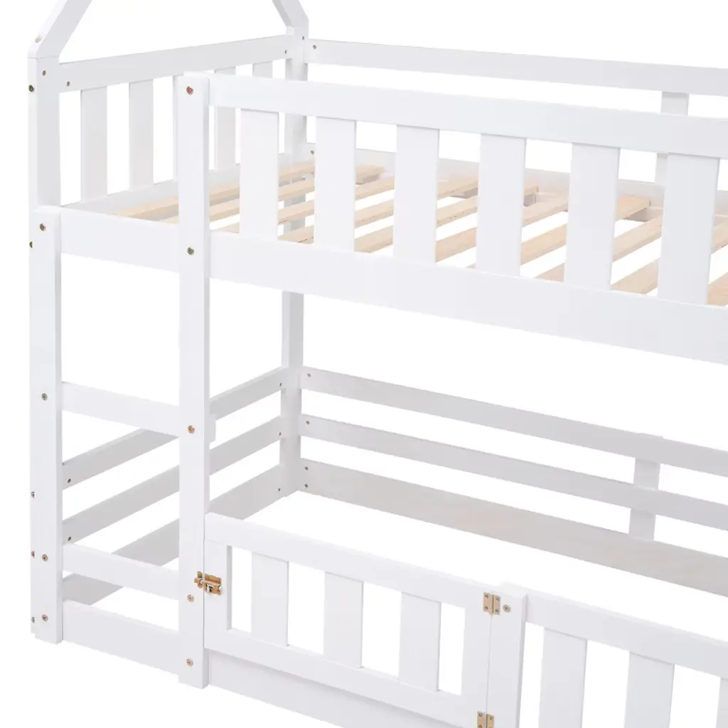 Gulches Twin Over Twin House Bunk Bed - Fence Guardrails, Small Door, Solid Pine Wood & Mdf, White