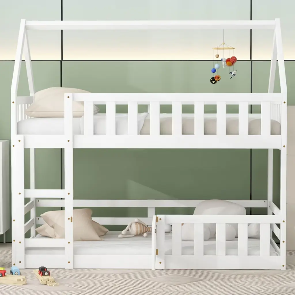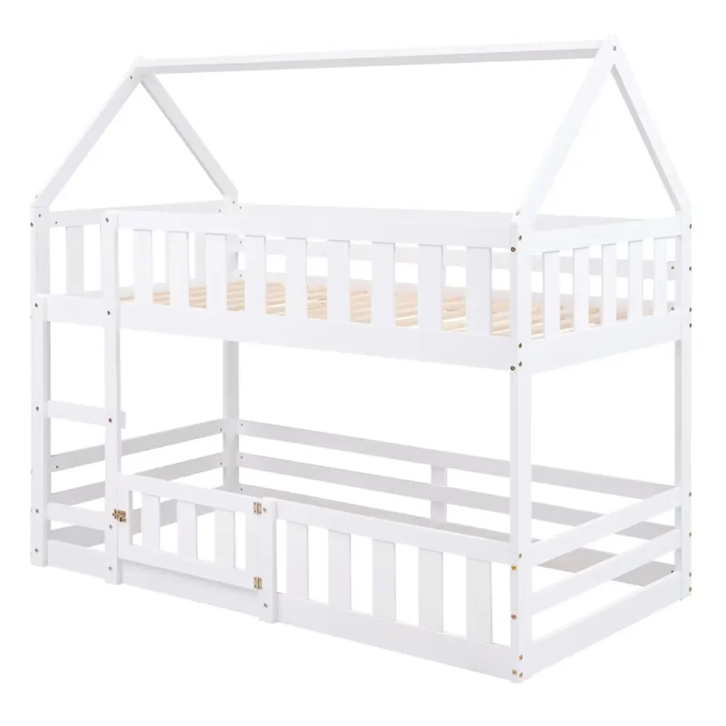 Gulches White Twin over Twin House Bunk Bed blends durability and ͯȤ. Crafted from high-quality solid pine wood and MDF for long-lasting stability. Its classic house shape with a whimsical sky roof and unique guardrails creates a fun vibe. Fence-shaped guardrails ensure safety; the lower bed¡¯s small door lets kids enter freely. Remove the lower bed to turn the space into a playground. Ships in one box with all parts, tools, and instructions for easy assembly.