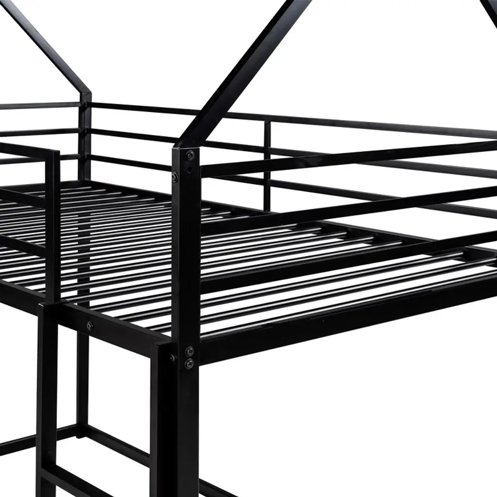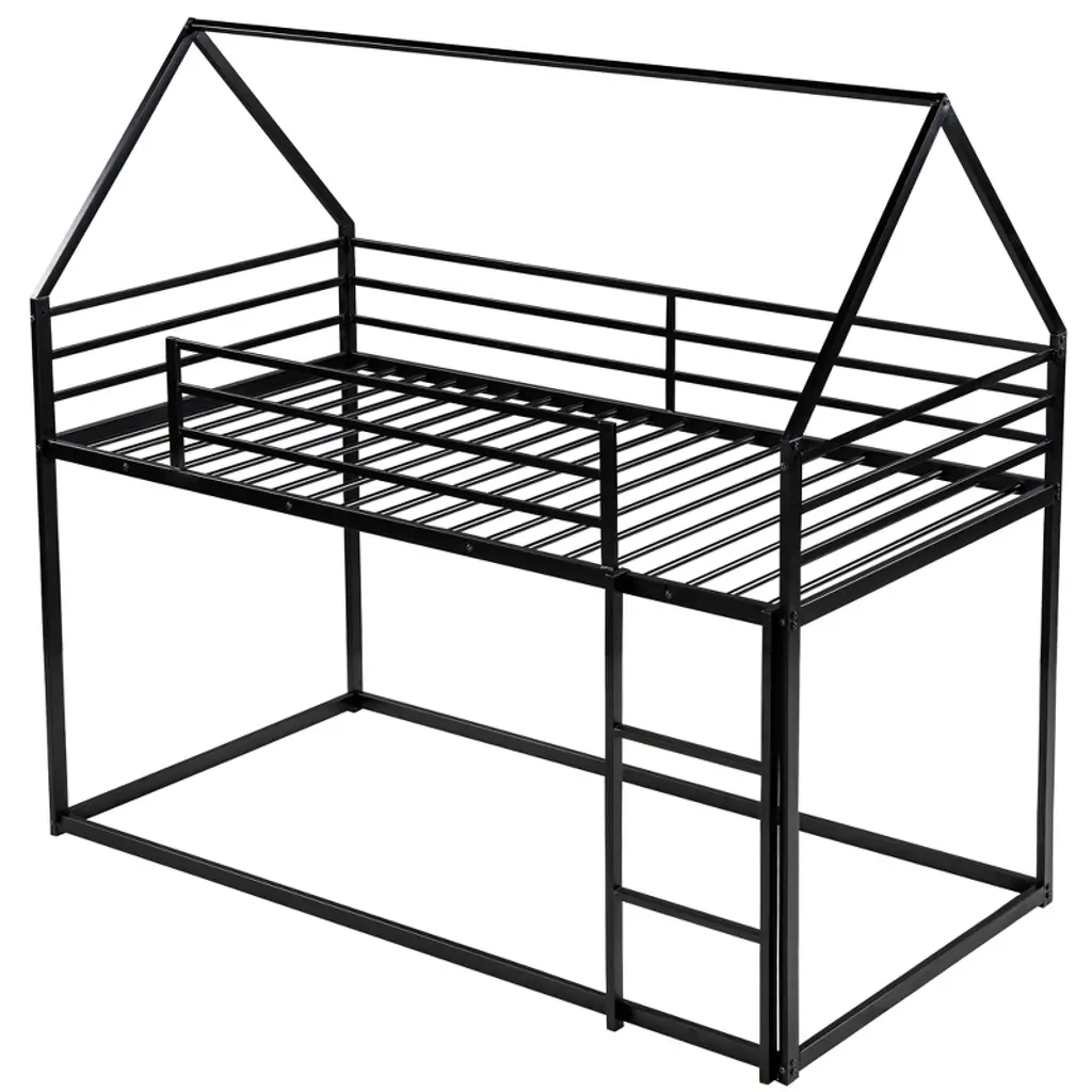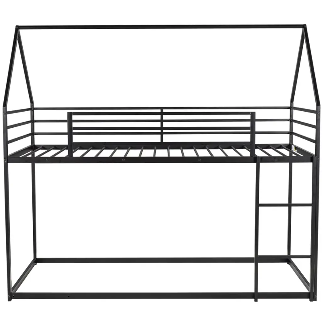 Gulches Twin Over Twin Metal House Bunk Bed - Built-in Convertible Ladder, High Guardrails, Timeless Design, Black