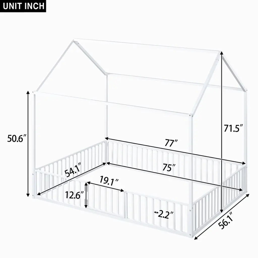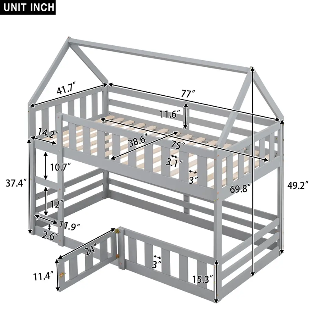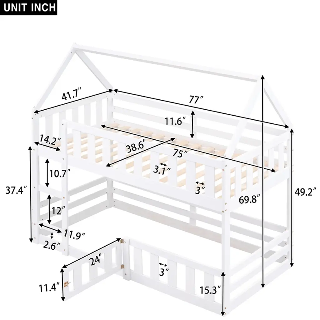 Gulches Twin over Twin House Bunk Bed blends play and comfort with its whimsical playhouse design and slide, sparking kids¡¯ imagination for sleep and play. Crafted from a sturdy solid metal frame, it features high upper bunk guardrails for safety. Its clean silhouette offers a modern, timeless style. Ladder and slide are convertible¡ªinstall left or right. Ships with all parts, tools, and instructions; assembles in under an hour with help.