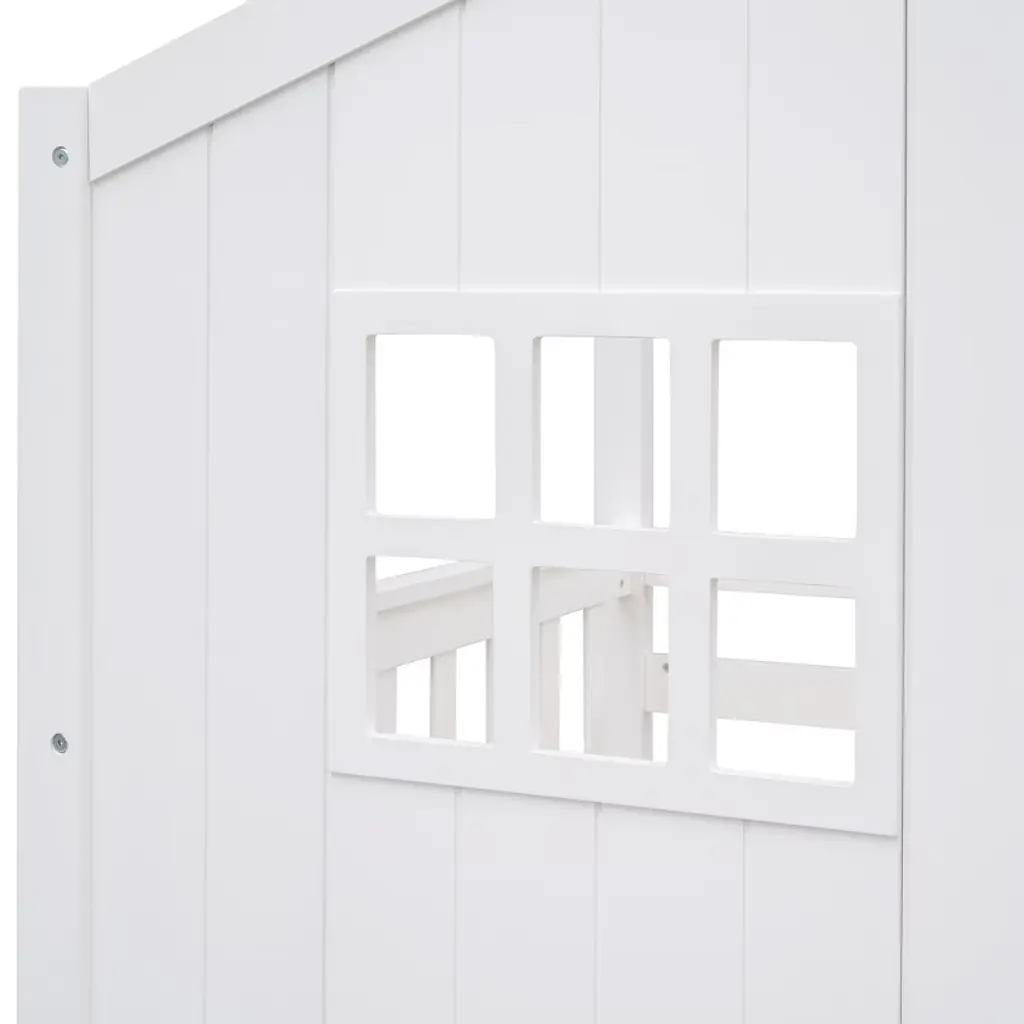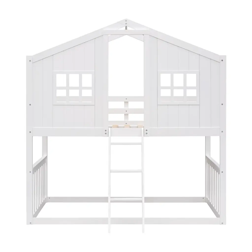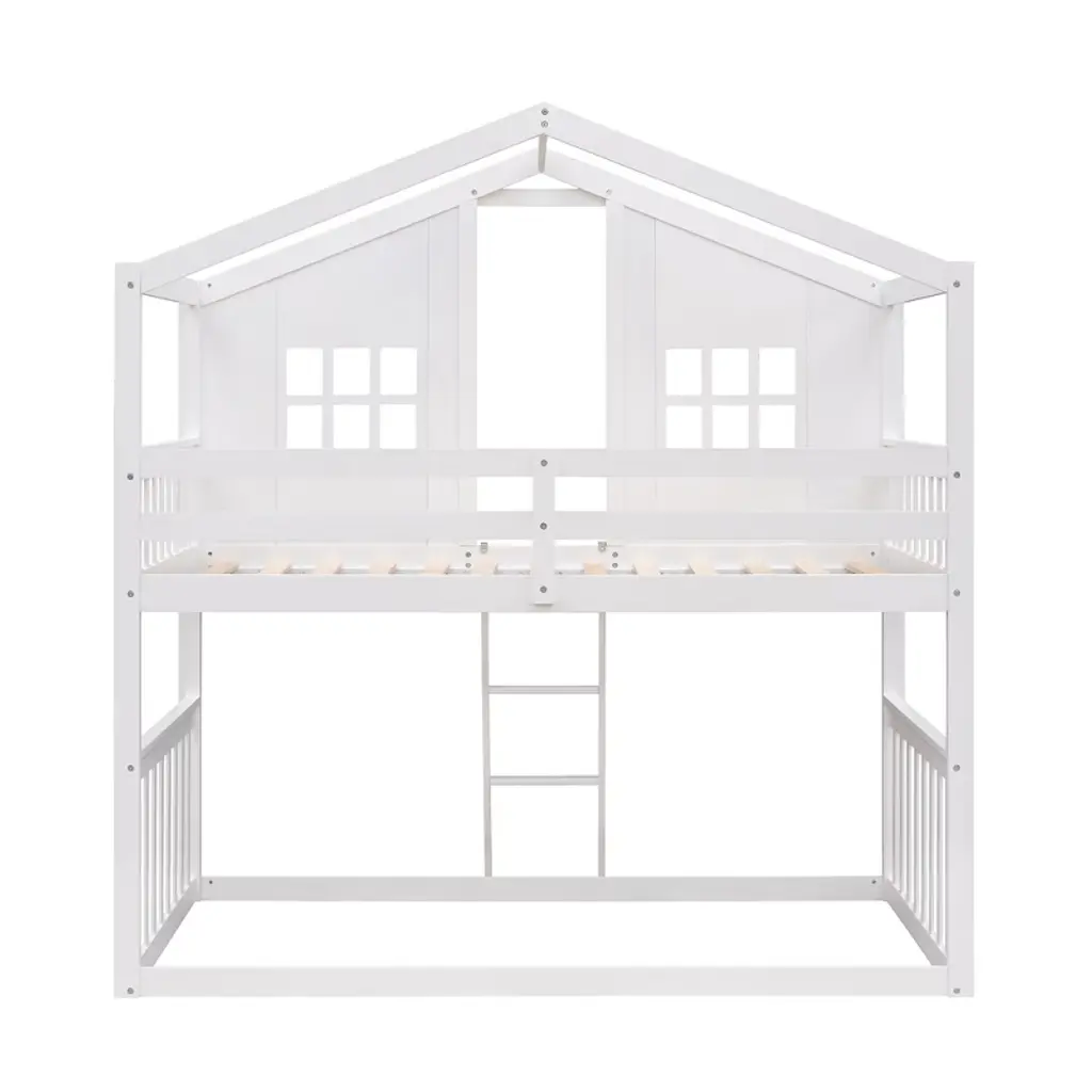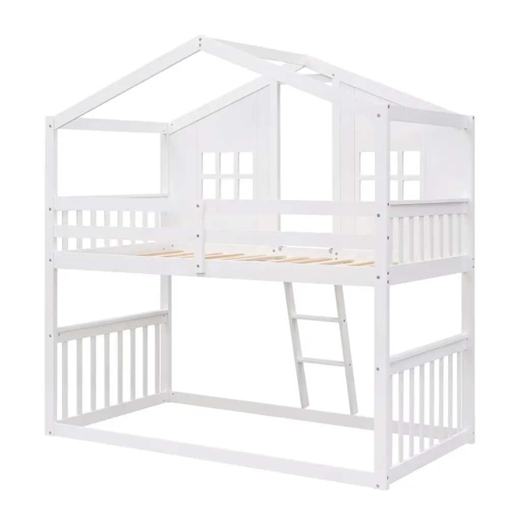 House Bed Bunk Beds Twin Over Twin Size Bunk Beds With Ladder Wood Low Bunk Beds With Roof And Guard Rail For Kids, White