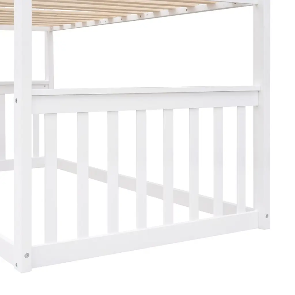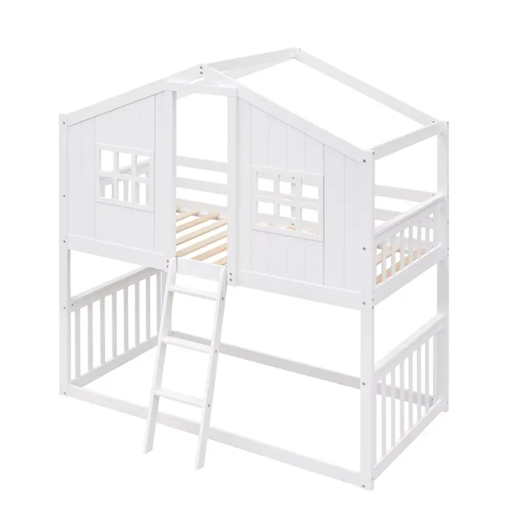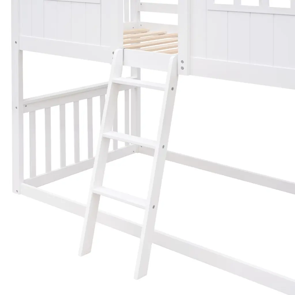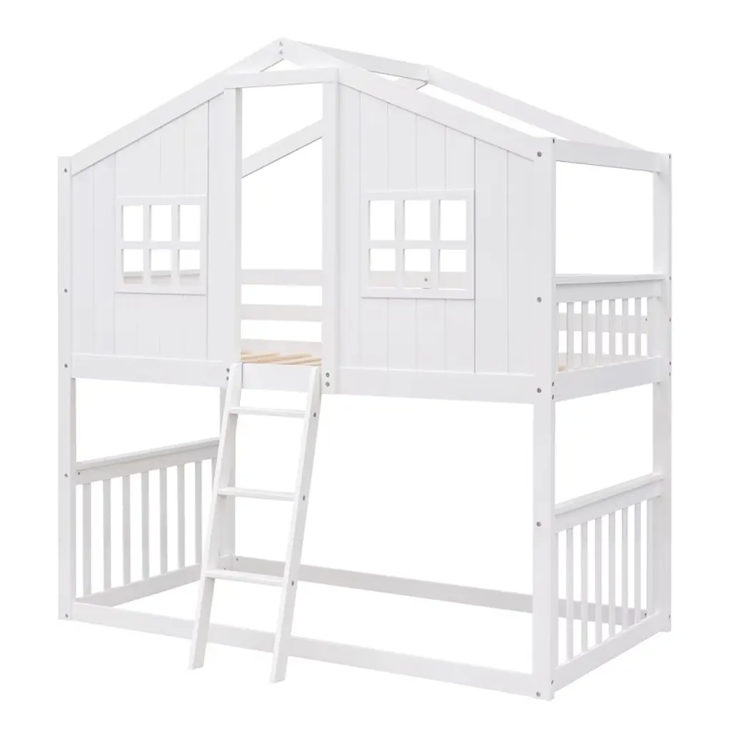 House Bed Bunk Beds Twin Over Twin Size Bunk Beds With Ladder Wood Low Bunk Beds With Roof And Guard Rail For Kids, White