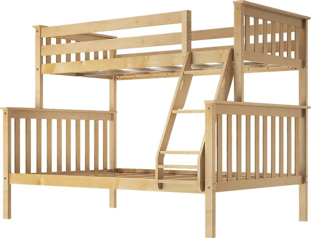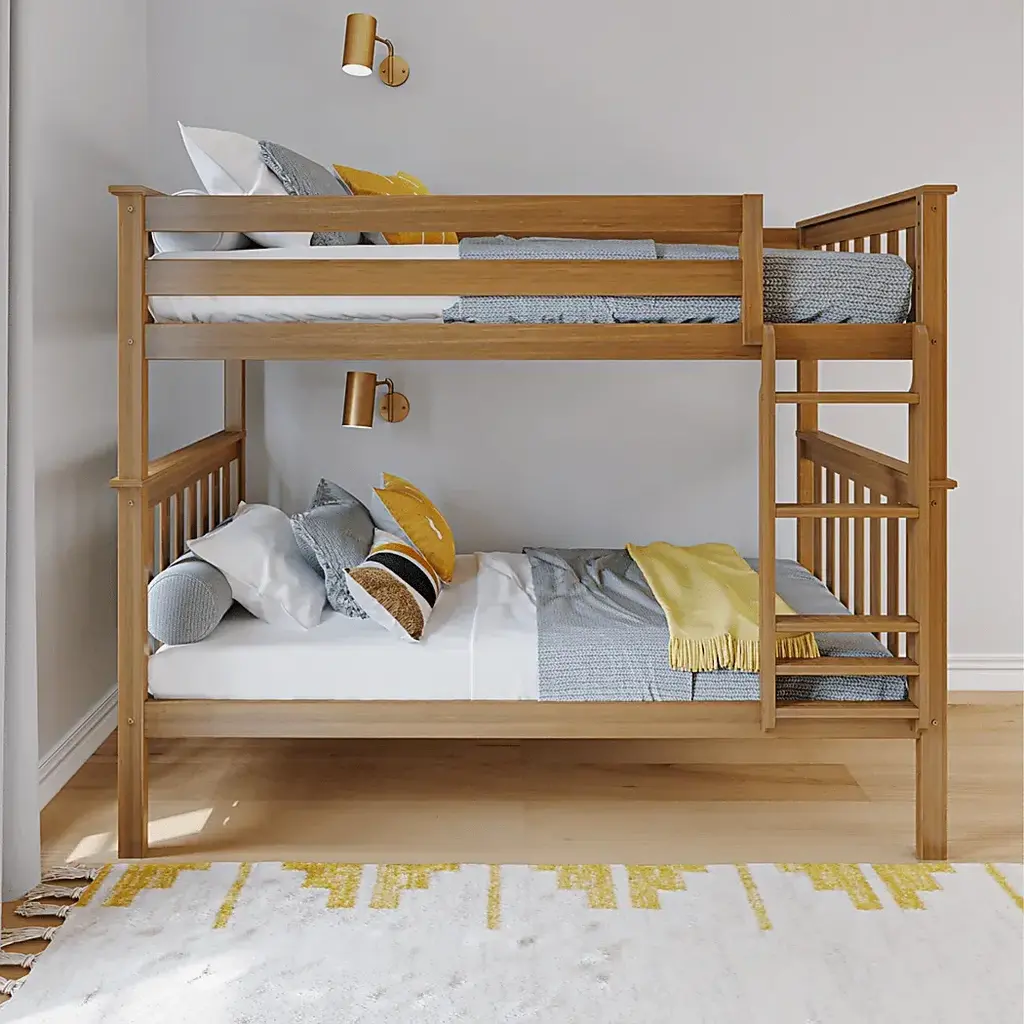 The Lilose Twin Over Twin Bunk Bed makes bedtime both fun and functional for kids. Crafted from solid, knot-free wood with a durable, low VOC finish, it's built strong. The top bunk includes extra-tall 14-inch guardrails for added safety, fitting standard twin mattresses with ease. A reversible angled ladder with rounded edges makes climbing up and down safe, simple, and kid-friendly. With modern slatted headboards, footboards, and flush, color-matched hardware, this bunk bed has a sleek look parents will love. Each bunk supports up to 400 pounds with solid plywood slats and a reinforced metal bar. Designed to save space without sacrificing comfort, this bed requires no box spring . Customer assembly is required.