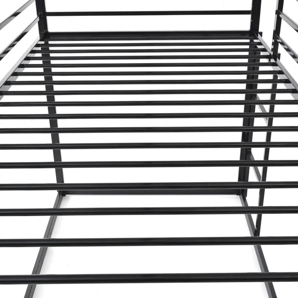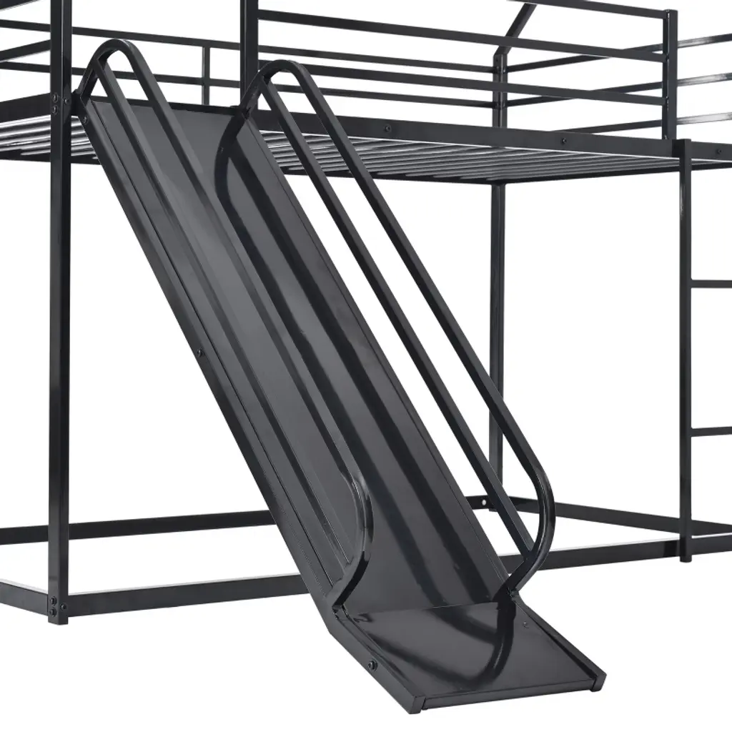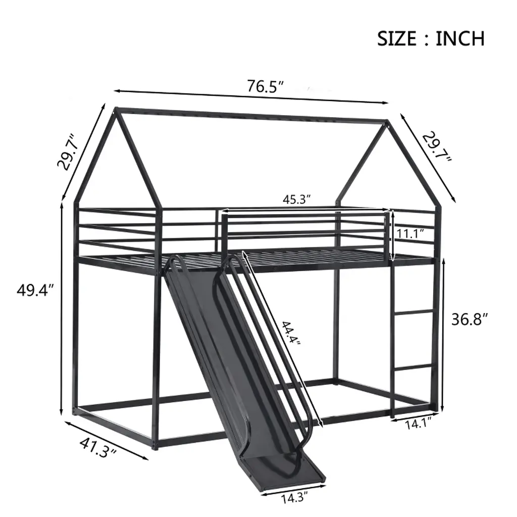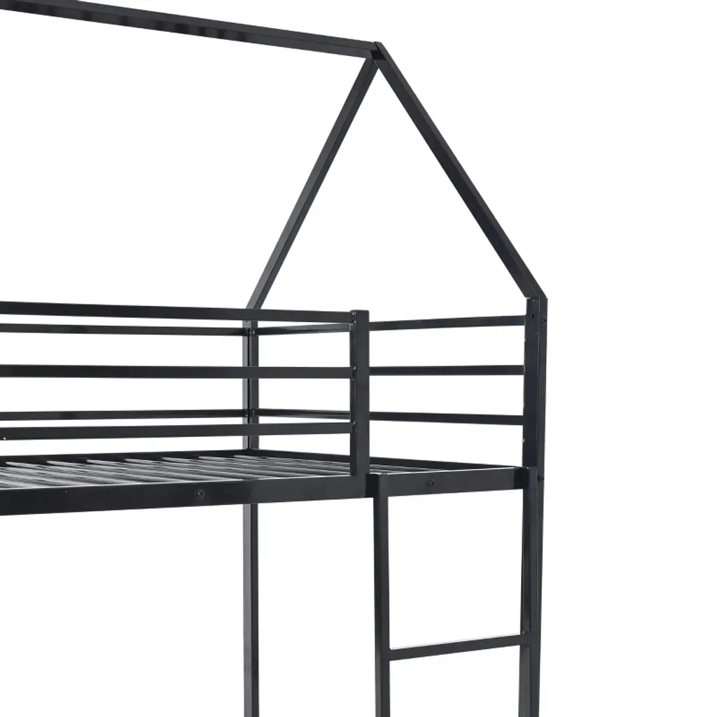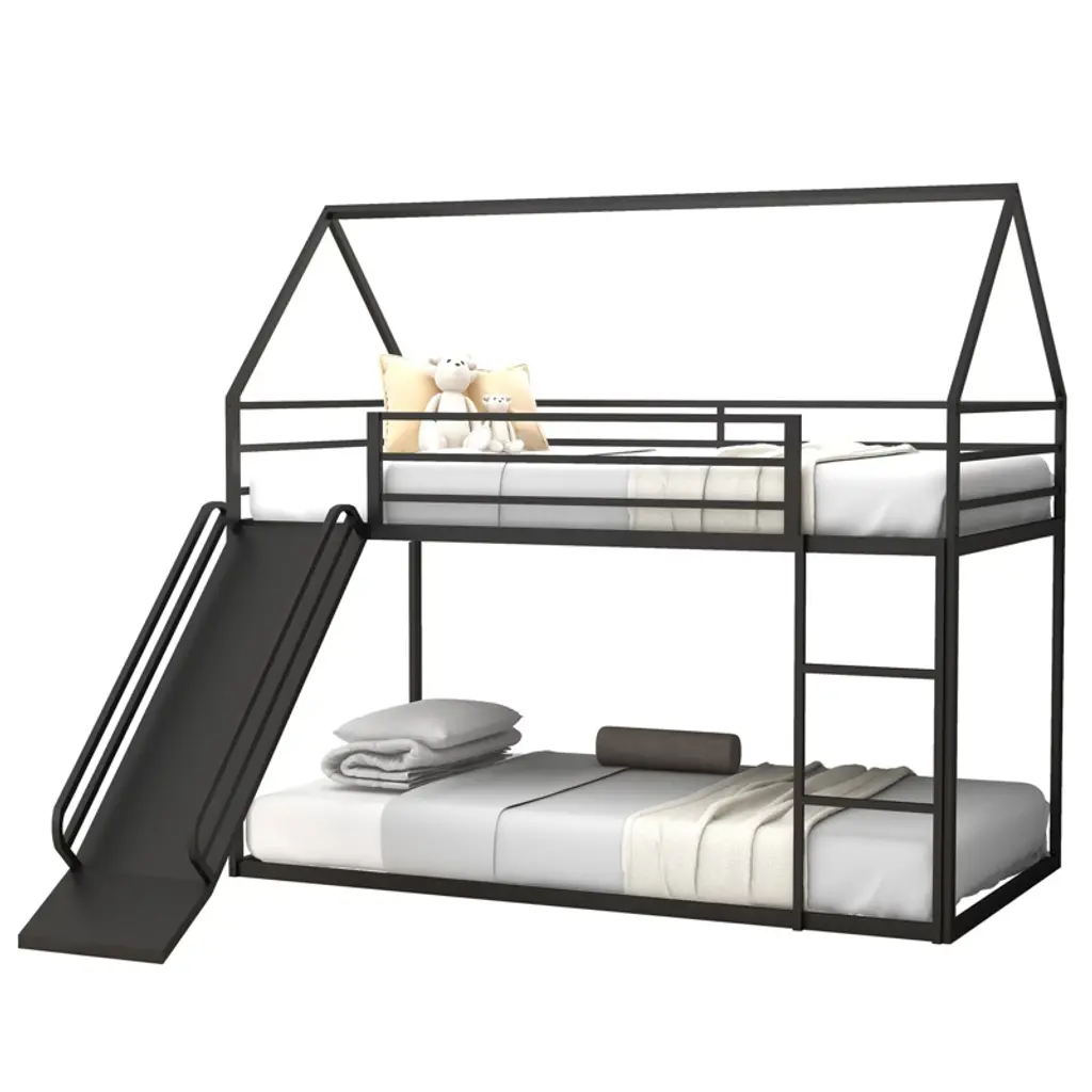 Create a fun and functional bedroom with this metal house-shaped twin over twin bunk bed. Built with a sturdy powder-coated metal frame and thick square tubes, it ensures safe and durable use. Featuring a playful slide and ladder with interchangeable positions, it turns bedtime into an adventure. The cozy triangle roof design offers a private space for sleep and play, while the twin-over-twin layout maximizes space for siblings or guests.