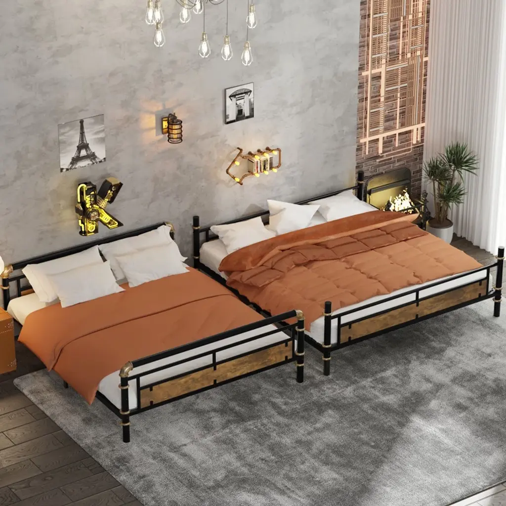 This versatile metal bunk bed offers a convertible design, allowing you to use it as a full-over-full bunk bed for space-saving or split it into two full-size beds to suit your needs. Ideal for maximizing space in kids' rooms, guest rooms, or dormitories, it features a 3-step ladder with non-slip foam padding on each step for added safety and comfort. The smooth metal frame, rounded edges, and vintage wood and gold accents create a stylish yet functional piece that fits seamlessly into any room decor. The 15.9-inch high guardrails provide added security, while the 8.1-inch under-bed storage expands your space. Crafted from high-quality metal and MDF, this bed supports up to 350 lbs per bed. Dimensions: 77.7” x 56.5” x 66” (L x W x H), with a weight capacity of 350 lbs for each bed. No box spring required, and recommended mattress thickness is 6 inches for the upper bed and 8 inches for the bottom.