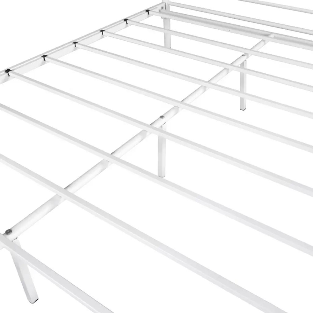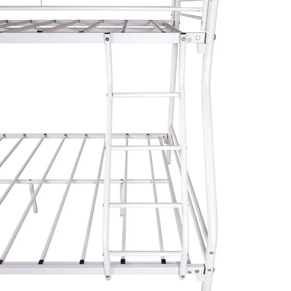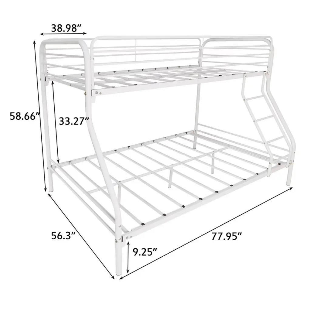 This heavy-duty twin-over-full metal bunk bed is perfect for saving space while offering comfort and safety. The sturdy metal frame comes with reinforced slats and side rails, ensuring durability and stability for long-lasting use. With a stylish powder-coated finish, it’ll look great in any bedroom while supporting up to 250 lbs on the top bunk and 350 lbs on the bottom.The top bunk is equipped with 12.8” safety guard rails, keeping your child safe from falling off while they sleep or play. And for easy access, the inclined ladder is designed for convenience, making it easier for kids to climb up and down.This bunk bed also features a platform metal design, so you don’t need a box spring, and you get valuable storage space under the bed. Whether you need to store toys, quilts, or extra clothes, it’s got you covered. Plus, with simple assembly instructions and all parts clearly labeled, setting it up is a breeze. It’s sturdy, space-saving, and comes with after-sales service, so you can buy with confidence!