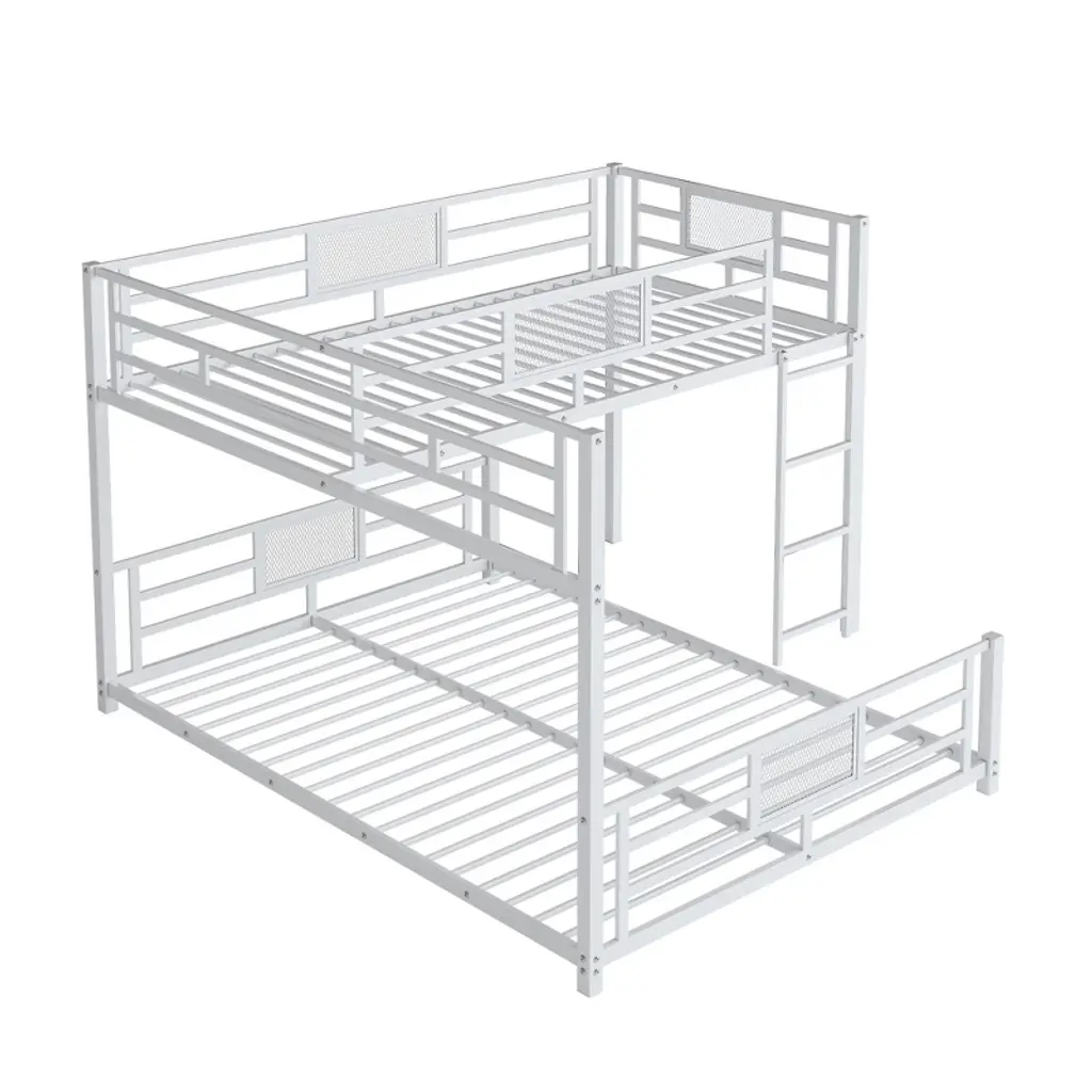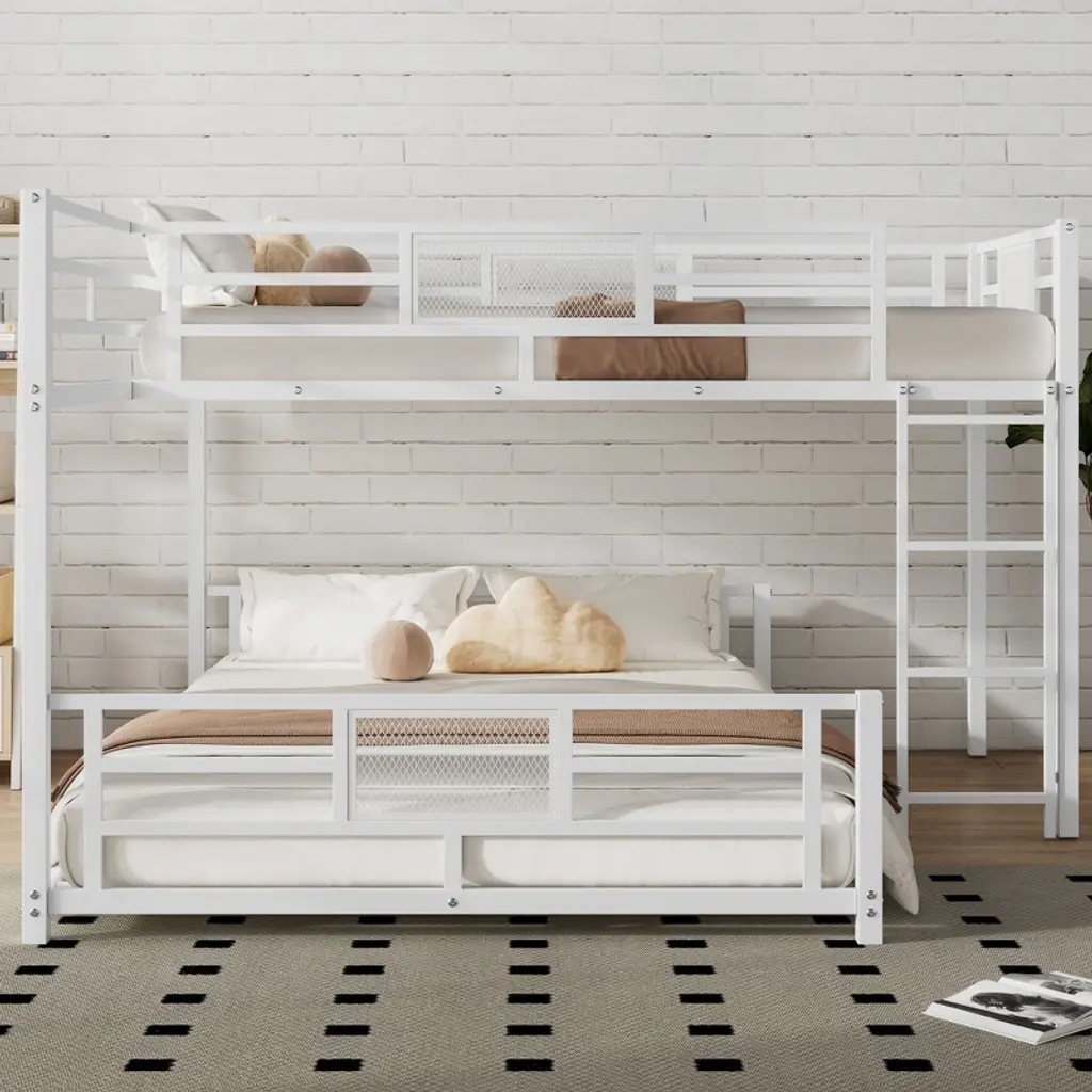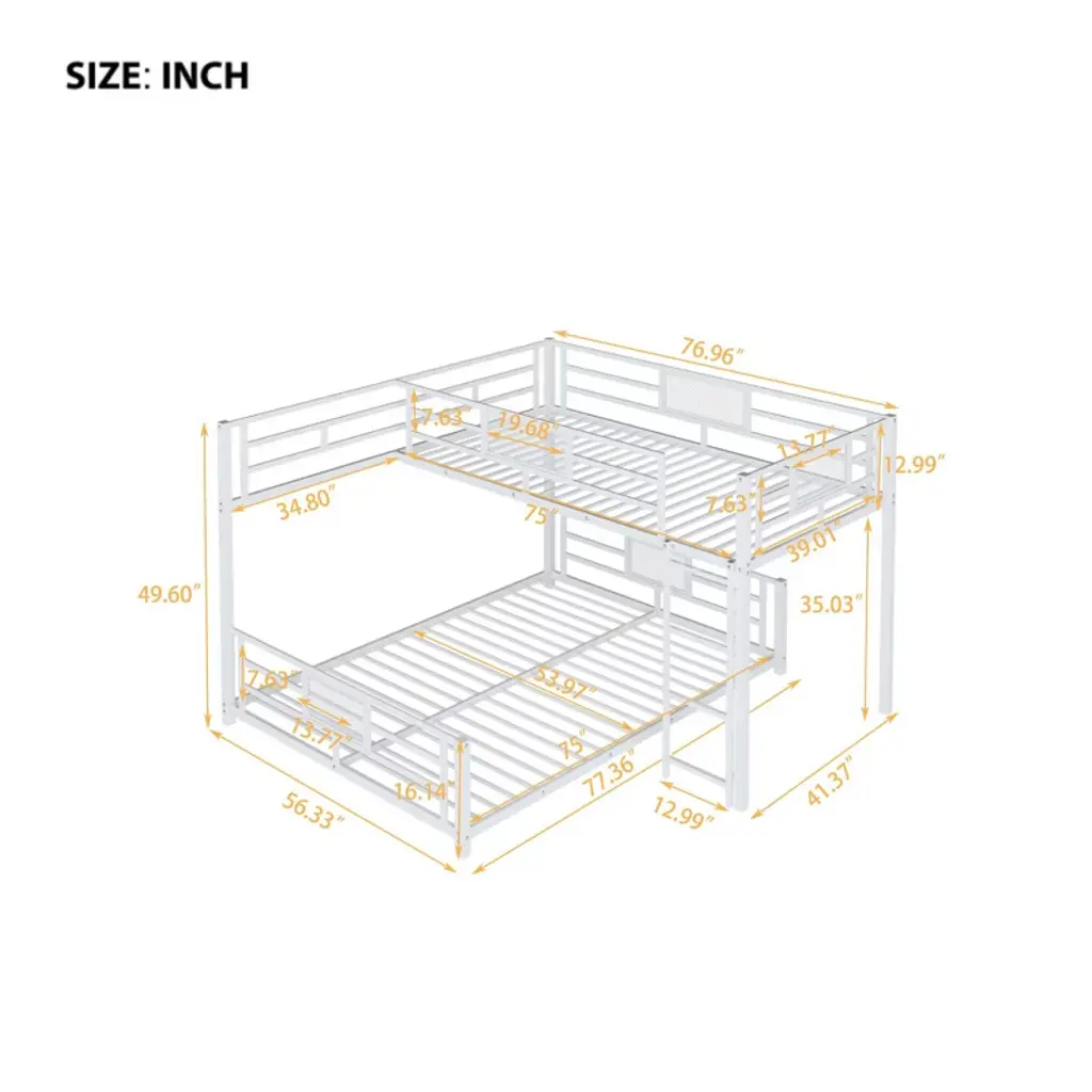 This L-Shaped Metal Twin Over Full Bunk Bed offers both elegance and functionality, making it a perfect addition to any room. Crafted with a high-quality metal frame, this bed is built to last, ensuring strong stability and durability. The space-saving design allows for customization of the area underneath, offering extra room for storage or play, making it ideal for dorms, guest rooms, or any space with limited floor area. The solid metal slats provide excellent mattress support and eliminate the need for a box spring, while also extending the mattress's lifespan. Equipped with full-length guardrails for added safety, this bed ensures secure sleep. The bed is easy to assemble with clear instructions and all necessary tools included. Dimensions: 76.96"L x 77.36"W x 49.6"H. Weight Capacity: 250 lbs for the upper bed, 350 lbs for the lower bed. Recommended Mattress Thickness: 6" for both beds.