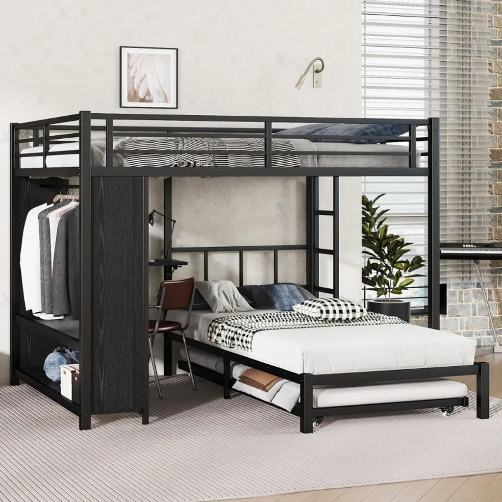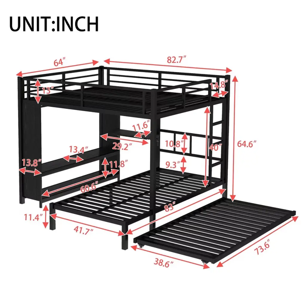 This Metal Bunk Bed with Built-in Closet, Trundle, and Folding Desk is the ultimate space-saving solution for families with multiple children or for use in guest rooms and dormitories. The unique stowable trundle design allows for easy storage under the bed when not in use, optimizing bedroom space. The large built-in closet is perfect for organizing clothes or loungewear, transforming this bed into a multifunctional living space. Additionally, the foldable desk provides a convenient study or reading area, while saving space when folded away. Constructed with a heavy-duty metal frame and reinforced slats, this bunk bed offers excellent support without needing a box spring. The bed features a rust-resistant coating for durability, while full-length guardrails and a stable ladder ensure safety for the top bunk. Dimensions: 82.7"L x 83"W x 64.6"H. Weight Capacity: Queen (top) 250 lbs; Twin (bottom) 350 lbs. Assembly Required: Full assembly needed with clear instructions included.